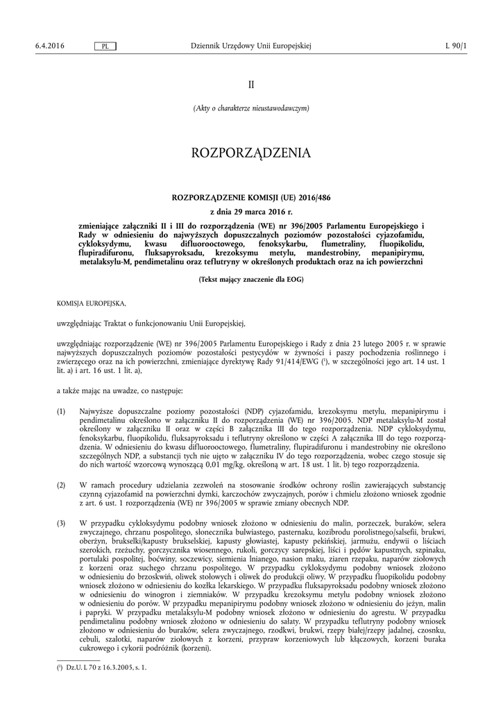 6.4.2016 Dziennik Urzędowy Unii Europejskiej PL L 90/1 II (Akty o charakterze nieustawodawczym) ROZPORZĄDZENIA ROZPORZĄDZENIE KOMISJI (UE) 2016/486 z dnia 29 marca 2016 r. zmieniające załączniki II i III do rozporządzenia (WE) nr 396/2005 Parlamentu Europejskiego i Rady w odniesieniu do najwyższych dopuszczalnych poziomów pozostałości cyjazofamidu, cykloksydymu, kwasu difluorooctowego, fenoksykarbu, flumetraliny, fluopikolidu, flupiradifuronu, fluksapyroksadu, krezoksymu metylu, mandestrobiny, mepanipirymu, metalaksylu-M, pendimetalinu oraz teflutryny w określonych produktach oraz na ich powierzchni (Tekst mający znaczenie dla EOG) KOMISJA EUROPEJSKA, uwzględniając Traktat o funkcjonowaniu Unii Europejskiej, uwzględniając rozporządzenie (WE) nr 396/2005 Parlamentu Europejskiego i Rady z dnia 23 lutego 2005 r. w sprawie najwyższych dopuszczalnych poziomów pozostałości pestycydów w żywności i paszy pochodzenia roślinnego i zwierzęcego oraz na ich powierzchni, zmieniające dyrektywę Rady 91/414/EWG (1), w szczególności jego art. 14 ust. 1 lit. a) i art. 16 ust. 1 lit. a), a także mając na uwadze, co następuje: (1) Najwyższe dopuszczalne poziomy pozostałości (NDP) cyjazofamidu, krezoksymu metylu, mepanipirymu i pendimetalinu określono w załączniku II do rozporządzenia (WE) nr 396/2005. NDP metalaksylu-M został określony w załączniku II oraz w części B załącznika III do tego rozporządzenia. NDP cykloksydymu, fenoksykarbu, fluopikolidu, fluksapyroksadu i teflutryny określono w części A załącznika III do tego rozporzą dzenia. W odniesieniu do kwasu difluorooctowego, flumetraliny, flupiradifuronu i mandestrobiny nie określono szczególnych NDP, a substancji tych nie ujęto w załączniku IV do tego rozporządzenia, wobec czego stosuje się do nich wartość wzorcową wynoszącą 0,01 mg/kg, określoną w art. 18 ust. 1 lit. b) tego rozporządzenia. (2) W ramach procedury udzielania zezwoleń na stosowanie środków ochrony roślin zawierających substancję czynną cyjazofamid na powierzchni dymki, karczochów zwyczajnych, porów i chmielu złożono wniosek zgodnie z art. 6 ust. 1 rozporządzenia (WE) nr 396/2005 w sprawie zmiany obecnych NDP. (3) W przypadku cykloksydymu podobny wniosek złożono w odniesieniu do malin, porzeczek, buraków, selera zwyczajnego, chrzanu pospolitego, słonecznika bulwiastego, pasternaku, kozibrodu porolistnego/salsefii, brukwi, oberżyn, brukselki/kapusty brukselskiej, kapusty głowiastej, kapusty pekińskiej, jarmużu, endywii o liściach szerokich, rzeżuchy, gorczycznika wiosennego, rukoli, gorczycy sarepskiej, liści i pędów kapustnych, szpinaku, portulaki pospolitej, boćwiny, soczewicy, siemienia lnianego, nasion maku, ziaren rzepaku, naparów ziołowych z korzeni oraz suchego chrzanu pospolitego. W przypadku cykloksydymu podobny wniosek złożono w odniesieniu do brzoskwiń, oliwek stołowych i oliwek do produkcji oliwy. W przypadku fluopikolidu podobny wniosek złożono w odniesieniu do kozłka lekarskiego. W przypadku fluksapyroksadu podobny wniosek złożono w odniesieniu do winogron i ziemniaków. W przypadku krezoksymu metylu podobny wniosek złożono w odniesieniu do porów. W przypadku mepanipirymu podobny wniosek złożono w odniesieniu do jeżyn, malin i papryki. W przypadku metalaksylu-M podobny wniosek złożono w odniesieniu do agrestu. W przypadku pendimetalinu podobny wniosek złożono w odniesieniu do sałaty. W przypadku teflutryny podobny wniosek złożono w odniesieniu do buraków, selera zwyczajnego, rzodkwi, brukwi, rzepy białej/rzepy jadalnej, czosnku, cebuli, szalotki, naparów ziołowych z korzeni, przypraw korzeniowych lub kłączowych, korzeni buraka cukrowego i cykorii podróżnik (korzeni). (1) Dz.U. L 70 z 16.3.2005, s. 1. L 90/2 PL Dziennik Urzędowy Unii Europejskiej 6.4.2016 (4) Zgodnie z art. 8 rozporządzenia (WE) nr 396/2005 wnioski te zostały poddane ocenie przez państwa członkowskie, których dotyczyły, a sprawozdania z oceny przekazano Komisji. (5) Europejski Urząd ds. Bezpieczeństwa Żywności, zwany dalej „Urzędem”, dokonał oceny wniosków i sprawozdań z oceny, analizując w szczególności ryzyko dla konsumentów oraz, w odpowiednich przypadkach, dla zwierząt, i wydał uzasadnione opinie dotyczące proponowanych NDP (1). Urząd przekazał te opinie Komisji i państwom członkowskim oraz podał je do publicznej wiadomości. (6) W uzasadnionych opiniach Urząd stwierdził, że w odniesieniu do stosowania cyjazofamidu na powierzchni dymki, karczochów zwyczajnych i porów nie można wykluczyć ryzyka dla konsumentów. W odniesieniu do stosowania cykloksydymu na powierzchni rzeżuchy, gorczycznika wiosennego, rukoli, gorczycy sarepskiej, liści i pędów kapustnych, soczewicy, siemienia lnianego i nasion maku przedłożone dane nie były wystarczające jako podstawa do określenia nowych NDP. Należy zatem utrzymać obecne NDP. (7) W odniesieniu do wszystkich pozostałych wniosków Urząd stwierdził, że spełniono wszystkie wymogi dotyczące danych oraz że zmiany NDP, o które wystąpili wnioskodawcy, są dopuszczalne z punktu widzenia bezpie czeństwa konsumentów na podstawie oceny narażenia konsumentów przeprowadzonej dla 27 określonych grup konsumentów w Europie. Urząd wziął pod uwagę najnowsze informacje na temat właściwości toksykologicznych wymienionych substancji. Ani w przypadku długotrwałego narażenia na przedmiotowe substancje w wyniku spożywania wszystkich produktów spożywczych mogących je zawierać, ani w przypadku narażenia krótkotermi nowego w wyniku dużej konsumpcji odnośnych uprawianych roślin i produktów nie wykazano istnienia ryzyka przekroczenia dopuszczalnego dziennego spożycia ani ostrej dawki referencyjnej. (8) W odniesieniu do flumetraliny, flupiradifuronu i mandestrobiny Urząd przedstawił wnioski z wzajemnych weryfikacji oceny ryzyka stwarzanego przez pestycydy, dotyczących tych substancji czynn