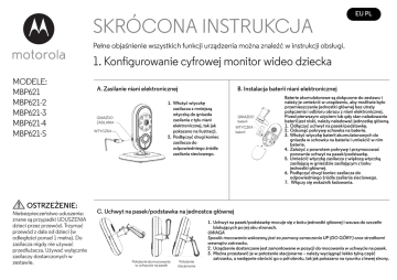 EU PL SKRÓCONA INSTRUKCJA Pełne objaśnienie wszystkich funkcji urządzenia można znaleźć w instrukcji obsługi. 1. Konfigurowanie cyfrowej monitor wideo dziecka MODELE: MBP621 MBP621-2 MBP621-3 MBP621-4 MBP621-S OSTRZEŻENIE: Niebezpieczeństwo uduszenia: znane są przypadki UDUSZENIA dzieci przez przewód. Trzymać przewód z dala od dzieci (w odległości ponad 1 metra). Do zasilacza nigdy nie używać przedłużacza. Używać wyłącznie zasilaczy dostarczonych w zestawie. A. Zasilanie niani elektronicznej GNIAZDO ZASILANIA WTYCZKA B. Instalacja baterii niani elektronicznej 1. Włożyć wtyczkę zasilacza z mniejszą wtyczką do gniazda zasilania z tyłu niani elektronicznej, tak jak pokazano na ilustracji. 2. Podłączyć drugi koniec zasilacza do odpowiedniego źródła zasilania sieciowego. GNIAZDO baterii WTYCZKA baterii Baterie akumulatorowe są dołączone do zestawu i należy je umieścić w urządzeniu, aby możliwie było przemieszczanie jednostki głównej bez utraty połączenia i odbioru obrazu z niani elektronicznej. Przed pierwszym użyciem lub gdy stan naładowania baterii jest niski, należy naładować jednostkę główną. 1. Odłączyć uchwyt na pasek/podstawkę. 2. Odsunąć pokrywę schowka na baterie. 3. Włożyć wtyczkę baterii akumulatorowych do gniazda w schowku na baterie i umieścić w nim baterie. 4. Założyć z powrotem pokrywę i przymocować ponownie uchwyt na pasek/podstawkę. 5. Umieścić wtyczkę zasilacza z większą wtyczką zasilającą w gnieździe zasilającym z boku jednostki głównej. 6. Podłączyć drugi koniec zasilacza do odpowiedniego źródła zasilania sieciowego. 7. Włączy się wskaźnik ładowania. C. Uchwyt na pasek/podstawka na jednostce głównej Położenie do mocowania w uchwycie na pasek Położenie stacjonarne 1. Uchwyt na pasek/podstawkę mocuje się z boku jednostki głównej i wsuwa do szczelin blokujących po jej obu stronach. UWAGA Sposób mocowania wskazany jest za pomocą oznaczenia UP (DO GÓRY) oraz strzałkami wewnątrz zatrzasku. 2. Urządzenie dostarczane jest zamontowane w pozycji do mocowania w uchwycie na pasek. 3. Można przestawić je w położenie stacjonarne – należy wyciągnąć lekko tylną część zatrzasku, a następnie obrócić go o pół obrotu, tak jak pokazano na rysunku z lewej strony. 2. Wyjaśnienie znaczenia ikon na wyświetlaczu EU PL Jednostka główna Status połączenia Widok stanu bieżącego Zoom Wyłączona głośność 16oC wyświetlany, gdy wykryty zostanie silny sygnał połączenia między nianią elektroniczną a jednostką główną. lub wyświetlany, gdy wykryty zostanie średniej mocy sygnał połączenia między nianią elektroniczną a jednostką główną. wyświetlany, gdy połączenie między nianią elektroniczną a jednostką główną zostanie zerwane. wyświetlany, gdy jednostka główna szuka niani elektronicznej. , Wyświetla numer obserwowanej niani elektronicznej. Wyświetlany, gdy kamera w niani elektronicznej ustawiona jest w trybie zbliżenia. Wyświetlany, gdy głośność jest wyłączona. Aktywacja dźwiękiem Funkcję aktywacji dźwiękiem można włączyć lub wyłączyć. Aby na bieżąco monitorować dźwięk w pokoju dziecka, należy włączyć tę funkcję. Wyświetlany, gdy aktywacja dźwiękiem jest włączona. Gdy niania elektroniczna wykryje dźwięki w pokoju dziecka, na jednostce głównej wyświetlany jest obraz dziecka. Bieżąca temperatura Wyświetla bieżącą temperaturę w pomieszczeniu, w którym znajduje się niania elektroniczna. Wybór kamery przewijany, gdy baterie ładują się; wyświetlany, gdy baterie są w pełni naładowane; wyświetlany, gdy stan baterii jest niski i wymagają naładowania; wyświetlany, gdy baterie nie są włożone, a urządzenie pracuje na zasilaczu lub gdy baterie zostały włożone nieprawidłowo. Można wybrać ekran do przeglądania obrazów z konkretnej niani lub oglądać obrazy ze wszystkich niań w trybie skanowania. Jasność Można zmienić jasność ekranu. Stan baterii Czułość Parowanie Można zmienić czułość reakcji na dźwięk niani elektronicznej. Im większy poziom, tym większa czułość reakcji na dźwięk i przesyłania sygnału do jednostki głównej przez nianię elektroniczną. Fabrycznie wszystkie nianie elektroniczne są już sparowane z jednostką główną. Nianie elektroniczne można dodawać lub usuwać. 3. Informacje ogólne Jeśli produkt nie działa prawidłowo... 1. 2. Przeczytaj tę skróconą instrukcję lub instrukcję obsługi. Skontaktuj się z serwisem: +49 (0) 1805 938 802 w Europie E-mail: [email protected] Urządzenie jest produkowane, rozprowadzane i sprzedawane przez firmę Binatone Electronics International LTD., która posiada oficjalną licencję na ten produkt. MOTOROLA i logo stylizowanej litery M są znakami towarowymi lub zarejestrowanymi znakami towarowymi firmy Motorola Trademark Holdings, LLC. i są używane na licencji. Wszystkie pozostałe znaki towarowe są własnością ich odpowiednich właścicieli. © 2015 Motorola Mobility LLC. Wszelkie prawa zastrzeżone. Wydrukowano w Chinach EU_PL Wersja 1.0