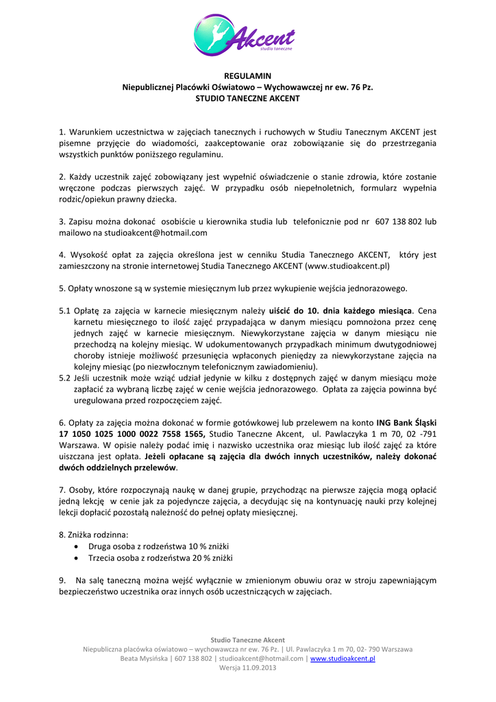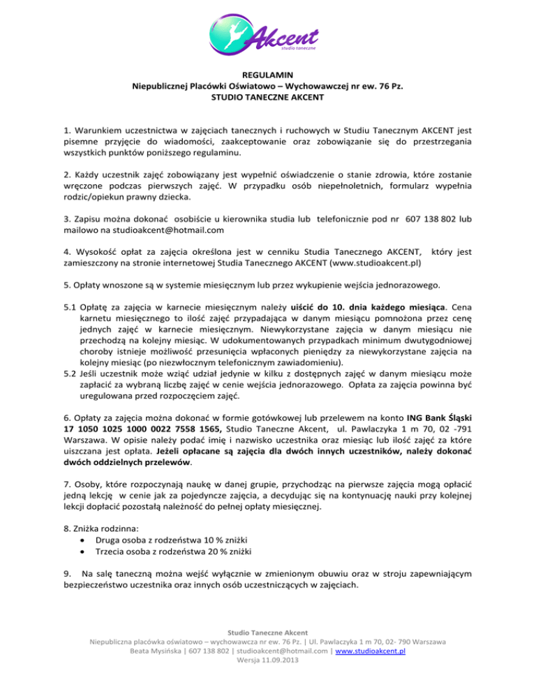 REGULAMIN Niepublicznej Placówki Oświatowo – Wychowawczej nr ew. 76 Pz. STUDIO TANECZNE AKCENT 1. Warunkiem uczestnictwa w zajęciach tanecznych i ruchowych w Studiu Tanecznym AKCENT jest pisemne przyjęcie do wiadomości, zaakceptowanie oraz zobowiązanie się do przestrzegania wszystkich punktów poniższego regulaminu. 2. Każdy uczestnik zajęć zobowiązany jest wypełnić oświadczenie o stanie zdrowia, które zostanie wręczone podczas pierwszych zajęć. W przypadku osób niepełnoletnich, formularz wypełnia rodzic/opiekun prawny dziecka. 3. Zapisu można dokonać osobiście u kierownika studia lub telefonicznie pod nr 607 138 802 lub mailowo na [email protected] 4. Wysokość opłat za zajęcia określona jest w cenniku Studia Tanecznego AKCENT, który jest zamieszczony na stronie internetowej Studia Tanecznego AKCENT (www.studioakcent.pl) 5. Opłaty wnoszone są w systemie miesięcznym lub przez wykupienie wejścia jednorazowego. 5.1 Opłatę za zajęcia w karnecie miesięcznym należy uiścić do 10. dnia każdego miesiąca. Cena karnetu miesięcznego to ilość zajęć przypadająca w danym miesiącu pomnożona przez cenę jednych zajęć w karnecie miesięcznym. Niewykorzystane zajęcia w danym miesiącu nie przechodzą na kolejny miesiąc. W udokumentowanych przypadkach minimum dwutygodniowej choroby istnieje możliwość przesunięcia wpłaconych pieniędzy za niewykorzystane zajęcia na kolejny miesiąc (po niezwłocznym telefonicznym zawiadomieniu). 5.2 Jeśli uczestnik może wziąć udział jedynie w kilku z dostępnych zajęć w danym miesiącu może zapłacić za wybraną liczbę zajęć w cenie wejścia jednorazowego. Opłata za zajęcia powinna być uregulowana przed rozpoczęciem zajęć. 6. Opłaty za zajęcia można dokonać w formie gotówkowej lub przelewem na konto ING Bank Śląski 17 1050 1025 1000 0022 7558 1565, Studio Taneczne Akcent, ul. Pawlaczyka 1 m 70, 02 -791 Warszawa. W opisie należy podać imię i nazwisko uczestnika oraz miesiąc lub ilość zajęć za które uiszczana jest opłata. Jeżeli opłacane są zajęcia dla dwóch innych uczestników, należy dokonać dwóch oddzielnych przelewów. 7. Osoby, które rozpoczynają naukę w danej grupie, przychodząc na pierwsze zajęcia mogą opłacić jedną lekcję w cenie jak za pojedyncze zajęcia, a decydując się na kontynuację nauki przy kolejnej lekcji dopłacić pozostałą należność do pełnej opłaty miesięcznej. 8. Zniżka rodzinna: • Druga osoba z rodzeństwa 10 % zniżki • Trzecia osoba z rodzeństwa 20 % zniżki 9. Na salę taneczną można wejść wyłącznie w zmienionym obuwiu oraz w stroju zapewniającym bezpieczeństwo uczestnika oraz innych osób uczestniczących w zajęciach. Studio Taneczne Akcent Niepubliczna placówka oświatowo – wychowawcza nr ew. 76 Pz. | Ul. Pawlaczyka 1 m 70, 02- 790 Warszawa Beata Mysińska | 607 138 802 | [email protected] | www.studioakcent.pl Wersja 11.09.2013 10. W sytuacjach losowych kierownik Studia Tanecznego AKCENT ma prawo do odwołania zajęć. Zostaną one przeprowadzone w innym terminie ustalonym z uczestnikami. 11. Za przedmioty wartościowe pozostawione na terenie obiektu, w którym są prowadzone zajęcia Studia Tanecznego AKCENT, Studio nie ponosi odpowiedzialności. 12. Osoby przebywające na terenie obiektu w którym prowadzone są zajęcia Studia Tanecznego AKCENT zobowiązane są do przestrzegania przepisów BHP i Przeciwpożarowych obowiązujących w tym obiekcie oraz do zachowania czystości i poszanowania mienia. 13. Odpowiedzialność finansową za usunięcie ewentualnych szkód poczynionych przez uczestnika zajęć ponosi on sam lub w przypadku osób niepełnoletnich jego rodzic/opiekun prawny. 14. Studio Taneczne AKCENT nie ubezpiecza uczestników zajęć od nieszczęśliwych wypadków, ani nie ponosi odpowiedzialności za nieszczęśliwe wypadki powstałe bez winy Studia i osób działających w jego imieniu. 15. Każdy uczestnik lub w przypadku osób niepełnoletnich rodzic/opiekun prawny uczestnika wyraża zgodę na nieodpłatne wykorzystywanie jego wizerunku na potrzeby promocji zdjęć i filmów z zajęć oraz imprez z udziałem Studia Tanecznego AKCENT (np. zamieszczanie zdjęć/filmów z zajęć, występów, obozów na stronie internetowej Studia). 16. Uczestnik lub w przypadku osób niepełnoletnich rodzic/opiekun prawny wyraża zgodę na przetwarzanie danych osobowych zgodnie z Ustawą o Ochronie Danych Osobowych z dnia 29 sierpnia 1997 roku. Dz. U. Nr 133 poz. 883 na potrzeby działalności Studia Tanecznego AKCENT. 17. Uczestnik zobowiązuje się do poszanowania praw i godności pracowników i innych uczestników zajęć tanecznych. 18. Kierownik Studia Tanecznego AKCENT zastrzega sobie prawo do wnoszenia zmian w Regulaminie. Aktualny Statut i Regulamin niepublicznej placówki oświatowo wychowawczej Studio Taneczne Akcent znajdują się na stronie internetowej Studia (www.studioakcent.pl). 19. Osoby uczęszczające na Dance Fitness dla Kobiet powinny zapoznać się z odrębnym regulaminem zajęć dla dorosłych dostępnym na www.studioakcent.pl 20. Wszystkie sprawy nieobjęte niniejszym regulaminem są regulowane bezpośrednio przez kierownika Studia Tanecznego AKCENT. Studio Taneczne Akcent Niepubliczna placówka oświatowo – wychowawcza nr ew. 76 Pz. | Ul. Pawlaczyka 1 m 70, 02- 790 Warszawa Beata Mysińska | 607 138 802 | [email protected] | www.studioakcent.pl Wersja 11.09.2013