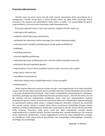 Przyczyny zaburzeń mowy Dziecko musi się uczyć mowy tak jak wielu innych sprawności, które przeradzają się w umiejętności. Poziom mowy bywa u dzieci bardzo różny. Są takie, które zaczynają mówić wcześnie i ich wymowa jest prawidłowa i takie, które w wieku 7 lat wypowiadają się jeszcze nieprawidłowo, a ich mowa jest niewyraźna, mało komunikatywna. Przyczyny zaburzeń mowy, w tym wad wymowy, mogą być bardzo różne, np.: – wada zgryzu lub uzębienia, – osłabienie słuchu fizycznego (niedosłuch), – opóźnienie lub zaburzenie słuchu mownego (tzw. słuchu fonematycznego), – mała sprawność narządów artykulacyjnych (warg, języka podniebienia miękkiego), – dysfunkcje połykowe, – przerost migdałka gardłowego, – zaburzenia kinestezji artykulacyjnej (tzn. wzorców ułożeń narządów mownych właściwych dla poszczególnych głosek), – nieprawidłowe wzorce mowy (wadliwa wymowa osób z otoczenia, zbyt szybkie tempo mowy rodziców itp.), – zaniedbania środowiskowe, – zaburzenia między pracą wiązadeł głosowych, a praca narządów artykulacyjnych. Wiele nieprawidłowości wymowy wynika nie tyle z wad organicznych, ile ze złych nawyków. Często sami dorośli, którzy powinni dawać przykład dzieciom, mówią infantylnie, pieszczotliwie – używając zdrobnień lub niechlujnie – zbyt szybko, niedokładnie wymawiają słowa, „połykając” końcówki, posługują się nieprawidłowymi formami gramatycznymi – słowem ich mowa nie jest dla dziecka wzorem. Zapowiedzią problemów może więc być nieprawidłowa budowa anatomiczna aparatu mowy, co wychwycić powinien lekarz już u niemowlęcia. Badania polegają na sprawdzeniu budowy jamy ustnej i wstępnej diagnozie odruchów istotnych dla mówienia (np. odruch ssania). Czasem u małych dzieci zdarza się przerost wędzidełka (ścięgna miedzy językiem a dolnym podniebieniem). Defekt taki w późniejszym okresie niemal zawsze powoduje wadę wymowy. Przyczyną wady mowy może być także uszkodzenie narządu słuchu, nieprawidłowości w obrębie żuchwy, choroby neurologiczne, czynniki dziedziczne, czy wreszcie niższe możliwości intelektualne. Terapia logopedyczna winna być więc kompleksowa i polegać na współpracy wielu odpowiednich specjalistów (np. laryngologa, otolaryngologa, ortodonty, neurologa, czy psychologa). logopeda- A. Małecka
