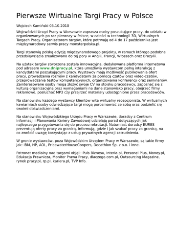 Pierwsze Wirtualne Targi Pracy w Polsce Wojciech Kamiński 05.10.2010 Wojewódzki Urząd Pracy w Warszawie zaprasza osoby poszukujące pracy, do udziału w organizowanych po raz pierwszy w Polsce, w całości w technologii 3D, Wirtualnych Targach Pracy. Organizatorem targów, które potrwają od 4 do 17 października jest międzynarodowy serwis pracy monsterpolska.pl. Targi stanowią polską edycję międzynarodowego projektu, w ramach którego podobne przedsięwzięcia zrealizowano do tej pory w Anglii, Francji, Włoszech oraz Brazylii. Na użytek targów stworzona została innowacyjna, dedykowana platforma internetowa pod adresem www.dnipracy.pl, która umożliwia wystawcom pełną interakcję z kandydatami poszukującymi pracy. Wystawcy mają możliwość publikowania ofert pracy, prowadzenia rozmów z kandydatami za pomocą czatów oraz video-czatów, przeprowadzania testów kompetencyjnych, organizowania konferencji oraz seminariów. Zainteresowane osoby mogą złożyć swoje CV na stoisku pracodawcy, zapoznać się z kulturą organizacyjną oraz wymaganiami na dane stanowisko pracy, obejrzeć filmy reklamowe, posłuchać MP3 czy przejrzeć materiały udostępnione przez pracodawców. Na stanowisku każdego wystawcy klientów wita wirtualny recepcjonista. W wirtualnych kawiarniach osoby odwiedzające targi mogą porozmawiać ze sobą oraz podzielić się swoimi doświadczeniami. Na stanowisku Wojewódzkiego Urzędu Pracy w Warszawie, doradcy z Centrum Informacji i Planowania Kariery Zawodowej udzielają porad dotyczących jak najlepszego przygotowania się do procesu rekrutacji. Natomiast doradcy EURES prezentują oferty pracy za granicą, informują, gdzie i jak szukać pracy za granicą, na co zwrócić uwagę korzystając z usług prywatnych agencji zatrudnienia. W gronie wystawców, poza Wojewódzkim Urzędem Pracy w Warszawie, są takie firmy jak: IBM, HP, AOL, PricewaterHouseCoopers, Decathlon Sp. z o.o. i inne. Patronat medialny nad targami objęli: Puls Biznesu, Interia.pl, Personel Plus, Money.pl, Edukacja Prawnicza, Monitor Prawa Pracy, dlaczego.com.pl, Outsourcing Magazine, rynek pracy.pl, rp.pl, kariera.pl, TVP Info.