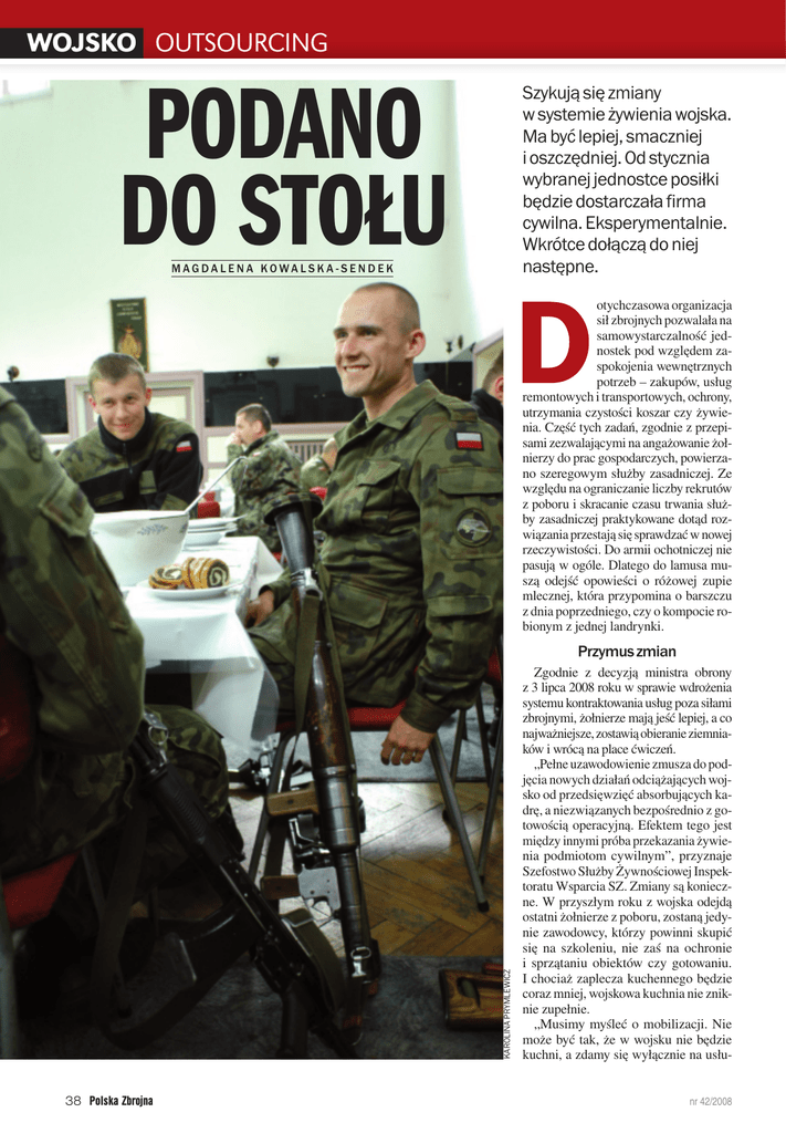 WOJSKO OUTSOURCING PODANO DO STOŁU Szykują się zmiany w systemie żywienia wojska. Ma być lepiej, smaczniej i oszczędniej. Od stycznia wybranej jednostce posiłki będzie dostarczała firma cywilna. Eksperymentalnie. Wkrótce dołączą do niej następne. MAGDALENA KOWALSKA -SENDEK otychczasowa organizacja sił zbrojnych pozwalała na samowystarczalność jednostek pod względem zaspokojenia wewnętrznych potrzeb – zakupów, usług remontowych i transportowych, ochrony, utrzymania czystości koszar czy żywienia. Część tych zadań, zgodnie z przepisami zezwalającymi na angażowanie żołnierzy do prac gospodarczych, powierzano szeregowym służby zasadniczej. Ze względu na ograniczanie liczby rekrutów z poboru i skracanie czasu trwania służby zasadniczej praktykowane dotąd rozwiązania przestają się sprawdzać w nowej rzeczywistości. Do armii ochotniczej nie pasują w ogóle. Dlatego do lamusa muszą odejść opowieści o różowej zupie mlecznej, która przypomina o barszczu z dnia poprzedniego, czy o kompocie robionym z jednej landrynki. KAROLINA PRYMLEWICZ Przymus zmian 38 Polska Zbrojna Zgodnie z decyzją ministra obrony z 3 lipca 2008 roku w sprawie wdrożenia systemu kontraktowania usług poza siłami zbrojnymi, żołnierze mają jeść lepiej, a co najważniejsze, zostawią obieranie ziemniaków i wrócą na place ćwiczeń. „Pełne uzawodowienie zmusza do podjęcia nowych działań odciążających wojsko od przedsięwzięć absorbujących kadrę, a niezwiązanych bezpośrednio z gotowością operacyjną. Efektem tego jest między innymi próba przekazania żywienia podmiotom cywilnym”, przyznaje Szefostwo Służby Żywnościowej Inspektoratu Wsparcia SZ. Zmiany są konieczne. W przyszłym roku z wojska odejdą ostatni żołnierze z poboru, zostaną jedynie zawodowcy, którzy powinni skupić się na szkoleniu, nie zaś na ochronie i sprzątaniu obiektów czy gotowaniu. I chociaż zaplecza kuchennego będzie coraz mniej, wojskowa kuchnia nie zniknie zupełnie. „Musimy myśleć o mobilizacji. Nie może być tak, że w wojsku nie będzie kuchni, a zdamy się wyłącznie na usłunr 42/2008 | | | | | | | | | | | ZAPIS FORUM NA CELOWNIKU WOJSKO KULISY PORADY PO SŁUŻBIE HISTORIA MILITARIA PRASA ŚWIAT TO I OWO Na pierwszy ogień Z żywieniem w systemie outsourcingu Wojsko Polskie ma zetknąć się już w styczniu 2009 roku. Początkowo będzie to program pilotażowy, realizowany w jednej jednostce. Jak prognozowano, miał to być 18 Batalion Desantowo-Szturmowy, nieoficjalnie wiadomo jednak, że w przyszłym roku 18 bdsz wyjedzie na kolejną zmianę do Afganistanu. „Napisaliśmy odwołanie do Dowództwa Wojsk Lądowych i szefa Szefostwa Służby Żywnościowej IW SZ, by Bielsko nie uczestniczyło w tym projekcie. Z 18 bdsz w Afganistanie znajdzie się prawie dwie trzecie żołnierzy. Nie sądzę, by w takiej sytuacji wprowadzenie do jednostki zewnętrznej firmy było opłacalne zarówno dla jednej, jak i drugiej strony, skoro do żywienia pozostanie około 30 osób”, mówi mjr Grzegorz Pradel, szef sekcji planowania 6 Brygady Desantowo-Szturmowej. Dowództwo brygady sugeruje, by bielski batalion przystąpił do programu dopiero od 2010 roku. Jak informuje płk Barański, problem jest wciąż dyskutowany. Wydział prasowy DWL podaje, że na pewno będzie to jednostka o najwyższym poziomie uzawodowienia, może to więc dotyczyć 11 DKPanc lub 12 DZ. „To Dowództwo Wojsk Lądowych zgłosiło 18 bdsz do programu. Dlatego w jego gestii jest wskazanie innej jednostki”, dodaje szef Szefostwa Służby Żywnościowej IW SZ. Pierwszy etap żywienia w outsourcingu obejmie w latach 2008–2012: • 18 bdsz, Bielsko-Biała • 10 BKPanc, Świętoszów • Centrum Szkolenia WL, Toruń • Centrum Szkolenia Artylerii i Uzbrojenia, Toruń • Centrum Szkolenia Łączności i Informatyki, Zegrze • Centrum Szkolenia Sił Powietrznych, Koszalin • 1 Bazę Lotniczą, Warszawa • Centrum Wsparcia Teleinformatycznego i Dowodzenia Marynarki Wojennej, Wejherowo • Oddział Specjalny ŻW, Mińsk Mazowiecki nr 42/2008 Zgodnie z decyzją ministra projekt wprowadzenia żywienia outsourcingowego będzie rozłożony na dwa etapy. Pierwszy, dotyczący dziewięciu jednostek, ma przynieść wiedzę i doświadczenie w zakresie przygotowania wojska do kompleksowego żywienia przez podmioty zewnętrzne. Dlatego objęte nim będą jednostki w pełni zawodowe. W drugim etapie, do 2018 roku, żywienie zewnętrzne obejmie jednostki i instytucje wojskowe, które nie mają możliwości przygotowywania posiłków albo jest to dla nich finansowo niekorzystne. Liczenie Jak podaje IW SZ, żywieniem kadry zajmą się firmy wybrane w drodze przetargów, zgodnie z przepisami ustawy o zamówieniach publicznych. Procedury konkursowe zaczną się w przyszłym roku, wraz z nowym budżetem. Podmioty cywilne będą w garnizonach świadczyć kompleksowe usługi kateringowe. „Oznacza to, że firma będzie żywiła w danym garnizonie wszystkie uprawnione osoby, a także dostarczała produkty żywnościowe jednostkom biorącym udział w szkoleniach, które zabiorą ze sobą sprzęt polowy i kucharzy – wyjaśnia płk Barański. Zakłada się również, że firmy zajmą się w przyszłości szkoleniem kucharzy – żołnierzy zawodowych, co pozwoli jednostkom na samodzielność w czasie poligonów i poza granicami kraju. Nowa koncepcja ma z pewnością wiele zalet i sprawdza się w armiach zachodnich. Istotą zmian jest zwolnienie struktur wojskowych z zadań niezwiązanych z działalnością operacyjną i szkoleniową. Jakie wady będzie miał projekt, pokaże eksperyment. Już teraz można zauważyć, że największą bolączka staną się pieniądze. Pamiętamy, że plan przekazania żywienia wojska firmom przygotowywano już w 2001 roku. Przetarg jednak nie doszedł do skutku, bo przedsiębiorstwa żądały wysokich stawek za dzienne wyżywienie jednego konsumenta. Czy teraz, gdy nie będzie poboro