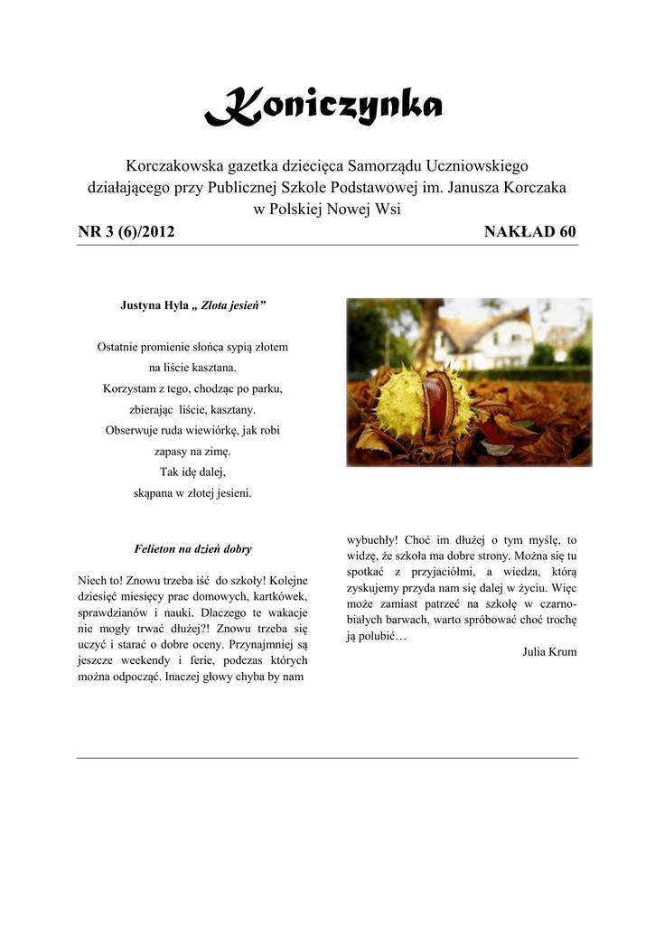 Koniczynka Korczakowska gazetka dziecięca Samorządu Uczniowskiego działającego przy Publicznej Szkole Podstawowej im. Janusza Korczaka w Polskiej Nowej Wsi NR 3 (6)/2012 NAKŁAD 60 Justyna Hyla „ Złota jesień” Ostatnie promienie słońca sypią złotem na liście kasztana. Korzystam z tego, chodząc po parku, zbierając liście, kasztany. Obserwuje ruda wiewiórkę, jak robi zapasy na zimę. Tak idę dalej, skąpana w złotej jesieni. Felieton na dzień dobry Niech to! Znowu trzeba iść do szkoły! Kolejne dziesięć miesięcy prac domowych, kartkówek, sprawdzianów i nauki. Dlaczego te wakacje nie mogły trwać dłużej?! Znowu trzeba się uczyć i starać o dobre oceny. Przynajmniej są jeszcze weekendy i ferie, podczas których można odpocząć. Inaczej głowy chyba by nam wybuchły! Choć im dłużej o tym myślę, to widzę, że szkoła ma dobre strony. Można się tu spotkać z przyjaciółmi, a wiedza, którą zyskujemy przyda nam się dalej w życiu. Więc może zamiast patrzeć na szkołę w czarnobiałych barwach, warto spróbować choć trochę ją polubić… Julia Krum Skarby jesieni… Moje wakacje Moje wakacje spędziłam bardzo przyjemnie. W sierpniu pojechałam razem z rodziną do Gdańska. Dotarliśmy tam około godziny 11:00. Poszliśmy od razu zobaczyć park w Oliwie. Zdążyliśmy na koncert w Katedrze pw. Najświętszej Marii Panny, gdzie usłyszeliśmy, jak gra na organach Jean Cristopke Geiser. Następnego dnia zwiedzaliśmy Gdańsk. Oglądaliśmy grób Artusa, Dom Upchagena oraz słynnego żurawia. Po tym zobaczyliśmy Centrum Hewellianum. Miejsce to było podzielone na 2 wystawy: o kosmosie i zmysłach. Kolejnego dnia zwiedziliśmy Gdynię. Obejrzeliśmy 2 statki: żaglowiec „Dar Pomorza” oraz okręt wojenny ORP „Błyskawica”. Później była jeszcze wycieczka statkiem po porcie. Widoki zachwycały, w dodatku przepłynął koło nas ogromny statek pasażerski i 2 okręty. Zwiedzanie zakończyliśmy na akwarium, gdzie zobaczyliśmy zwierzęta morskie. Ostatniego dnia poszliśmy na plażę, woda była ciepła. Zobaczyliśmy też latarnię i Muzeum Bursztynu. Potem wróciliśmy do domu. Tych wakacji długo nie zapomnę. Bardzo mi się podobały. Łucja Orłowska Przyszła jesień, a wraz z nią spadające liście, dojrzałe owoce i grzyby. Jeżeli macie ochotę wybrać się na grzyby, to mamy dla was kilka porad. Oto co powinieneś mieć ze sobą: - nóż, - kosz wiklinowy, - atlas grzybów zawierający opisy i dobrej jakości zdjęcia. UWAGA!!! Absolutnie nie zabieraj żadnych siatek i reklamówek foliowych! Poniżej sześć przykazań grzybiarza: 1.Zbieraj tylko takie grzyby, do których masz 100% pewności. 2.Nie należy zbierać grzybów zbyt młodych, bo nie mają wszystkich cech potrzebnych do ich rozpoznawania. 3.Nie zbieraj grzybów zbyt starych, wodnistych i robaczywych. 4.Należy delikatnie wykręcać grzyb, a następnie przykryć pozostałą w ziemi część grzyba. W ten sposób nie wyschnie on i możliwe, że niedługo pojawi się w jego miejscu nowy grzyb. 5.Jeżeli nie jesteś w stanie wykręcić grzyba, możesz go uciąć, ale resztę usuń z ziemi. 6.Umieszczaj grzyby w koszu kapeluszami do dołu. Julia Krum Kotlety warzywne z grzybami Składniki na 4 porcje: Dwie szklanki kaszy jęczmiennej 10 suszonych grzybów 1 cebula 1 jajko 25 dag włoszczyzny 2 łyżki oleju 3 łyżki bułki tartej 3 łyżki smalcu 1 łyżka posiekanego szczypiorku Szczypta majeranku Sól, pieprz. Przyrządzenie: 1. Kaszę zalać 4 szklankami zimnej wody, osolić, ugotować na sypko, przykryć i odstawić na bok. 2. Grzyby zalac szklanką wody, moczyć 30 minut. Ugotować w tej samej wodzie. Włoszczyznę oczyścić, umyć, włożyć do rondla, zalac wodą i ugotować. Grzyby i włoszczyznę odcedzić na sicie, zemleć. Cebule obrać, posiekac, zrumienić na rozgrzanym oleju. 3. Kaszę połączyć z cebulą, zmieloną włoszczyzną i grzybami, wbić jajko. Przyprawić do smaku solą, pieprzem i majerankiem, dodać szczypiorek, wymieszać. Smalec rozgrzać na patelni. Z masy uformować nie duże kotlety, obtoczyć w bułce po czym smażyć około 3-4 minut. Kotlety podawać gorące. Pieczarki z duszonymi pomidorami Składniki na 4 porcje: 80 dag pieczarek 2 cebule 4 pomidory 10 czarnych oliwek 3 łyżki oliwy z oliwek 1 łyżeczka soli Szczypta białego pieprzu 1 łyżeczka posiekanych listków rozmarynu 1 łyżka posiekanych ziół: natki pietruszki, estragonu, trybuli. Przyrządzenie: 1. Grzyby oczyścić, umyć, osączyć i pokroić w grube plastry. Cebulę obrać, pokroić w ósemki. Pomidory sparzyć, obrać ze skórki, pokroić również w ósemki. Oliwki opłukać pod bieżąca letnia wodą, osączyć. 2. Na dużej patelni rozgrzać oliwę, zeszklić na niej cebulę. Następnie dodać grzyby, podsmażyć je ze wszystkich stron, dodać pomidory, oliwki, doprawić solą i pieprzem, dusić wszystko razem pod przykryciem na małym ogniu przez 10 minut. 3. Gotową potrawę przełożyć na talerze i posypać posiekaną zielenią. Opracowała: Emilia Golec Magia imion męskich 1. Krzysztof Raz jest spokojny, raz nieznośny. Jest błyskotliwy, o dużej inteligencji i często potrafi wybuchnąć. 2.Paweł Wierny przyjaciel, pomocny kolega, odważny. W pracy sumienny wykonawca powierzonych zadań. Materiał na inżyniera lub informatyka. Bywa kapryśny! 3.Rafał Lubi ogrody i hodowanie zwierząt. Rozumie dusze kobiet i dzieci. Chętnie otacza się liczną rodziną. 4.Dawid Jest pracowity, pomysłowy, ambitny i konsekwentny. Zachwyca się historią oraz posiada uzdolnienia artystyczne, do czego nie przywiązuje nigdy uwagi. 5.Szymon Lubi doradzać i służyć innym pomocą. Czyta książki, bywa w teatrze. Jest osobą tajemniczą. 6.Michał Człowiek dobry, stateczny, pogodny, inteligentny, służy chętnie pomocą. Lubi i cieszy się szacunkiem u innych. 7.Mateusz Jest odpowiedzialny, prawdomówny, sprawiedliwy, dobroduszny. Udziela pomocy innym osobom. 8.Fa