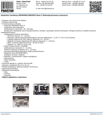 PPHU "PRAISTON" Mariusz Prais ul. Górowska 32 64-100 Leszno Polska Biuro: +48.65 527-01-67 Serwis:+48.782-844-000 Fax: +48.65 527-01-67 Mariusz Prais: +48.693-37-27-47 Łukasz Prais: +48.665-345-001 Zenon Prais: +48.609-788-830 E-mail: [email protected] Respirator karetkowy WEINMANN MEDUMAT Basic P (Rekondycjonowany (używany)) • Używany, stan techniczny idealny, • Produkcji niemieckiej, • W skład zestawu wchodzą: ⚬ Respirator MEDUMAT Basic P, ▪ Zasilanie akumulatorowe, ▪ Wbudowany manometr: -20 – 80 mbar, ▪ Optyczne i dźwiękowe alarmy bezpieczeństwa: niskiego i wysokiego ciśnienia wentylacji; niskiego ciśnienia w układzie zasilania; rozładowania baterii, ▪ Regulowane funkcje respiratora: • Ciśnienie robocze: 2,7 – 6,0 bar, • Stosunek czasów wentylacji/wspomagane sztuczne oddychanie : 1:1,67 / 1:1 do 1:2,33 zmienny, • Częstość oddychania Freq. (płynna regulacja): 10 – 30 min-1, • Objętość minutowa oddechowa MV (płynna regulacja): 3 – 20 l/min, • Maks. Ciśnienie oddychania Pmax.: 20 lub 45 mbar, • Stężenie O2: 100% O2 lub Air mix, ⚬ Moduł inhalacji tlenem „OXYGEN” ▪ Wbudowany manometr: 0 – 15 l/min, ▪ Płynna regulacja przepływu O2 0 – 15 l/min, ▪ funkcja płynnego przełączania źródła zasilania tlenem, ⚬ Metalowa rama LIFE BASE MINI II, ▪ Miejsce na butle i reduktor, ⚬ Reduktor z manometrem i wężem zasilającym, ⚬ Wąż pacjenta, ⚬ Zawór pacjenta, ⚬ Torba, • Instrukcja obsługi w j. polskim (format pdf), • Gabaryty urządzenia: 48 x 22 x 25 cm, • Posiada wystawiony aktualny Paszport Techniczny, • Gwarancja 6-miesięcy, • Możliwość finansowania: ⚬ Raty, ⚬ Leasing, ⚬ Pozyczka. • Zdjęcia pogladowe respiratora, www.praiston.pl 06-09-2013, 9:47:13