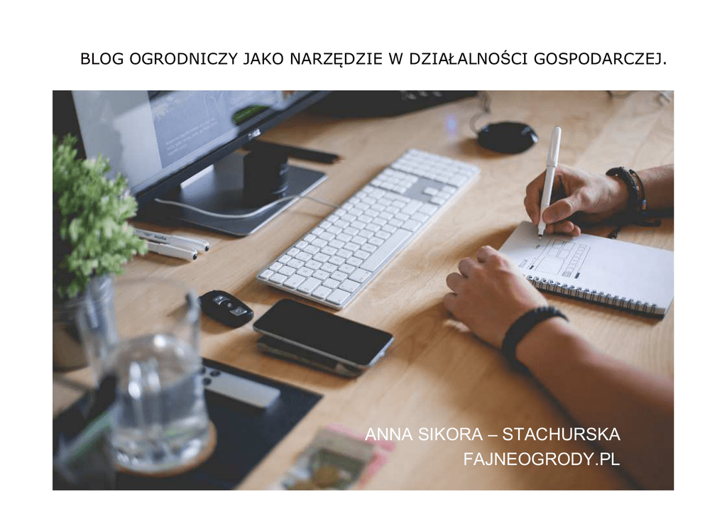 BLOG OGRODNICZY JAKO NARZĘDZIE W DZIAŁALNOŚCI GOSPODARCZEJ. ANNA SIKORA – STACHURSKA FAJNEOGRODY.PL FAJNE OGRODY DZIŚ: • BLOG • PRACOWNIA ARCHITEKTURY KRAJOBRAZU • EDUKACJA WARSZTATY OGRODNICZE KURS PROJEKTOWANIA OGRODÓW KRUPA KREATYWNA NA FB • PRODUKT CO BLOG MOŻE ZROBIĆ DLA FIRMY? BLOGA TOWARZYSZĄCEGO DZIAŁALNOŚCI GOSPODARCZEJ MOŻNA POPROWADZIĆ NA 3 SPOSOBY: • BLOG EKSPERCKI • BLOG OSOBISTY • BLOG MIESZANY BLOG – WIZYTÓWKA FIRMY • WSPIERA BUDOWANIE WIZERUNKU FIRMY/MARKI • WSPIERA DZIAŁANIA PROMOCYJNE I MARKETINGOWE (DYSTRYBUCJA INFORMACJI) • PREZENTUJE FIRMĘ, JEJ FILOZOFIĘ, DOKONANIA ETC. • PRZYBLIŻA ZESPÓŁ I OFERTĘ • POZWALA NA KREATYWNĄ PREZENTACJĘ USŁUG I PRODUKTÓW • BUDUJE WIĘŹ I RELACJE MIĘDZY KLIENTEM A FIRMĄ • STANOWI KANAŁ (JEDEN Z KANAŁÓW) DYSTRYBUCJI PRODUKTÓW I USŁUG blog pozwala zbliżyć się do firmy znacznie bardziej niż strona www, co jest zgodne z dzisiejszymi trendami marketingowymi BLOG POZWALA BUDOWAĆ WIĘŹ DOBRY, SKUTECZNY BLOG TOWARZYSZĄCY DZIAŁALNOŚCI GOSPODARCZEJ POWINIEN ZAWSZE: • • • • NIEŚĆ WARTOŚĆ DODANĄ DLA ODBIORCY BYĆ ŻYWY BYĆ ATRAKCYJNY WIZUALNIE I TRANSPARENTNY PODĄŻAĆ ZA AKTUALNYMI TRENDAMI W BLOGOSFERZE KOMERCYJNEJ • BYĆ SZCZERY I PRAWDZIWY • BYĆ JAKIŚ, WYRÓŻNIAĆ SIĘ NA TLE INNYCH ASPEKTY TECHNICZNE • WŁASNA DOMENA LUB PODPIĘCIE POD WWW FIRMOWE • ZOPTYMALIZOWNY POD KĄTEM WYSZUKIWAREK (GOOGLE) • SKUTECZNE POZYCJONOWANIE TREŚCI (organiczne) • AKTUALIZACJA TREŚCI • IDENTYFIKACJA GRAFICZNA SPÓJNA Z MARKĄ/FIRMĄ • URUCHOMIONE KANAŁY SOCIAL MEDIA KIEDY BLOG SZKODZI FIRMIE? • • • • • BŁĘDY STYLISTYCZNE I ORTOGRAFICZNE BRAK AKTUALIZACJI TREŚCI BLOG `NIE MA` AUTORA SZTAMPA PRZEDRUKI I MATERIAŁY KOPIOWANE I ZAMIESZCZANE NIEZGODNIE Z PRAWEM • BRZYDKIE ZDJĘCIA • BŁĘDY MERYTORYCZNE • ARCHAICZNA SZATA GRAFICZNA BLOG TOWARZYSZĄCY DZIAOŁALNOŚCI GOSPODARCZEJ POWINIEN BYĆ CZĘŚCIĄ STRATEGII FIRMY/MARKI. NIE ZAKŁADAJ BLOGA: • • • • BO INNI MAJĄ GDY NIE MASZ NA NIEGO POMYSŁU GDY NIE MASZ NA NIEGO CZASU NIE ZNASZ SIĘ NA BLOGOWANIU (ew. zatrudnij kogoś kto się zna) • NIE PASUJE DO WIZERUNKU TWOJEJ DZIAŁALNOŚCI • JEŚLI MA SŁUŻYĆ WYŁĄCZNIE ZARABIANIU `KASY` DZIĘKUJĘ ZA UWAGĘ ☺