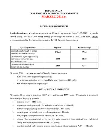 INFORMACJA O STANIE BEZROBOCIA W KRAKOWIE MARZEC 2016 r. LICZBA BEZROBOTNYCH Liczba bezrobotnych zarejestrowanych w tut. Urzędzie wg stanu na dzień 31.03.2016 r. wynosiła 19864 osoby. Jest to o 304 osoby mniej, porównując ze stanem z 29.02.2016 roku. Osoby z prawem do zasiłku dla bezrobotnych stanowiły 12,2 % ogółu bezrobotnych. Wyszczególnienie Ogółem W tym kobiety Liczba bezrobotnych w końcu miesiąca sprawozdawczego 19864 9734 Liczba nowo rejestrujących się bezrobotnych w miesiącu sprawozdawczym 2073 1030 Liczba osób bezrobotnych z prawem do zasiłku 2425 1371 W marcu 2016 r. zarejestrowano 2073 osoby bezrobotne w tym: 1709 osób, które poprzednio pracowały; w tym zwolnienia z przyczyn zakładu pracy dotyczyło 103 osób; 364 osoby dotychczas niepracujące. WYŁĄCZENIA Z EWIDENCJI W marcu 2016 roku z rejestrów GUP wyrejestrowano 2377 osób. Wyłączenia z ewidencji bezrobotnych dotyczyły głównie: podjęcia pracy – 1239 osób; niepotwierdzenie gotowości do podjęcia zatrudnienia – 399 osób; dobrowolnej rezygnacji ze statusu bezrobotnego – 111 osób; nabycie praw do świadczenia przedemerytalnego – 30 osób; nabycie praw emerytalnych lub rentowych – 61 osób; odmowy bez uzasadnionej przyczyny przyjęcia propozycji odpowiedniej pracy lub innej formy pomocy w tym w ramach PAI – 32 osoby; inne (np. zasiłek stały, zmiana miejsca zameld. poza obszar działania PUP) – 108 osób. OSOBY BĘDĄCE W SZCZEGÓLNEJ SYTUACJI NA RYNKU PRACY Stan na dzień 31.03.2016 r. 4273 Struktura w% W tym do 25 roku życia 1634 8,2 Długotrwale bezrobotni 10833 54,5 Powyżej 50 roku życia 6419 32,3 0 0,0 1912 9,6 4 0,0 1612 8,1 Wyszczególnienie Do 30 roku życia Korzystające ze świadczeń z pomocy społecznej Posiadające co najmniej jedno dziecko do 6 roku życia Posiadające co najmniej jedno dziecko niepełnosprawne do 18 roku życia Niepełnosprawni 21,5 AKTYWNE FORMY ZWALCZANIA BEZROBOCIA W marcu 2016 r. zaktywizowano w poszczególnych programach łącznie 430 osób bezrobotnych w tym: prace społecznie użyteczne – 26 osób; staże – 284 osoby; szkolenia – 62 osoby; prace interwencyjne – 32 osoby; roboty publiczne – 10 osób; podjęcia działalności gospodarczej – 1 osoba; podjęcia pracy w ramach refundacji kosztów zatrudnienia bezrobotnego – 15 osób. OFERTY PRACY W marcu 2016 r. do tut. Urzędu zgłoszono 1813 wolnych miejsc pracy, z czego 77 miejsc pracy dotyczyły ofert pracy dla osób niepełnosprawnych. Na ww. miejsca pracy oraz miejsca pracy pozostałe w dyspozycji Urzędu z poprzednich okresów sprawozdawczych skierowanych zostało na rozmowy kwalifikacyjne do pracodawców przez pośredników GUP 2322 kandydatów. Najwięcej zgłoszonych/pozyskanych wolnych miejsc pracy w marcu 2016 roku: Nazwa zawodu Liczba zgłoszonych wolnych miejsc pracy Pozostali pracownicy obsługi biurowej 139 Pozostali specjaliści do spraw rozwoju systemów informatycznych 76 Pozostałe pomoce i sprzątaczki biurowe, hotelowe i podobne 74 Sprzedawca 60 Sprzątaczka biurowa 57 Pracownik przygotowujący posiłki typu fast food 50 Programista aplikacji 37 Robotnik gospodarczy 35 Doradca klienta 35 Zbrojarz 35 Inwentaryzator 30 Magazynier 30 Listonosz 30