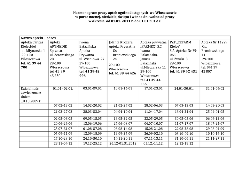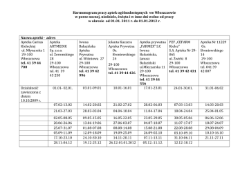 Harmonogram pracy aptek ogólnodostępnych we Włoszczowie w porze nocnej, niedziele, święta i w inne dni wolne od pracy w okresie od 01.01. 2011 r. do 01.01.2012 r. Nazwa apteki - adres Apteka Apteka Caritas Kieleckiej ARTMEDIK ul. Młynarska 1 Sp. z.o.o. 29-100 ul. Żeromskiego 28 Włoszczowa 29-100 tel. 41 39 44 700 Włoszczowa tel. 41 39 43 250 Działalność zawieszona z dniem 10.10.2009 r. PZF „CEFARM Kielce” S.A. Apteka Nr 29065 ul. Żwirki 8 29-100 Włoszczowa tel. 41 39 42 431 Apteka Nr 11229 Os. Broniewskiego 14 29-100 Włoszczowa tel. 041 39 42 807 10.01-16.01 Apteka prywatna „FARMEX” S.C Iwona Bałazińska, Janusz Bałaziński ul.Mleczarska 11 29-100 Włoszczowa tel. 41 39 44 556 17.01-23.01 24.01-30.01. 31.01-06.02 14.02-20.02 21.02-27.02 28.02-06.03 07.03-13.03 14.03-20.03 21.03-27.03 28.03-03.04 04.04-10.04 11.04-17.04 18.04-24.04 25.04-01.05 02.05-08.05 20.06-26.06 25.07-31.07 05.09-11.09 17.10-23.10 28.11-04.12 09.05-15.05 13.06-19.06 01.08-07.08 12.09-18.09 24.10-30.10 19.12-25.12 16.05-22.05 27.06-03.07 08.08-14.08 19.09-25.09 14.11-20.11 26.12-01.01.2012 23.05-29.05 04.07-10.07 15.08-21.08 26.09-02.10 07.11-13.11 05.12.-11.12. 30.05-05.06 11.07-17.07 22.08-28.08 03.10-09.10 31.10-06.11 12.12-18.12 06.06-12.06 18.07-24.07 29.08-04.09 10.10-16.10 21.11-27.11 Iwona Bałazińska Apteka Prywatna ul. Wiśniowa 27 29-100 Włoszczowa tel. 41 39 42 996 Jolanta Kuczera Apteka Prywatna Os. Broniewskiego 24 01.01- 02.01. 03.01-09.01 07.02-13.02 29-100 Włoszczowa tel. 41 39 44 426