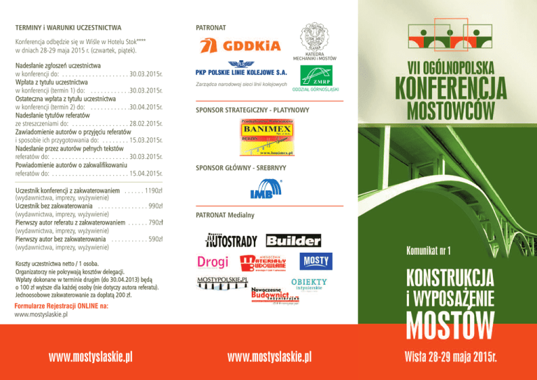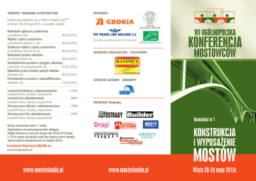 TERMINY i WARUNKI UCZESTNICTWA PATRONAT Konferencja odbędzie się w Wiśle w Hotelu Stok**** w dniach 28-29 maja 2015 r. (czwartek, piątek). Nadesłanie zgłoszeń uczestnictwa w konferencji do: . . . . . . . . . . . . . . . . . . . . 30.03.2015r. Wpłata z tytułu uczestnictwa w konferencji (termin 1) do: . . . . . . . . . . . .30.03.2015r. Ostateczna wpłata z tytułu uczestnictwa w konferencji (termin 2) do: . . . . . . . . . . . .30.04.2015r. Nadesłanie tytułów referatów ze streszczeniami do: . . . . . . . . . . . . . . . . . 28.02.2015r. Zawiadomienie autorów o przyjęciu referatów i sposobie ich przygotowania do: . . . . . . . . 15.03.2015r. Nadesłanie przez autorów pełnych tekstów referatów do: . . . . . . . . . . . . . . . . . . . . . . . 30.03.2015r. Powiadomienie autorów o zakwalifikowaniu referatów do: . . . . . . . . . . . . . . . . . . . . . . . 15.04.2015r. Uczestnik konferencji z zakwaterowaniem . . . . . . 1190zł (wydawnictwa, imprezy, wyżywienie) Uczestnik bez zakwaterowania . . . . . . . . . . . . . . . 990zł (wydawnictwa, imprezy, wyżywienie) Pierwszy autor referatu z zakwaterowaniem . . . . . . 790zł (wydawnictwa, imprezy, wyżywienie) Pierwszy autor bez zakwaterowania . . . . . . . . . . . 590zł (wydawnictwa, imprezy, wyżywienie) KATEDRA MECHANIKI i MOSTÓW ODDZIAŁ GÓRNOŚLĄSKI SPONSOR STRATEGICZNY - PLATYNOWY SPONSOR GŁÓWNY - SREBRNYY PATRONAT Medialny Koszty uczestnictwa netto / 1 osoba. Organizatorzy nie pokrywają kosztów delegacji. Wpłaty dokonane w terminie drugim (do 30.04.2013) będą o 100 zł wyższe dla każdej osoby (nie dotyczy autora referatu). Jednoosobowe zakwaterowanie za dopłatą 200 zł. Formularze Rejestracji ONLINE na: www.mostyslaskie.pl www.mostyslaskie.pl www.mostyslaskie.pl ORGANIZATOR BIG BANG Media przy współpracy: Katedra Mechaniki i Mostów Politechniki Śląskiej Związek Mostowców Rzeczypospolitej Polskiej ❙ Oddział Górnośląski KOMITET PROGRAMOWY prof. dr hab. inż. Jan Bień prof. dr hab. inż. Jan Biliszczuk prof. dr hab. inż. Kazimierz Flaga prof. dr hab. inż. Kazimierz Furtak prof. dr hab. inż. Józef Głomb dr hab. inż. Marek Łagoda prof. PL dr hab. inż. Arkadiusz Madaj prof. PP prof. dr hab. inż. Wojciech Radomski dr hab. inż. Tomasz Siwowski prof. PRz dr hab. inż. Janusz Szelka prof. UZ dr hab. inż. Jerzy Weseli - przewodniczący prof. dr hab. inż. Witold Wołowicki dr hab. inż. Adam Wysokowski prof. UZ prof. dr hab. inż. Henryk Zobel dr hab. inż. Krzysztof Żółtowski prof. PG KOMITET ORGANIZACYJNY Maciej Błach Grzegorz Frej Piotr Łaziński Stanisław Łukasik – z-ca przewodniczącego Władysław Nowak Stefan Pradelok – sekretarz Marek Salamak – przewodniczący Zbigniew Tabor REFERATY GENERALNE i SZKOLENIOWE GDDKiA PKP PLK S.A. Politechnika Śląska Najnowsze rozwiązania w zakresie wyposażenia ❙ mostów drogowych i kolejowych PATRONAT Generalna Dyrekcja Dróg Krajowych i Autostrad Katedra Mechaniki i Mostów Politechniki Śląskiej PKP Polskie Linie Kolejowe S.A. Związek Mostowców Rzeczypospolitej Polskiej ❙ Oddział Górnośląski UWAGA: Tegoroczna konferencja, oprócz dotychczasowych zagadnień, zostanie rozszerzona o tematykę dotyczącą planowanych inwestycji w branży drogowej i kolejowej związanych z nową perspektywą finansowania projektów infrastrukturalnych w latach 2014-2020. CELE KONFERENCJI Podstawowym celem konferencji jest umożliwienie spotkania środowiska mostowców – przedstawicieli nauki, projektantów, wykonawców i producentów zajmujących się zagadnieniami związanymi z obiektami inżynierii lądowej, a w szczególności konstrukcją i wyposażeniem mostów drogowych i kolejowych. Podczas ostatniej konferencji w 2012 roku, która odbyła się również w Wiśle, uczestniczyło ponad 200 osób reprezentujących: administrację drogową (18%), jednostki naukowo-badawcze (16%), biura projektowe (22%), przedsiębiorstwa wykonawcze, produkcyjne ❙ i handlowe związane z mostami (44%). ❙ Ponad 30 firm skorzystało z różnych form promocji. TEMATYKA KONFERENCJI Mosty kolejowe i drogowe (metalowe, betonowe) Utrzymanie i inspekcje mostów Wyposażenie mostów (łożyska, urządzenia ❙ dylatacyjne, bariery, odwodnienie, izolacje, ❙ nawierzchnie, systemy monitoringu...), Projektowanie, wykonawstwo, technologie. ZAGADNIENIA Przedmiotem rozważań będą następujące grupy zagadnień: rodzaje i nazewnictwo wyposażenia mostów, izolacje, nawierzchnie, odwodnienie, zabezpieczenia, urządzenia monitorujące, łożyska i przeguby konstrukcyjne, modelowanie i analiza obliczeniowa, badania i analiza eksperymentalna, analiza uszkodzeń, awarii i katastrof, obiekt mostowy a środowisko, analiza stanów użytkowych, wpływ technologii na elementy wyposażenia, gospodarka mostowa i przeglądy. ADRES SEKRETARIATU KOMITETU Politechnika Śląska Zespół Mostów Katedra Mechaniki i Mostów ul. Akademicka 5, 44-100 Gliwice KONTAKT: Przewodniczący Komitetu Organizacyjnego: Marek Salamak tel.: 502 359 037 Organizacja konferencji i promocja firm: Halina Morawiak tel.: 604 415 073 e-mail: [email protected] DANE DO PRZELEWU: Wpłaty za uczestnictwo i promocję należy dokonać przelewem na konto ING Bank Śląski nr: 92 1050 1285 1000 0090 9466 0603 BIG BANG Media 44-100 Gliwice, ul. Górnych Wałów 52/13 Tytuł przelewu za uczestnictwo: Konferencja / Imię i Nazwisko Uczestnika(ów) / NIP Firmy
