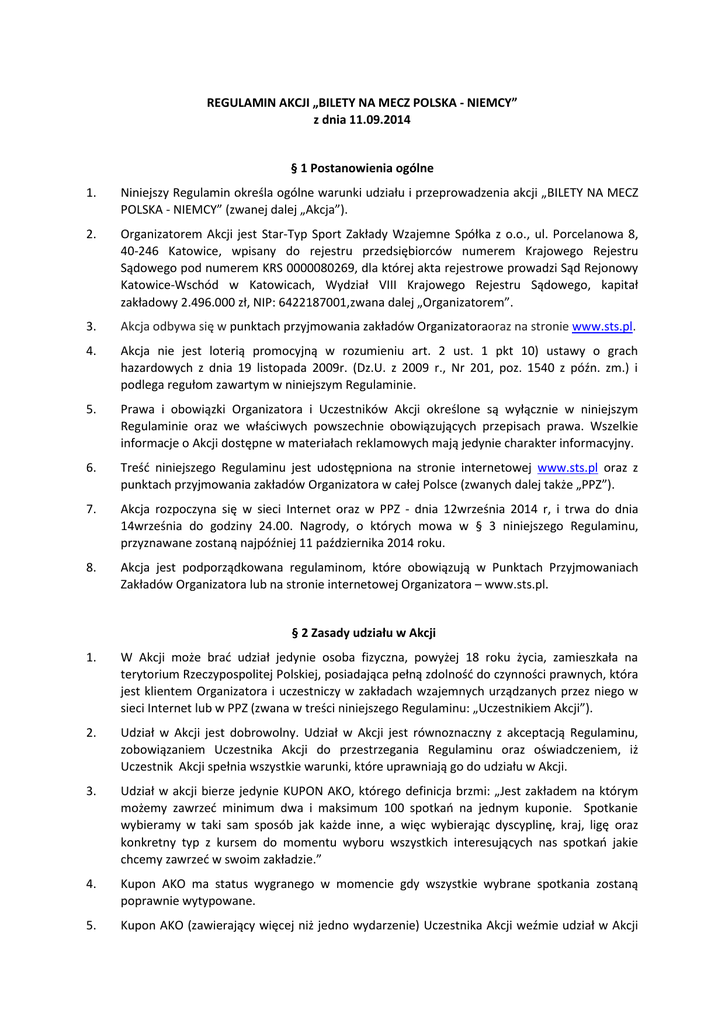 REGULAMIN AKCJI „BILETY NA MECZ POLSKA - NIEMCY” z dnia 11.09.2014 § 1 Postanowienia ogólne 1. Niniejszy Regulamin określa ogólne warunki udziału i przeprowadzenia akcji „BILETY NA MECZ POLSKA - NIEMCY” (zwanej dalej „Akcja”). 2. Organizatorem Akcji jest Star-Typ Sport Zakłady Wzajemne Spółka z o.o., ul. Porcelanowa 8, 40-246 Katowice, wpisany do rejestru przedsiębiorców numerem Krajowego Rejestru Sądowego pod numerem KRS 0000080269, dla której akta rejestrowe prowadzi Sąd Rejonowy Katowice-Wschód w Katowicach, Wydział VIII Krajowego Rejestru Sądowego, kapitał zakładowy 2.496.000 zł, NIP: 6422187001,zwana dalej „Organizatorem”. 3. Akcja odbywa się w punktach przyjmowania zakładów Organizatoraoraz na stronie www.sts.pl. 4. Akcja nie jest loterią promocyjną w rozumieniu art. 2 ust. 1 pkt 10) ustawy o grach hazardowych z dnia 19 listopada 2009r. (Dz.U. z 2009 r., Nr 201, poz. 1540 z późn. zm.) i podlega regułom zawartym w niniejszym Regulaminie. 5. Prawa i obowiązki Organizatora i Uczestników Akcji określone są wyłącznie w niniejszym Regulaminie oraz we właściwych powszechnie obowiązujących przepisach prawa. Wszelkie informacje o Akcji dostępne w materiałach reklamowych mają jedynie charakter informacyjny. 6. Treśd niniejszego Regulaminu jest udostępniona na stronie internetowej www.sts.pl oraz z punktach przyjmowania zakładów Organizatora w całej Polsce (zwanych dalej także „PPZ”). 7. Akcja rozpoczyna się w sieci Internet oraz w PPZ - dnia 12września 2014 r, i trwa do dnia 14września do godziny 24.00. Nagrody, o których mowa w § 3 niniejszego Regulaminu, przyznawane zostaną najpóźniej 11 października 2014 roku. 8. Akcja jest podporządkowana regulaminom, które obowiązują w Punktach Przyjmowaniach Zakładów Organizatora lub na stronie internetowej Organizatora – www.sts.pl. § 2 Zasady udziału w Akcji 1. W Akcji może brad udział jedynie osoba fizyczna, powyżej 18 roku życia, zamieszkała na terytorium Rzeczypospolitej Polskiej, posiadająca pełną zdolnośd do czynności prawnych, która jest klientem Organizatora i uczestniczy w zakładach wzajemnych urządzanych przez niego w sieci Internet lub w PPZ (zwana w treści niniejszego Regulaminu: „Uczestnikiem Akcji”). 2. Udział w Akcji jest dobrowolny. Udział w Akcji jest równoznaczny z akceptacją Regulaminu, zobowiązaniem Uczestnika Akcji do przestrzegania Regulaminu oraz oświadczeniem, iż Uczestnik Akcji spełnia wszystkie warunki, które uprawniają go do udziału w Akcji. 3. Udział w akcji bierze jedynie KUPON AKO, którego definicja brzmi: „Jest zakładem na którym możemy zawrzed minimum dwa i maksimum 100 spotkao na jednym kuponie. Spotkanie wybieramy w taki sam sposób jak każde inne, a więc wybierając dyscyplinę, kraj, ligę oraz konkretny typ z kursem do momentu wyboru wszystkich interesujących nas spotkao jakie chcemy zawrzed w swoim zakładzie.” 4. Kupon AKO ma status wygranego w momencie gdy wszystkie wybrane spotkania zostaną poprawnie wytypowane. 5. Kupon AKO (zawierający więcej niż jedno wydarzenie) Uczestnika Akcji weźmie udział w Akcji tylko, jeśli zakłady zostaną zawarte na www.sts.pl lub z pomocą Karty Klubu STS w punkcie przyjmowania zakładów. 6. Akcja polega na tym, że Uczestnik Akcji obstawia dokładnie 5 wydarzeo (nie mniej, nie więcej) w zakładach bukmacherskich na jednym kuponie AKO. 7. Kupon AKO ma szanse na zwycięstwo w Akcji tylko wtedy, jeśli do dnia 14 września godzina 24:00 w całości zostanie uznany jako zwycięski. 8. 16 września 2014 w punktach przyjmowania zakładów i na www.sts.pl opublikowane zostaną rankingi, w których wyszczególnionych zostanie 30 kuponów biorących udział w Akcji z najwyższymi łącznymi kursami 9. 10. Jeden Uczestnik Akcji może wysład niezliczoną liczbę kuponówAKO. Organizator nie ustalił minimalnego wkładu kuponuAKO. To Uczestnik Akcji decyduje o wysokości wkładu. Spośród zakładów zawartych na sts.pl liczone w zabawie będą jedynie kupony opłacone środkami z konta depozytowego UczestnikaAkcji. Organizator zweryfikuje wszystkie kupony AKO biorące udział w Akcji do dnia 14września. 11. 12. § 3 Nagrody 1. Nagrodzonych zostanie 30 kuponów biorących udział w Akcji, które będą miały najwyższe kursy łączne i zostaną wyszczególnione w rankingu, który zostanie opublikowany 16 września. 2. Uczestnik, którego kupon znalazł się wśród 30 najlepszych kuponów, otrzyma podwójne bilety na mecz Polska – Niemcy. 3. Warunkiem dodatkowym, aby odebrad bilety, będzie przekazanie przez Uczestnika najdalej do 20 września informacji kto skorzysta z biletów. Będą to następujące informacje: a) Imię i nazwisko b) Numer PESEL c) Numer zwycięskiego kuponu 4. Powyższe informacje zostaną przekazane pracownikowi punktu przyjmowania zakładów lub zostaną wysłane na adres [email protected]. § 4 Odpowiedzialność 1. Organizatornie ponosi odpowiedzialności za: a) b) c) d) e) f) g) 2. niemożnośd wydania nagrody z przyczyn niezależnych od Organizatora. podanie przez Uczestnika Akcji nieprawidłowych, niepełnych lub nieprawdziwych danych osobowych, danych kontaktowych oraz innych informacji, brak możliwości dokonania zgłoszenia konkursowego spowodowany awarią sieci Internetowych, nieprawidłowości związane z działaniem osób trzecich, problemy w przeprowadzaniu Akcji, jeżeli nastąpiły one wskutek siły wyższej, przez którą należy rozumied zdarzenie nagłe, niemożliwe do przewidzenia, których skutkom nie można było zapobiec, szkody spowodowane przez udział w Akcji niezgodnie z postanowieniami Regulaminu, wszelkie nieprawidłowości w przeprowadzaniu Akcji powstałe z przyczyn technicznych (np. konserwacja, przegląd, wymiana sprzętu) lub innych niezależnych od Organizatora. Odpowiedzialnośd Organizatora wobec Uczestnika Akcji z tytułu wszelkich szkód związanych z jego udziałem w Akcji ograniczona jest do