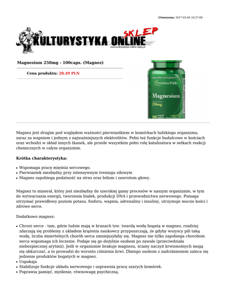 Utworzono: 2017-03-04 10:27:08 Magnesium 250mg - 100caps. (Magnez) Cena produktu: 28,49 PLN Magnez jest drugim pod względem ważności pierwiastkiem w komórkach ludzkiego organizmu, zaraz za wapniem i jednym z najważniejszych elektrolitów. Pełni też funkcje budulcowe w kościach oraz wchodzi w skład innych tkanek, ale przede wszystkim pełni rolę katalizatora w setkach reakcji chemicznych w całym organizmie. Krótka charakterystyka: ● ● ● Wspomaga pracę mięśnia sercowego. Pierwiastek niezbędny przy intensywnym treningu siłowym Magnez zapobiega podatność na stres oraz bólom i zawrotom głowy. Magnez to minerał, który jest niezbędny do szerokiej gamy procesów w naszym organizmie, w tym do wytwarzania energii, tworzenia białek, produkcji DNA i przewodnictwa nerwowego. Pomaga utrzymać prawidłowy poziom potasu, fosforu, wapnia, adrenaliny i insuliny, utrzymuje mocne kości i zdrowe serce. Dodatkowo magnez: ● ● ● ● Chroni serce - tam, gdzie ludzie mają w kranach tzw. twardą wodę bogatą w magnez, rzadziej zdarzają się problemy z układem krążenia naukowcy przypuszczają, że gdyby wszyscy pili taką wodę, liczba śmiertelnych chorób serca zmniejszyłaby się. Magnez nie tylko zapobiega chorobom serca wspomaga ich leczenie. Podaje się go dożylnie osobom po zawale (przeciwdziała niebezpiecznej arytmii). Jeśli w organizmie brakuje magnezu, ściany naczyń krwionośnych mogą się obkurczać, a to prowadzi do wzrostu ciśnienia krwi. Dlatego osobom z nadciśnieniem zaleca się jedzenie produktów bogatych w magnez. Uspokaja Stabilizuje funkcje układu nerwowego i usprawnia pracę szarych komórek. Poprawia pamięć, myślenie, równowagę psychiczną. ● ● ● ● Wzmacnia mięśnie. Wapń powoduje ich skurcz, a magnez rozkurcz. Jeśli istnieje równowaga pomiędzy tymi pierwiastkami, mięśnie zachowują właściwe napięcie i moc. Gdy magnezu jest za mało. stają się słabsze, stąd bolesne skurcze, drżenie powiek. Buduje kości i zęby. W połączeniu z wapniem i witaminą D buduje| kości i zęby. Pod warunkiem, że dostarczy się go organizmowi dwa razy mniej niż wapnia. Jeśli więc jesz dużo produktów bogatych w magnez albo zażywasz suplementy, musisz też zwiększyć w diecie ilość wapnia. Kiedy magnezu zaczyna brakować, organizm czerpie go z kości i zębów, żeby dostarczyć ważnym narządom, zwłaszcza sercu. Wtedy słabnie obrona np. przed osteoporozą czy próchnicą. Łagodzi kobiece dolegliwości. Magnez zapobiega niektórym objawom zespołu napięcia przedmiesiączkowego: bólom i zawrotom głowy, apetytowi na słodycze, wahaniom nastroju. Chroni organizm przed pierwiastkami toksycznymi Skład: Porcja: 1 kap. Porcji w opakowaniu: 100 Opakowanie: 100 kaps. Składniki aktywne Magnez (tlenek magnezu) w 1 porcji 250 mg Dawkowanie: Zaleca się stosowanie jednej porcji (1 tab) od jednego do dwóch razy dziennie, najlepiej podczas posiłku. Adres: http://www.ko.sklep.pl/ Telefon: kom. 782 010 880 Email: [email protected]