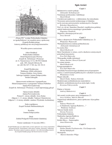 Spis treci Pismo PG wydaje Politechnika Gdañska za zgod¹ Rektora i na zasadzie pracy spo³ecznej Zespo³u Redakcyjnego. Autorzy publikacji nie otrzymuj¹ honorariów. Wszelkie prawa zastrze¿one Adres Redakcji Politechnika Gdañska Dzia³ Organizacyjno-Prawny Zespó³ ds. Informacji i Promocji ul. G. Narutowicza 11/12, 80-952 Gdañsk pok. 205, Gmach G³ówny B, tel. (48 58) 347 17 09, fax 341 58 21 Zespó³ Redakcyjny Waldemar Affelt (sekretarz), Tomasz Klajbor, Jerzy Kulas, Jadwiga Lipiñska, Joanna Sz³apczyñska Stefan Zabieglik Opracowanie techniczne i typograficzne Sk³ad komputerowy w programie Ventura Publisher Janina Poæwiardowska Zespó³ ds. Informacji i Promocji, e-mail [email protected] Opracowanie ok³adek Janina Poæwiardowska Pomys³ 1. strony ok³adki: Jerzy Kulas Zdjêcia 1. i 2. strony ok³adki: Tadeusz Chmielowiec Zdjêcia 3. i 4 strony ok³adki: studenci Wydzia³u Architektury Sta³a wspó³praca Zespó³ Technik Multimedialnych Korekta: Joanna Sz³apczyñska Druk: Zak³ad Poligrafii Politechniki Gdañskiej Numer zamkniêto 14 stycznia 2002 r. Zespó³ Redakcyjny nie odpowiada za treæ og³oszeñ i nie zwraca materia³ów niezamówionych. Zastrzegamy sobie prawo zmiany, skracania i adiustacji tekstów. Wyra¿one opinie s¹ spraw¹ autorów i nie odzwierciedlaj¹ stanowiska Zespo³u Redakcyjnego lub Kierownictwa Uczelni. Czêæ 1 Bohaterowie czasów pokoju Aleksander Ko³odziejczyk Nominacje profesorskie i habilitacje Marek Biziuk Utytu³owani naukowcy - z doktoratem, bez mieszkania Tworzenie uniwersytetu technicznego w Gdañsku na tle rozwoju uniwersytetów technicznych w Europie Boles³aw Mazurkiewicz Prof. zw. dr in¿. Stanis³aw Hueckel, wspó³twórca polskiej szko³y budownictwa morskiego i geotechniki Eugeniusz Dembicki Migawki z dawniejszych lat (cd.) Jerzy Sawicki Czêæ 2 Jeden z okrêtowców Politechniki Gdañskiej (cz. 2) W³adys³aw Wojnowski Wielopokoleniowa rodzina politechniczna Aleksander Ko³odziejczyk In exelsis Deo Marek Biedrzycki Bo¿e Narodzenie w sztuce, czyli o duchowo-estetycznych potrzebach in¿ynierów Ewa Dyk-Majewska Wiarygodne ród³o informacji Janusz Rachoñ, Henryk Szymczak Na setnej stronie... Marek Biedrzycki Ksiêga pami¹tkowa Ewa Dyk-Majewska Przyk³ady bezsensownego dzia³ania nowych przepisów ustawy o zamówieniach publicznych w szko³ach wy¿szych W³odzimierz Cichy Bogu odszed³... Marek Dzida, Tadeusz Kolenda Modelowanie architektoniczno-materia³owe obiektów architektonicznych na styku l¹du i wody Krystyna Pokrzywnicka Czêæ 3 Piêkno w betonie Andrzej Ma³asiewicz Czêæ 4 Jak oceniæ ryzyko pracy przy komputerze (7) Jerzy Grabosz, Marcin Sikorski Organizacje m³odzie¿owe, praca spo³eczna i dyscyplina studiów Tadeusz Witalewski ... tu Studencka Agencja Radiowa ..." Waldemar Sza³tynis Tañczyæ ka¿dy mo¿e Dorota Powierza Politechnika Gdañska Studencka Agencja Radiowa Mieczys³aw Serafin Krótki film o... Samorz¹dzie Anna Klonowska Czêæ 5 Obie¿ywiat (cd.) Emilia ¯muda-Trzebiatowska, Ula Kampowska Micha³ Ma³afiejski Metropolia Marcin Stanis³aw Wilga