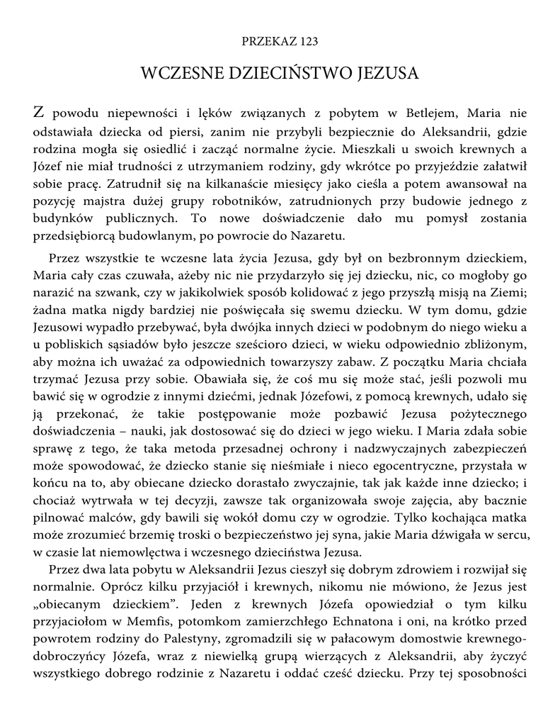 PRZEKAZ 123 WCZESNE DZIECIŃSTWO JEZUSA Z powodu niepewności i lęków związanych z pobytem w Betlejem, Maria nie odstawiała dziecka od piersi, zanim nie przybyli bezpiecznie do Aleksandrii, gdzie rodzina mogła się osiedlić i zacząć normalne życie. Mieszkali u swoich krewnych a Józef nie miał trudności z utrzymaniem rodziny, gdy wkrótce po przyjeździe załatwił sobie pracę. Zatrudnił się na kilkanaście miesięcy jako cieśla a potem awansował na pozycję majstra dużej grupy robotników, zatrudnionych przy budowie jednego z budynków publicznych. To nowe doświadczenie dało mu pomysł zostania przedsiębiorcą budowlanym, po powrocie do Nazaretu. Przez wszystkie te wczesne lata życia Jezusa, gdy był on bezbronnym dzieckiem, Maria cały czas czuwała, ażeby nic nie przydarzyło się jej dziecku, nic, co mogłoby go narazić na szwank, czy w jakikolwiek sposób kolidować z jego przyszłą misją na Ziemi; żadna matka nigdy bardziej nie poświęcała się swemu dziecku. W tym domu, gdzie Jezusowi wypadło przebywać, była dwójka innych dzieci w podobnym do niego wieku a u pobliskich sąsiadów było jeszcze sześcioro dzieci, w wieku odpowiednio zbliżonym, aby można ich uważać za odpowiednich towarzyszy zabaw. Z początku Maria chciała trzymać Jezusa przy sobie. Obawiała się, że coś mu się może stać, jeśli pozwoli mu bawić się w ogrodzie z innymi dziećmi, jednak Józefowi, z pomocą krewnych, udało się ją przekonać, że takie postępowanie może pozbawić Jezusa pożytecznego doświadczenia – nauki, jak dostosować się do dzieci w jego wieku. I Maria zdała sobie sprawę z tego, że taka metoda przesadnej ochrony i nadzwyczajnych zabezpieczeń może spowodować, że dziecko stanie się nieśmiałe i nieco egocentryczne, przystała w końcu na to, aby obiecane dziecko dorastało zwyczajnie, tak jak każde inne dziecko; i chociaż wytrwała w tej decyzji, zawsze tak organizowała swoje zajęcia, aby bacznie pilnować malców, gdy bawili się wokół domu czy w ogrodzie. Tylko kochająca matka może zrozumieć brzemię troski o bezpieczeństwo jej syna, jakie Maria dźwigała w sercu, w czasie lat niemowlęctwa i wczesnego dzieciństwa Jezusa. Przez dwa lata pobytu w Aleksandrii Jezus cieszył się dobrym zdrowiem i rozwijał się normalnie. Oprócz kilku przyjaciół i krewnych, nikomu nie mówiono, że Jezus jest „obiecanym dzieckiem”. Jeden z krewnych Józefa opowiedział o tym kilku przyjaciołom w Memfis, potomkom zamierzchłego Echnatona i oni, na krótko przed powrotem rodziny do Palestyny, zgromadzili się w pałacowym domostwie krewnegodobroczyńcy Józefa, wraz z niewielką grupą wierzących z Aleksandrii, aby życzyć wszystkiego dobrego rodzinie z Nazaretu i oddać cześć dziecku. Przy tej sposobności zgromadzeni przyjaciele ofiarowali Jezusowi kompletną kopię greckiego przekładu hebrajskiego Pisma Świętego. Jednak tej kopii żydowskiego, świętego piśmiennictwa, nie oddano w ręce Józefa tak długo, zanim oboje, on i Maria, nie zrezygnowali ostatecznie z zaproszenia przyjaciół z Memfis i Aleksandrii do pozostania w Egipcie. Wierzący ci obstawali przy tym, że dziecko przeznaczenia będzie mogło wywierać znacznie większy, światowy wpływ, jako mieszkaniec Aleksandrii, niż jakiegokolwiek miejsca w Palestynie. Namowy takie nieco opóźniły odjazd rodziny do Palestyny, po tym, jak otrzymano wieść o śmierci Heroda. Józef i Maria opuścili w końcu Aleksandrię statkiem, należącym do ich przyjaciela Ezraeona; odpłynęli w kierunku Jafy i przybyli do tego portu w końcu sierpnia, roku 4 p.n.e. Poszli prosto do Betlejem, gdzie cały miesiąc wrzesień spędzili na naradach z przyjaciółmi i krewnymi, rozważając, czy mają zostać tutaj czy wracać do Nazaretu. Maria nigdy nie wyzbyła się zupełnie idei, że Jezus powinien dorastać w Betlejem, mieście Dawida. Józef tak naprawdę nie wierzył, że ich syn mógłby zostać królewskim wybawicielem Izraela. Oprócz tego wiedział, że sam naprawdę nie jest potomkiem Dawida; to, że zaliczano go do potomstwa Dawida, zawdzięczał adopcji jednego ze swych przodków do rodu linii Dawidowej. Maria oczywiście uważała miasto Dawida za najbardziej odpowiednie miejsce, gdzie mógłby się wychowywać nowy kandydat do tronu Dawida, ale Józef wolał żyć raczej pod Herodem Antypasem niż pod jego bratem Archelausem. Żywił on znaczne obawy o bezpieczeństwo dziecka w Betlejem, czy w jakimkolwiek innym mieście Judei i przypuszczał, że prędzej Archelaus mógłby prowadzić niebezpieczną politykę swego ojca Heroda, niż Antypas w Galilei. A oprócz tego wszystkiego Józef szczerze wolał Galileę, jako lepsze miejsce dla wychowania i kształcenia dziecka, jednak upłynęło trzy tygodnie, zanim pokonał obiekcje Marii w tej sprawie. Do pierwszego października Józef przekonał Marię i wszystkich przyjaciół, że najlepiej będzie, gdy wrócą do Nazaretu. W związku z tym w początkach października, roku 4 p.n.e., wyszli z Betlejem do Nazaretu, idąc poprzez Liddę i Scytopolis. Wyszli wcześnie pewnego niedzielnego poranka, Maria i dziecko jechali na świeżo nabytym zwierzęciu jucznym, podczas gdy Józef i pięciu towarzyszących im krewnych szli pieszo; krewni Józefa nie chcieli się zgodzić na samotną podróż rodziny do Nazaretu. Bali się iść do Galilei przez Jerozolimę i dolinę Jordanu a zachodnie szlaki nie były zupełnie bezpieczne dla dwojga samotnych podróżnych z małym dzieckiem. 1. ZNOWU W NAZARECIE W czwartym dniu podróży grupa ta bezpiecznie dotarła do celu. Bez zapowiedzi przybyli do domu w Nazarecie, który przez ponad trzy lata zajmował jeden z żonatych braci Józefa, który był doprawdy zaskoczony, gdy zauważył, jak bez rozgłosu prowadzili swoje sprawy, że rodzina tak Józefa jak i Marii nie wiedziała nawet o tym, że opuścili Aleksandrię. Następnego dnia brat Józefa wyprowadził się z rodziną a Maria, 