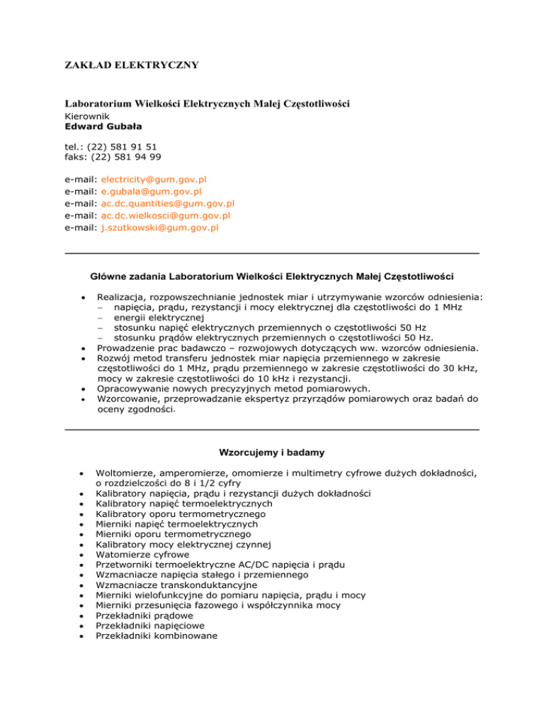 ZAKŁAD ELEKTRYCZNY Laboratorium Wielkości Elektrycznych Małej Częstotliwości Kierownik Edward Gubała tel.: (22) 581 91 51 faks: (22) 581 94 99 e-mail: e-mail: e-mail: e-mail: e-mail: [email protected] [email protected] [email protected] [email protected] [email protected] Główne zadania Laboratorium Wielkości Elektrycznych Małej Częstotliwości • • • • • Realizacja, rozpowszechnianie jednostek miar i utrzymywanie wzorców odniesienia: − napięcia, prądu, rezystancji i mocy elektrycznej dla częstotliwości do 1 MHz − energii elektrycznej − stosunku napięć elektrycznych przemiennych o częstotliwości 50 Hz − stosunku prądów elektrycznych przemiennych o częstotliwości 50 Hz. Prowadzenie prac badawczo – rozwojowych dotyczących ww. wzorców odniesienia. Rozwój metod transferu jednostek miar napięcia przemiennego w zakresie częstotliwości do 1 MHz, prądu przemiennego w zakresie częstotliwości do 30 kHz, mocy w zakresie częstotliwości do 10 kHz i rezystancji. Opracowywanie nowych precyzyjnych metod pomiarowych. Wzorcowanie, przeprowadzanie ekspertyz przyrządów pomiarowych oraz badań do oceny zgodności. Wzorcujemy i badamy • • • • • • • • • • • • • • • • Woltomierze, amperomierze, omomierze i multimetry cyfrowe dużych dokładności, o rozdzielczości do 8 i 1/2 cyfry Kalibratory napięcia, prądu i rezystancji dużych dokładności Kalibratory napięć termoelektrycznych Kalibratory oporu termometrycznego Mierniki napięć termoelektrycznych Mierniki oporu termometrycznego Kalibratory mocy elektrycznej czynnej Watomierze cyfrowe Przetworniki termoelektryczne AC/DC napięcia i prądu Wzmacniacze napięcia stałego i przemiennego Wzmacniacze transkonduktancyjne Mierniki wielofunkcyjne do pomiaru napięcia, prądu i mocy Mierniki przesunięcia fazowego i współczynnika mocy Przekładniki prądowe Przekładniki napięciowe Przekładniki kombinowane • • • • • Komparatory prądowe Woltomierze wysokiego napięcia Obciążenia przekładników prądowych i napięciowych Mostki do pomiaru błędów przekładników Liczniki energii elektrycznej Laboratorium działa zgodnie z wymaganiami normy PN EN ISO/IEC 17025 Wykaz usług pomiarowych Napięcie elektryczne, rezystancja, prąd elektryczny przemienny Lp. Usługa 1 Wzorcowanie multimetrów cyfrowych i cyfrowych woltomierzy napięcia stałego 2 Wzorcowanie kalibratorów wielofunkcyjnych i kalibratorów napięcia stałego Zakres pomiarowy 100 mV 6E-06 V/V 0,22 V do 1100 V 1E-05 V/V 10 mV do 100 mV 6E-06 V/V >0,1 V do 10 V 3E-06 V/V >10 V do 1000 V 3,5E-06 V/V 1 µA do 100 µA 3 4 5 6 Wzorcowanie multimetrów cyfrowych i cyfrowych amperomierzy prądu stałego Wzorcowanie kalibratorów wielofunkcyjnych i kalibratorów prądu stałego Wzorcowanie multimetrów cyfrowych i omomierzy cyfrowych Wzorcowanie kalibratorów wielofunkcyjnych i kalibratorów rezystancji Najlepsza zdolność pomiarowa 6E-05 + I0/I I0 = 10 nA, I w A >0,1 mA do 100 mA 7E-05 A/A >0,1 A do 1 A 1E-04 A/A >1 A do 10 A 4,5E-04 A/A 0,1 mA do 100 mA 2,2E-05 A/A >0,1 A do 1A 3E-05 A/A >1 A do 10 A 6E-05 A/A 1 Ω do 1,9 Ω 1E-04 Ω/Ω 10 Ω do190 Ω 3E-05 Ω/Ω 1 kΩ do190 kΩ 2E-05 Ω/Ω 1 MΩ do 1,9 MΩ 3E-05 Ω/Ω 10 MΩ do 19 MΩ 5E-05 Ω/Ω 100 MΩ 1,5E-04 Ω/Ω 1 Ω do 1,9 Ω 2E-05 Ω/Ω 0,01 kΩ do 190 kΩ 1E-05 Ω/Ω 0,3 MΩ do 19 MΩ 3E-05 Ω/Ω 7 Wzorcowanie multimetrów cyfrowych i cyfrowych woltomierzy napięcia przemiennego 30 MΩ do 100 MΩ 3E-04 Ω/Ω 1 mV do 10 mV (20 Hz ÷ 100 kHz) (1,5E-04 V/V do 9,9E-04) V/V >10 mV do 100 mV (20 Hz ÷ 100 kHz) (9,8E-05 V/V do 6,4E-04) V/V >0,1V do 1 V (10 Hz ÷ 1 MHz) (2,6E-05 V/V do 1,1E-03) V/V >1V do 10 V (10 Hz ÷ 1 MHz) (2,6E-0 5 V/V do 1,1E-03) V/V >10 V do 100 V (10 Hz ÷ 1MHz) (2,6E-05 V/V do 1,1E-03) V/V >100 V do 1000 V (10 Hz ÷ 100 kHz) (2,9E-05 V/V do 5,5E-04) V/V 1 mV do 100 mV (20 Hz ÷ 100 kHz) 1 V do 10 V (10 Hz ÷ 1 MHz) 8 Wzorcowanie kalibratorów wielofunkcyjnych i kalibratorów napięcia przemiennego 19 V 1 kHz >19 V do 100 V (10 Hz ÷ 100 kHz) 700 V (50 kHz ÷ 100 kHz) 9 10 11 Wzorcowanie multimetrów cyfrowych i cyfrowych amperomierzy prądu przemiennego Wzorcowanie kalibratorów wielofunkcyjnych i kalibratorów prądu przemiennego Wzorcowanie watomierzy cyfrowych prądu stałego DC (9,8E-05 V/V do 9,9E-04) V/V (2,6E-05 V/V do 1,1E-03) V/V 2,6E-05 V/V (2,9E-0 5 V/V do 1,0E-04) V/V (1,4E-04 V/V do 5,5E-04) V/V >700 V do 1000 V (40 Hz ÷ 30 kHz) (4,1E-05V/V do 9,6E-05) V/V 0,1 mA do 1 mA (10 Hz ÷ 5 kHz) (1,1E-04 A/A do 2,0E-04) A/A >1 mA do 1000 mA (10 Hz ÷ 5 kHz) (9,0E-05 A/A do 3,0E-04) A/A >1 A do 10 A (10 Hz ÷ 10 kHz) (1,2E-04 A/A do 8,0E-04) A/A 0,1 mA do 1000 mA (10 Hz ÷ 5 kHz) (9,0E-05 A/A do 3,0E-04) A/A >1 A do 10 A (10 Hz ÷ 10 kHz) (1,2E-04 A/A do 8,0E-04) A/A (0,033 ÷ 1000) V (0,33 ÷ 330) mA 3 E-04 W/W (0,033 ÷ 1000) V (0,33 ÷ 3) A 2,8 E-04 W/W (0,033 ÷ 1000) V (3 ÷ 20,5) A 9 E-04 W/W 12 13 14 Wzorcowanie watomierzy cyfrowych prądu przemiennego Wzorcowanie multimetrów i mierników cyfrowych (jako wskaźników temperatury, działających w oparciu o pomiar napięcia wytwarzanego przez termoelement lub w oparciu o pomiar rezystancji termometrów oporowych) Wzorcowanie kalibratorów wielofunkcyjnych i symulatorów temperatury (zadających wartości napięć stałych i rezystancji zgodnie z ustalonymi charakterystykami) (33 ÷ 330) mV (0,33 ÷ 0,90) A 2,1 E-03 W/W (33 ÷ 330) mV (0,9 ÷ 2,2) A 1,8 E-03 W/W (33 ÷ 330) mV (2,2 ÷ 4,5) A 2,1 E-03 W/W (33 ÷ 330) mV (4,5 ÷ 20,5) A 1,8 E-03 W/W (0,033 ÷ 1000) V (0,33 ÷ 0,90) A 1,8 E-03 W/W (0,033 ÷ 1000) V (0,9 ÷ 2,2) A 1,7 E-03 W/W (0,033 ÷ 1000) V (2,2 ÷ 4,5) A 1,9 E-03 W/W (0,033 ÷ 1000) V (4,5 ÷ 20,5) A 1,6 E-03 W/W (-270 ÷ 1820) °C 0,01 °C (-200 ÷ 850) °C 0,002 °C (-270 ÷ 1820) °C 0,01 °C (-200 ÷ 850) °C 0,002 °C 1) 2) 1) 2) 1) Wzorcowanie pośrednie z zastosowaniem znormalizowanych charakterystyk termoelektrycznych termoelementów, podanyc