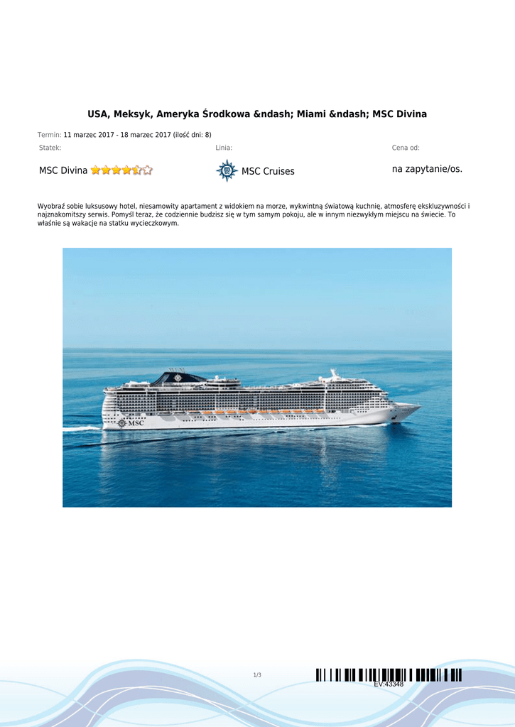 USA, Meksyk, Ameryka Środkowa – Miami – MSC Divina Termin: 11 marzec 2017 - 18 marzec 2017 (ilość dni: 8) Statek: MSC Divina Linia: Cena od: MSC Cruises na zapytanie/os. Wyobraź sobie luksusowy hotel, niesamowity apartament z widokiem na morze, wykwintną światową kuchnię, atmosferę ekskluzywności i najznakomitszy serwis. Pomyśl teraz, że codziennie budzisz się w tym samym pokoju, ale w innym niezwykłym miejscu na świecie. To właśnie są wakacje na statku wycieczkowym. 1/3 EV:43348 TRASA REJSU dzień 1 Data Port Wpłynięcie Wypłynięcie sobota 11.03.2017 Miami, Floryda --:-- 19:00 Stany Zjednoczone dzień 2 niedziela 12.03.2017 Dzień na morzu --:-- --:-- dzień 3 poniedziałek 13.03.2017 Ocho Rios 10:30 17:00 wtorek 14.03.2017 George Town, Wielki Kajman 09:00 16:00 środa 15.03.2017 Cozumel 10:00 18:00 dzień 6 czwartek 16.03.2017 Dzień na morzu --:-- --:-- dzień 7 piątek 17.03.2017 Nassau 12:00 18:00 07:00 --:-- dzień 4 dzień 5 dzień 8 sobota 18.03.2017 Legenda Jamajka Kajmany Meksyk Bahamy Miami, Floryda Stany Zjednoczone CENNIK Cena katalogowa Cena promocyjna Uwaga! Ceny za osobę w kabinie dwuosobowej. Cena zawiera: zakwaterowanie w kabinie wybranej kategorii; wyżywienie - 3 główne posiłki, przekąski między posiłkami, bufet lub przekąski o północy; napoje serwowane do śniadania i w bufetach samoobsługowych; serwis bagażowy podczas wejścia i zejścia ze statku; serwis kabinowy; korzystanie ze wszystkich urządzeń sportowo - rekreacyjnych znajdujących się na pokładzie statku (basen, jacuzzi, sala fitness, itp.); udział we wszystkich imprezach organizowanych na statku (przedstawienia w teatrze, koncerty, programy animacyjne itp.). Cena nie zawiera: kosztów dojazdu do portu; opłat portowych; ewentualnych noclegów w hotelu przed/po rejsie i transferów; wycieczek fakultatywnych w trakcie rejsu; korzystania z barów, mini baru w kabinie oraz napojów zamawianych w restauracji; korzystania z punktów usługowych 2/3 EV:43348 (fryzjer, pralnia, fotograf, salon piękności i odnowy biologicznej, internet) i wydatków osobistych; napiwków dla obsługi na statku (kwota uzależniona od długości rejsu); ubezpieczenia KL, NNW i bagaż, kosztów wiz (tam gdzie wymagane). Uwagi: na wszystkich rejsach MSC Cruises można zarezerwować pakiety all inclusive: Allegrissimo 24h: 26€/os./dzień i 12€/dziecko/dzień; Allegrissimo Premium: 44€/os./dzień i 21€/dziecko/dzień (pakiet musi być wykupiony przez każdą osobę zakwaterowaną w kabinie - można zakupić w biurze przed rejsem). Na Państwa życzenie zarezerwujemy przelot, transfery do/z portu, parking, dodatkowe noclegi oraz zadbamy o odpowiednie ubezpieczenie podróżne. 3/3 EV:43348