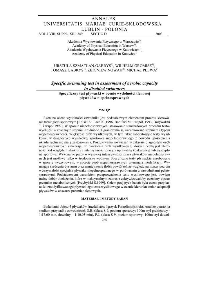 ANNALES UNIVERSITATIS MARIAE CURIE-SKŁODOWSKA LUBLIN - POLONIA VOL.LVIII, SUPPL. XIII, 249 SECTIO D 2003 Akademia Wychowania Fizycznego w Warszawie1), Academy of Physical Education in Warsaw1), Akademia Wychowania Fizycznego w Katowicach2), Academy of Physical Education in Katowice2) URSZULA SZMATLAN-GABRYŚ1), WILHELM GROMISZ1), TOMASZ GABRYŚ1), ZBIGNIEW NOWAK2), MICHAŁ PLEWA2) Specific swimming test in assessment of aerobic capacity in disabled swimmers Specyficzny test pływacki w ocenie wydolności tlenowej pływaków niepełnosprawnych WSTĘP Rzetelna ocena wydolności zawodnika jest podstawowym elementem procesu kierowania treningiem sportowym.[Rolski Z., Lach K.,1996, Bonifazi M. i współ. 1993, Dorywalski T. i współ.1992]. W sporcie niepełnosprawnych, stosowanie standardowych procedur testowych jest w znacznym stopniu utrudnione. Ograniczenia są warunkowane stopniem i typem niepełnosprawności. Większość prób wysiłkowych, w tym także laboratoryjne testy wysiłkowe, w diagnostyce wysiłkowej sportowca niepełnosprawnego z powodu upośledzenia układu ruchu nie mają zastosowania. Poszukiwania rozwiązań w zakresie diagnostyki osób niepełnosprawnych zmierzają, do określenia prób wysiłkowych, których cechą jest zbieżność pod względem struktury i intensywności pracy z uprawianą konkurencją lub dyscypliną sportową. Wykonanie pracy o wysokiej intensywności przez pływaków niepełnosprawnych jest możliwe tylko w środowisku wodnym. Specyficzne testy pływackie aprobowane w sporcie wyczynowym, w sporcie osób niepełnosprawnych wymagają modyfikacji. Wymagają skrócenia dystansu oraz zmniejszenie ilości powtórzeń ze względu na niższy poziom wytrzymałość specjalna pływaka niepełnosprawnego w porównaniu z zawodnikami pełnosprawnymi. Podstawowym warunkiem przeprowadzenia testu wysiłkowego jest, bowiem trafny dobór obciążenia, które w maksymalnym zakresie zaktywizowałoby oceniany obszar przemian metabolicznych [Przybylski S.1999]. Celem podjętych badań była ocena przydatności zmodyfikowanego pływackiego testu wysiłkowego w ocenie kierunku zmian adaptacji pływaków w obszarze przemian tlenowych. MATERIAŁ I METODY BADAŃ Badaniami objęto 4 pływaków (medalistów Igrzysk Paraolimpijskich). Analizę oparto na studium przypadku zawodniczek D.B. (klasa S 9, poziom sportowy: 100m styl grzbietowy 1:17.60 min, dowolny – 1:10.03 min), P.J. (klasa S 9, poziom sportowy: 100m styl dowol260 ny- 1:12.46 min), oraz zawodników M.M. (klasa S 10, poziom sportowy: 100m styl grzbietowy-1:02.31 min, 200m zmienny- 2:19.72, 100m klasyczny- 1:14.63, 400m dowolny4:32.14) i M.R.(klasa S 12, poziom sportowy: 100m styl klasyczny- 1:15.16, 100m dowolny- 4:33.39). W ocenie wydolności tlenowej posłużono się modyfikacją pływackiego testu 8×200m (Bonifazi M i współ. 1999). W celu przystosowania testu do możliwości wysiłkowych pływaków niepełnosprawnych zredukowano ilość powtórzeń do czterech odcinków. Badanych poddano wysiłkowi pływackiemu 4×200m, w którym każdy kolejny odcinek był pokonywany ze wzrastająca szybkością (odpowiednio 60%, 75%, 85%, 95% prędkości maksymalnej). Między odcinkami następowała 3 minutowa przerwa, podczas której pobierano krew w celu dokonania pomiaru stężenia mleczanu. (Kosmol i in. 2000) W oznaczaniu wartości stężenia mleczanu, posługiwano się odczynnikami f. Dr.Lange (Niemcy). Założono poziom 4 mmol×l-1 jako wartość progu beztlenowego(AT). Za prędkość odpowiadającą progowi przemian beztlenowych (VAT) przyjęto prędkość, przy której nastąpiło przekroczenie powyższej wartości. Podczas testu rejestrowano czas każdego odcinka oraz maksymalny poziom stężenia mleczanu w 4 min po wysiłku. Ze względu na znaczne zróżnicowanie badanej grupy pod względem specjalizacji sportowej oraz stopnia niepełnosprawności, nie przeprowadzono analizy z wykorzystaniem metod statystycznych. Podjęto natomiast próbę indywidualnej analizy i oceny charakteru i kierunku zmian w adaptacji wysiłkowej dokonanej na podstawie rezultatów przeprowadzonego testu wysiłkowego, w celu oceny jego przydatności w diagnostyce wydolności pływaków niepełnosprawnych. REZULTATY BADAŃ Prędkość, z którą badani pokonywali kolejne odcinki, podczas próby wysiłkowej oceniającej poziom wydolności tlenowej przedstawiono w tab.1. Na ryc 1a-d przedstawiono charakterystykę kinetyki stężenia mleczanu wyznaczoną na podstawie wartości rejestrowanych u każdego z badanych po kolejnych odcinkach. Zawodniczka P.J., podczas drugiego badania, a więc po 2 tygodniowym okresie treningu, odcinek 3 i 4 dystansu 200 metrowego pokonała z prędkością niższą w porównaniu do wartości rejestrowanych przed rozpoczęciem bezpośredniego przygotowania startowego. Zaobserwowano, także obniżenie prędkości odpowiadającej intensywności, przy której następowało przekroczenie progu przemian beztlenowych. Był to pierwszy sygnał informujący o wystąpieniu zakłóceń procesu adaptacji wysiłkowej. Zwróciło naszą uwagę, wcześniejsze ( przy niższej prędkości) uzyskanie VAT. Już po drugim odcinku poziom stężenia mleczanu we krwi znacznie przekroczył wartość 4 mmol×l-1 (4.47 mmol×l-1), podczas gdy przed rozpoczęciem dwutygodniowego okresu BPS, drugi odcinek pokonywany był z prędkością zbliżoną, a kwalifikowana do grupy prędkości podprogowych. Spadek prędkości na ostatnim odcinku o 0.16 m×s-1 w stosunku do rejestrowanego podczas pierwszego badania oraz niski poziom maksymalnego stężenia mleczanu we krwi po zakończeniu próby wysiłkowej wskazuje, na obniżenie także zdolności do pracy z prędkością ponadprogową jakie nastąpiło w analizowanym okresie treningu. U zawodniczki D.B. obserwujemy natomiast odwrotną prawidłowość. Prędkość progowa odpowiada tak jak podczas pierwszego badania kontrolnego, trzeciemu obciążeniu wysiłkowemu. Zaobserwowano wzrost dyspozycji w zak