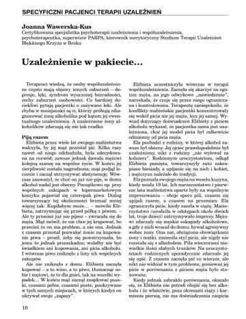 SPECYFICZNI PACJENCI TERAPII UZALEŻNIEŃ Joanna Wawerska-Kus Certyfikowana specjalistka psychoterapii uzależnienia i współuzależnienia, psychoterapeutka, superwizor PARPA, kierownik merytoryczny Studium Terapii Uzależnień Błękitnego Krzyża w Broku Uzależnienie w pakiecie… Terapeuci wiedzą, że osoby współuzależnione często mają objawy innych zaburzeń – depresje, lęki, syndrom wyuczonej bezradności, cechy zaburzeń osobowości. Co bardziej dociekliwi pytają pacjentki o zażywane leki. Ale chyba w mniejszości są ci, którzy próbują zdiagnozować żonę alkoholika pod kątem jej ewentualnego uzależnienia. A uzależnione żony alkoholików zdarzają się nie tak rzadko. Piją razem Elżbieta przez wiele lat swojego małżeństwa walczyła, by jej mąż przestał pić. Kilka razy nawet od niego odchodziła, była zdecydowana na rozwód; zawsze jednak dawała mężowi kolejną szansę na wspólne życie. W końcu jej cierpliwość została nagrodzona; mąż podjął leczenie i zaczął utrzymywać abstynencję. Wówczas zauważył, że choć on już nie pije, w domu alkohol nadal jest obecny. Początkowo np. przy wspólnych zakupach w hipermarketowym koszyku pojawiał się czteropak piwa. Dialog towarzyszący tej okoliczności brzmiał mniej więcej tak: Kupiłabym może… – mówiła Elżbieta, zatrzymując się przed półką z piwem. – Ale ty przecież już nie pijesz – zwracała się do męża. Mąż mówił, że nie chce jej krępować, bo przecież to on ma problem, a nie ona. Jednak z czasem przestał pozwalać żonie na kupowanie piwa – prosił, żeby się powstrzymała, bo jemu to jednak przeszkadza; wolałby nie być świadkiem ani kupowania, ani picia alkoholu. I wówczas piwo zniknęło z listy ich wspólnych zakupów. Ale nie zniknęło z domu. Elżbieta zaczęła kupować – a to wino, a to piwo, tłumacząc sobie i mężowi, że to dla gości, tak na wszelki wypadek… W końcu mąż zaczął znajdować puszki, czasami pełne, czasami puste, poukrywane w tych samych miejscach, w których kiedyś on ukrywał swoje „zapasy”. 10 Elżbieta uczestniczyła wówczas w terapii współuzależnienia. Zaczęła się skarżyć na egoizm męża, na jego odwykowe „nawiedzenie”, narzekała, że czuje się przez niego ograniczana i kontrolowana. Terapeutę zaniepokoiło, że konflikty małżeńskie pacjentki koncentrowały się wokół picia nie jej męża, lecz jej samej. Wywiad dotyczący doświadczeń Elżbiety z piciem alkoholu wykazał, że pacjentka sama jest uzależniona, choć jej model picia był całkowicie odmienny od picia męża. Ela pochodzi z rodziny, w której alkohol zawsze był obecny. Jej ojciec prawdopodobnie był uzależniony, nikt z rodziny „nie wylewał za kołnierz”. Rodzinnym uroczystościom, odkąd Elżbieta pamięta, towarzyszyły suto zakrapiane biesiady, a upijanie się na nich i kobiet, i mężczyzn należało do tradycji. Ela poznała swojego męża na weselu kuzyna, kiedy miała 19 lat. Ich narzeczeństwo i pierwsze lata małżeństwa oparte były na wspólnym imprezowaniu – oboje sporo pili, czasem się upijali razem, a czasem na przemian. Ela ograniczyła picie, kiedy zaszła w ciążę. Macierzyństwo (urodziła w odstępach około dwóch lat, troje dzieci) zatrzymywało imprezy. Mężowi zdarzały się męskie eskapady alkoholowe, a gdy z nich wracał do domu, bywał agresywny wobec żony. Ona zaś, obciążona obowiązkami żony i matki, zmieniła styl picia, ale nigdy nie rozstała się z alkoholem. Piła wieczorami niewielkie ilości słabych trunków. Na uroczystościach rodzinnych sporadycznie zdarzało jej się upić. Z czasem zaczęła pić co wieczór, ale nikt nie widział w tym problemu, ponieważ jej picie w porównaniu z piciem męża było stonowane. Kiedy jednak zabrakło porównania, okazało się, że Elżbieta nie potrafi obejść się bez alkoholu i że właściwie, poza okresami ciąży i karmienia piersią, nie ma doświadczenia niepicia SPECYFICZNI PACJENCI TERAPII UZALEŻNIEŃ Pije, żeby było mniej dla niego Historia Anny jest historią powolnego rezygnowania z siebie na rzecz utrzymania związku i rodziny za wszelką cenę. Małżeństwo Anny od początku nie układało się dobrze. Ale w jej środowisku trzeba było wyjść za mąż, gdy już doszło do współżycia i nieplanowanej ciąży; naciski ze strony rodziny nie pozostawiały wielkiego pola manewru. Anna założyła rodzinę ze swoim pierwszym mężczyzną, który okazał się niedojrzały do roli ojca i męża. Był przy tym uroczy, niefrasobliwy i beztroski. Anna wręcz przeciwnie – zawsze brała na siebie odpowiedzialność za innych; przyzwyczajona do opieki nad młodszym rodzeństwem, weszła w rolę matki bez większych problemów. Z rolą żony było nieco gorzej, bo mąż raczej przypominał dziecko, którym należało się zająć, a nawet może wychować, niż dorosłego mężczyznę dającego rodzinie wsparcie i poczucie bezpieczeństwa. Anna nawet nie zauważyła, kiedy zaczęła funkcjonować jak jedyna dorosła w swoim domu. Im ona bardziej starała się stawiać czoło obowiązkom i powinnościom, tym mąż bardziej starał się od nich uwolnić. Znikał z domu na kilka dni, tracił pieniądze, pił, spotykał się z innymi kobietami. Im bardziej Anna próbowała go zawstydzać, wywoływać w nim poczucie winy, odwoływać się do jego poczucia obowiązku i odpowiedzialności, tym bardziej oddalał się, choć zawsze wracał skruszony, prosząc o wybaczenie i obiecując, że nigdy więcej. Po wyczerpaniu innych środków nacisku Anna wpadła na pomysł, że najskuteczniejszym sposobem na zatrzymanie męża w domu będzie uatrakcyjnienie mu tego domu na jego warunkach. Oznaczało to dostępność alkoholu oraz towarzystwa na miejscu. Organizowała atrakcje domowe; zapraszała i pozwalała zapraszać każdego, kogo tylko mąż chciał. Przez ich dom przewijały się tłumy mężczyzn i kobiet. Syn Anny zarea