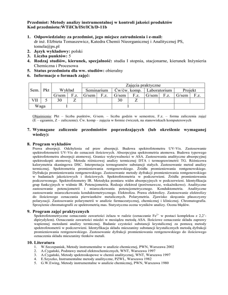 Przedmiot: Metody analizy instrumentalnej w kontroli jakości