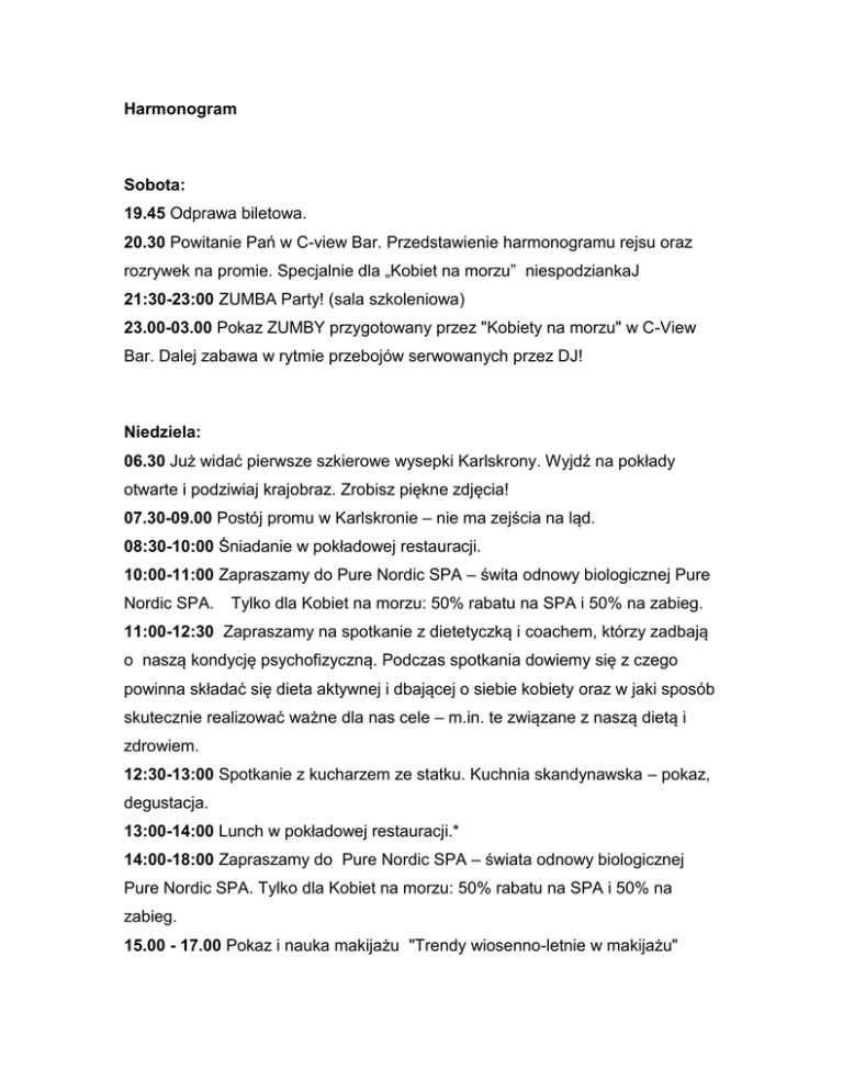 Harmonogram Sobota: 19.45 Odprawa biletowa. 20.30 Powitanie Pań w C-view Bar. Przedstawienie harmonogramu rejsu oraz rozrywek na promie. Specjalnie dla „Kobiet na morzu” niespodziankaJ 21:30-23:00 ZUMBA Party! (sala szkoleniowa) 23.00-03.00 Pokaz ZUMBY przygotowany przez "Kobiety na morzu" w C-View Bar. Dalej zabawa w rytmie przebojów serwowanych przez DJ! Niedziela: 06.30 Ju wida pierwsze szkierowe wysepki Karlskrony. yjd na pok ady otwarte i podziwiaj krajobraz. robisz pi kne zdj cia! 07.30-09.00 Postój promu w Karlskronie – nie ma zej cia na l d. 08:30-10:00 Śniadanie w pok adowej restauracji. 10:00-11:00 Zapraszamy do Pure Nordic SPA – wita odnowy biologicznej Pure Nordic SPA. Tylko dla Kobiet na morzu: 50% rabatu na SPA i 50% na zabieg. 11:00-12:30 apraszamy na spotkanie z dietetyczk i coachem, którzy zadbaj o nasz kondycj psychofizyczn . Podczas spotkania dowiemy si z czego powinna sk ada si dieta aktywnej i dbaj cej o siebie kobiety oraz w jaki sposób skutecznie realizowa wa ne dla nas cele – m.in. te zwi zane z nasz diet i zdrowiem. 12:30-13:00 Spotkanie z kucharzem ze statku. Kuchnia skandynawska – pokaz, degustacja. 13:00-14:00 Lunch w pok adowej restauracji.* 14:00-18:00 Zapraszamy do Pure Nordic SPA – wiata odnowy biologicznej Pure Nordic SPA. Tylko dla Kobiet na morzu: 50% rabatu na SPA i 50% na zabieg. 15.00 - 17.00 Pokaz i nauka makija u "Trendy wiosenno-letnie w makija u" 15:00-18:30 Popo udnie z ekspertami. apraszamy na indywidualne spotkania i konsultacje z: · iza ystk – wykonaj efektowny makija i dowiedz si jak malowa si na co dzień, aby wydobywa swoje naturalne pi kno. · Dietetyczk – wykonaj profesjonalny pomiar sk adu cia a i uzyskaj porad dotycz c Twojego sposobu od ywiania. · Coachem – dowiedz si jak dba o jako swojego ycia. 17.30-19.30 Ostatnia szansa na zakupy w pok adowym sklepie. Dla uczestniczek rejsu specjalne zni ki – 15% na wybrane kosmetyki! 19.30 ej cie na l d w dyni. Do zobaczenia