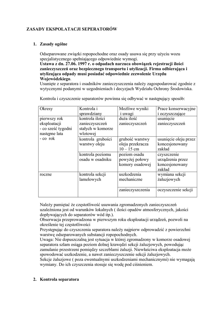 ZASADY EKSPOLATACJI SEPERATORÓW 1. Zasady ogólne Odseparowane związki ropopochodne oraz osady usuwa się przy użyciu wozu specjalistycznego spełniającego odpowiednie wymogi. Ustawa z dn. 27.06. 1997 r. o odpadach narzuca obowiązek rejestracji ilości zanieczyszczeń oraz bezpiecznego transportu i utylizacji. Firma odbierająca i utylizująca odpady musi posiadać odpowiednie zezwolenie Urzędu Wojewódzkiego. Usunięte z separatora i osadników zanieczyszczenia należy zagospodarować zgodnie z wytycznymi podanymi w uzgodnieniach i decyzjach Wydziału Ochrony Środowiska. Kontrola i czyszczenie separatorów powinna się odbywać w następujący sposób: Okresy pierwszy rok eksploatacji - co sześć tygodni następne lata - co rok Kontrola i sprawdziany kontrola ilości zanieczyszczeń stałych w komorze wlotowej kontrola grubości warstwy oleju kontrola poziomu osadu w osadniku roczne kontrola sekcji lamelowych Możliwe wyniki i uwagi duża ilość zanieczyszczeń Prace konserwacyjne i oczyszczające usunięcie zanieczyszczeń grubość warstwy oleju przekracza 10 – 15 cm poziom osadu powyżej połowy komory osadowej uszkodzenia mechaniczne usunięcie oleju przez koncesjonowany zakład czyszczenie urządzenia przez koncesjonowany zakład wymiana sekcji żaluzjowych zanieczyszczenia oczyszczenie sekcji Należy pamiętać że częstotliwość usuwania zgromadzonych zanieczyszczeń uzależniona jest od warunków lokalnych ( ilości opadów atmosferycznych, jakości dopływających do separatorów wód itp.). Obserwacja przeprowadzona w pierwszym roku eksploatacji urządzeń, pozwoli na określenie tej częstotliwości Przystępując do czyszczenia separatora należy najpierw odprowadzić z powierzchni warstwę odseparowanych substancji ropopochodnych. Uwaga: Nie dopuszczalną jest sytuacja w której zgromadzony w komorze osadowej separatora szlam osiąga poziom dolnej krawędzi sekcji żaluzjowych, powodując zamulanie przestrzeni pomiędzy szczeblami żaluzji. Niewłaściwa eksploatacja może spowodować uszkodzenie, a nawet zanieczyszczenie sekcji żaluzjowych. Sekcje żaluzjowe ( poza ewentualnymi uszkodzeniami mechanicznymi) nie wymagają wymiany. Do ich czyszczenia stosuje się wodę pod ciśnieniem. 2. Kontrola separatora Kontrola separatora polega na: - oględzinach pokrywy i kontrola włazów - otwarcie włazów - przegląd otworów wlotowych i wylotowych - usunięcie zgromadzonych w komorze wlotowej liści, gałęzi i innych zanieczyszczeń - zamknięcie włazów - sprawdzenie ilości osadu zgromadzonego w osadniku przed separatorem Jeżeli w czasie kontroli zostanie stwierdzona duża ilość zatrzymanego osadu lub substancji ropopochodnych należy przystąpić do czyszczenia separatora lub osadnika. 3. Czyszczenie separatora Czyszczenie separatora polega na: - całkowitym usunięciu substancji ropopochodnych i wody z separatora przy użyciu specjalistycznego sprzętu. - wyciągnięcie sekcji żaluzjowych i ich oczyszczenie oraz ewentualna wymiana uszkodzonych - usunięcie osadu z komory osadowej - oczyszczenie i kontrola wnętrza separatora - wstawienie sekcji żaluzjowych - napełnienie separatora wodą - zamknięcie włazów Uwaga : Czyszczeniu podlegają również osadniki współpracujące z separatorami 4. Ilość osadu Ilość roczna osadu przeznaczona do neutralizacji obliczono w oparciu o pojemności separatorów i osadników ZESTAWIENIE ILOŚCI OSADÓW dla separatorów zabudowane na drodze wojewódzkiej nr 945 – Korbielów – Krzyżowa LP Opis pozycji 1 1 2 2 Jedn. Ilość dm3/rok Uwagi 3 4 5 Kolektor K-1 Seperator lamelowy Unicon System typ UNICON 40/400s Unisep Qn = 40 dm3/s dm3/r Qmax = 400 dm3/s V = 2650 Osadnik betonowy ф 1500 dm3/r V = 2,5 m3 Razem dm3/r 2650,0 1250,0 3900,0 1 2 1 2 1 3 1 2 1 2 Kolektor K-2 Seperator lamelowy Unicon System typ UNICON 10/100 Unisep Qn = 10 dm3/s dm3/r 3 Qmax = 100 dm /s V = 1700,0 dm3 Osadnik betonowy ф 1500 dm3/r 3 V = 2,0 m Razem dm3 Kolektor K-3 Seperator lamelowy Unicon System typ UNICON 10/100 Unisep Qn = 10 dm3/s dm3/r 3 Qmax = 100 dm /s V = 1700,0 dm3 Osadnik betonowy ф 1500 dm3/r 3 V = 2,0 m Razem dm3 Kolektor K-4 Seperator lamelowy Unicon System typ UNICON 20/200s Unisep Qn = 20 dm3/s dm3/r 3 Qmax = 200 dm /s V = 2650,0 Osadnik betonowy ф 1500 dm3/r 3 V = 2,5 m Razem dm3 Kolektor K-4a Seperator lamelowy Unicon System typ UNICON 10/100 Unisep Qn = 10 dm3/s dm3/r 3 Qmax = 100 dm /s V = 1700,0 dm3 Osadnik betonowy ф 1500 dm3/r 3 V = 2,0 m Razem dm3 Kolektor K-5 i 5a Seperator lamelowy Unicon System typ UNICON 10/100 Unisep Qn = 10 dm3/s dm3/r 3 Qmax = 100 dm /s V = 1700,0 dm3 Osadnik betonowy ф 1500 dm3/r 3 V = 2,0 m Razem dm3/r Ogółem dm3/r 1700,0 1000,0 2700,0 1700,0 1000,0 2700,0 2650,0 1250,0 3900,0 1700,0 1000,0 2700,0 1700,0 1000,0 2700,0 18600,0