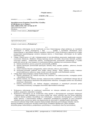 Załącznik nr 2 - Projekt umowy UMOWA NR ………. zawarta w ...................... w dniu ................. pomiędzy: Specjalistycznym Zespołem Chorób Płuc i Gruźlicy 43-360 Bystra, ul. J. Fałata 2, KRS: 0000114709; NIP: 937-00-10-797 reprezentowanym przez: Dyrektora - ………………………………………. zwanym w treści umowy „Zamawiającym” a ..................................................................................... ..................................................................................... reprezentowanym przez: ………… - ……………………………………….. zwanym w treści umowy „Wykonawcą”. §1 Wykonawca zobowiązuje się do świadczenia na rzecz Zamawiającego usługi pralniczej, na warunkach określonych w ofercie przetargowej z dnia ………., zgodnie z warunkami określonymi przez Zamawiającego w specyfikacji istotnych warunków zamówienia, z którą Wykonawca zapoznał się na etapie postępowania poprzedzającego zawarcie niniejszej umowy, a Zamawiający zobowiązuje się do zapłaty umówionej ceny. 2. Usługa, o której mowa w § 1 pkt 1 obejmuje pranie (w tym dezynfekcję, prasowanie, maglowanie, suszenie, czyszczenie chemiczne, składanie), bieŜącą reperację (szycie, cerowanie, doszywanie tasiemek, guzików, wszywanie zamków, oznakowanie odzieŜy, wyselekcjonowanie asortymentu uszkodzonego w wyniku prania lub zuŜycia itp.) oraz transport n/w asortymentu bielizny szpitalnej oraz asortymentu róŜnego: a) bielizna pościelowa: poszwy, poszewki, prześcieradła, podkłady b) bielizna operacyjna: prześcieradła operacyjne, fartuchy, bluzy, spodnie, spódnice, pokrowce, koszule chirurgiczne, c) odzieŜ ochronna lekarska i pielęgniarska, odzieŜ ochronna, robocza pracowników, d) asortyment pozostały: poduszki, koce, kołdry, obrusy, piŜamy, firany, materace zwykłe i materace przeciwodleŜynowe, pokrowce, mopy, ścierki, serwetki, ręczniki, worki bieliźniarki, narzuty. 3. Usługą objęte będą następujące rodzaje brudnej bielizny szpitalnej: a) bielizna zabrudzona, tzn. bielizna uŜywana, nie zakaŜona i nie zanieczyszczona, wymagająca prania i dezynfekcji termicznej; b) bielizna skaŜona, tzn. bielizna uŜywana, zanieczyszczona wydalinami i wydzielinami chorego lub od chorego z rozpoznanym zakaŜeniem lub podejrzeniem zakaŜenia, wymagająca prania oraz dezynfekcji termicznej i chemicznej; c) bielizna termowraŜliwa, tzn. bielizna ulegająca uszkodzeniu w normalnych procesach prania i dezynfekcji termicznej, wymagająca stosowania odpowiednich technologii. 1. §2 Wykonawca zobowiązuje się zrealizować zamówienie we własnym zakładzie przy uŜyciu własnych środków, preparatów, materiałów i urządzeń. 2. Wykonawca zobowiązuje się do świadczenia usług zgodnie z obowiązującymi wymogami sanitarnymi i higienicznymi, jakie nakładane są na proces prania (np. odzieŜ ochronna musi być prana oddzielnie a pościel skaŜona poddana dezynfekcji) oraz technologią i warunkami obowiązującymi w placówkach słuŜby zdrowia, z zastosowaniem środków i preparatów posiadających wymagane na mocy przepisów odrębnych atesty, pozytywne opinie oraz dopuszczenia do stosowania w zakładach opieki zdrowotnej. UŜywane do realizacji usługi środki i preparaty będą posiadały dokumenty potwierdzające aktualny wpis do Rejestru Produktów Leczniczych, Wyrobów medycznych i Produktów Biobójczych. Zakres działania dezynfekcyjnego: bakteriobójczy, proątkobójczy, grzybobójczy i wirusobójczy musi być potwierdzony 1. 12 _________________________________________________________________________________________ Załącznik do SIWZ – postępowanie nr: 11/EZP/380/EAE/3/2012 pozytywna opinią zakładu, którego metodyka badań skuteczności produktów biobójczych i substancji czynnych jest akceptowana Przez Prezesa Urzędu Rejestracji Produktów Leczniczych, Medycznych i Produktów Biobójczych oraz Głównego Inspektora Sanitarnego. Wykonawca na prośbę Zamawiającego przedstawi w/w dokumenty. Ponadto wszystkie do realizacji usługi środki i preparaty winny gwarantować właściwą jakość prania bez powodowania przyspieszonego zuŜycia bielizny oraz uczuleń u pacjentów oraz właściwą jakość dezynfekcji środków transportu. 3. Na kaŜde Ŝądanie Zamawiającego Wykonawca zobowiązany jest okazać w stosunku do wskazanych środków i preparatów stosowne dokumenty, o których mowa w pkt. 2. §3 Wykonawca zobowiązuje się do spełnienia dodatkowych wymagań dotyczących świadczonej usługi: • Zabezpieczenia czystej bielizny poprzez pakowanie do zamykanych worków foliowych zgodnie z oznaczeniem komórek organizacyjnych wg. asortymentu (nie więcej niŜ po 5 szt. poszw, po 10 szt. pozostałego asortymentu, po 1 szt. koców, poduszek oraz kołder); • Transportowania bielizny fasonowej pakowanej do worków na wieszakach; • Płukania bielizny fasonowej przy uŜyciu płynu antystatycznego; • Maglowania bielizny pościelowej, ubrań i fartuchów operacyjnych; • Prasownia bielizny fasonowej; • Opisywania worków z czystą bielizną asortymentowo a takŜe oznaczania wagowo fartuchów operacyjnych i bielizny fasonowej; • Doznakowania pościeli zgodnie z oznaczeniem komórek organizacyjnych • NaleŜytego wypełniania dokumentacji - „ Dowodów przekazania bielizny” brudnej i czystej bielizny na drukach szpitalnych z wyszczególnieniem róŜnic między ilością prania brudnego otrzymanego ze Szpitala a stanem faktycznym: • Świadczenia usługi w cyklu 24-godzinnym; • Wykonania usługi pralniczej w zakładzie posiadającym barierę higieniczną; • Transportowania bielizny samochodem posiadającym wydzieloną część brudną oraz czystą, mytym i dezynfekowanym z odpowiednią częstotliwością zgodnie z zaleceniami Głównego Inspektora Sanitarnego oraz PZH; • Dysponowania przez okres realizacji umowy komorą dezynfekcyjną: własną, wynajętą, dzierŜawioną lu
