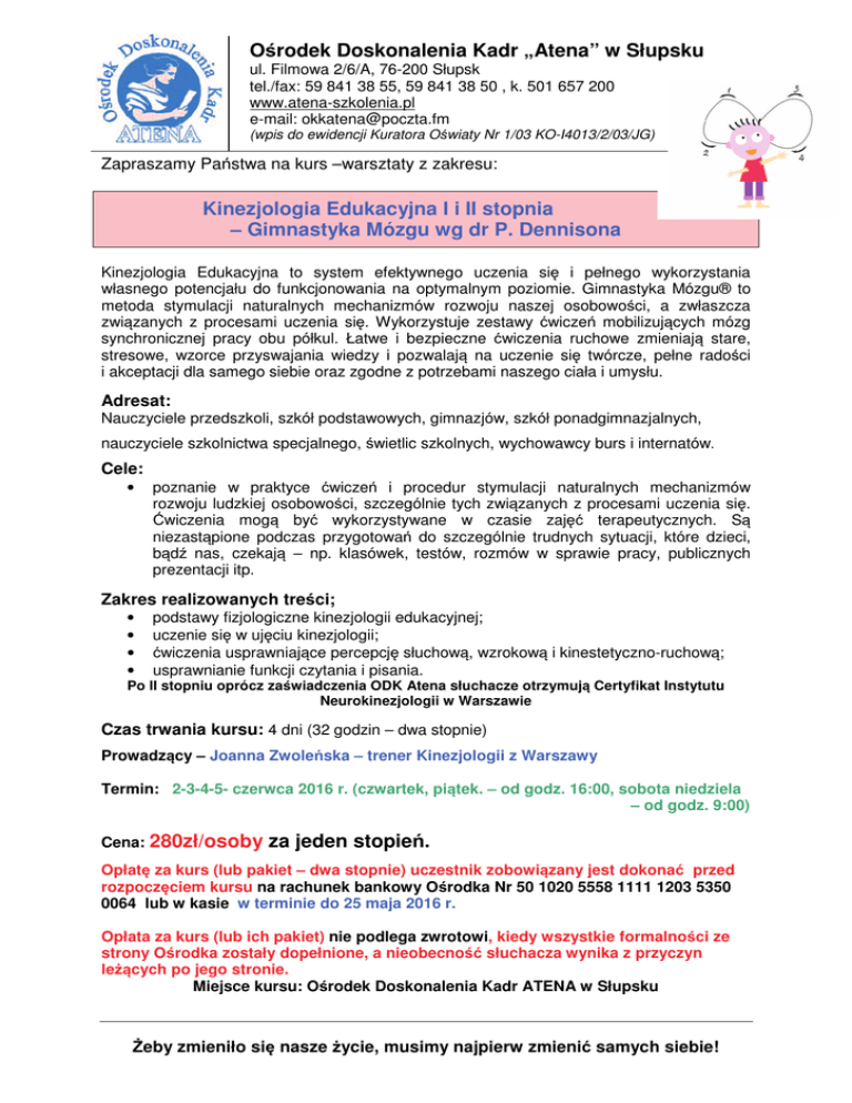 Ośrodek Doskonalenia Kadr „Atena” w Słupsku ul. Filmowa 2/6/A, 76-200 Słupsk tel./fax: 59 841 38 55, 59 841 38 50 , k. 501 657 200 www.atena-szkolenia.pl e-mail: [email protected] (wpis do ewidencji Kuratora Oświaty Nr 1/03 KO-I4013/2/03/JG) Zapraszamy Państwa na kurs –warsztaty z zakresu: Kinezjologia Edukacyjna I i II stopnia – Gimnastyka Mózgu wg dr P. Dennisona Kinezjologia Edukacyjna to system efektywnego uczenia się i pełnego wykorzystania własnego potencjału do funkcjonowania na optymalnym poziomie. Gimnastyka Mózgu® to metoda stymulacji naturalnych mechanizmów rozwoju naszej osobowości, a zwłaszcza związanych z procesami uczenia się. Wykorzystuje zestawy ćwiczeń mobilizujących mózg synchronicznej pracy obu półkul. Łatwe i bezpieczne ćwiczenia ruchowe zmieniają stare, stresowe, wzorce przyswajania wiedzy i pozwalają na uczenie się twórcze, pełne radości i akceptacji dla samego siebie oraz zgodne z potrzebami naszego ciała i umysłu. Adresat: Nauczyciele przedszkoli, szkół podstawowych, gimnazjów, szkół ponadgimnazjalnych, nauczyciele szkolnictwa specjalnego, świetlic szkolnych, wychowawcy burs i internatów. Cele: • poznanie w praktyce ćwiczeń i procedur stymulacji naturalnych mechanizmów rozwoju ludzkiej osobowości, szczególnie tych związanych z procesami uczenia się. Ćwiczenia mogą być wykorzystywane w czasie zajęć terapeutycznych. Są niezastąpione podczas przygotowań do szczególnie trudnych sytuacji, które dzieci, bądź nas, czekają – np. klasówek, testów, rozmów w sprawie pracy, publicznych prezentacji itp. Zakres realizowanych treści; • • • • podstawy fizjologiczne kinezjologii edukacyjnej; uczenie się w ujęciu kinezjologii; ćwiczenia usprawniające percepcję słuchową, wzrokową i kinestetyczno-ruchową; usprawnianie funkcji czytania i pisania. Po II stopniu oprócz zaświadczenia ODK Atena słuchacze otrzymują Certyfikat Instytutu Neurokinezjologii w Warszawie Czas trwania kursu: 4 dni (32 godzin – dwa stopnie) Prowadzący – Joanna Zwoleńska – trener Kinezjologii z Warszawy Termin: 2-3-4-5- czerwca 2016 r. (czwartek, piątek. – od godz. 16:00, sobota niedziela – od godz. 9:00) Cena: 280zł/osoby za jeden stopień. Opłatę za kurs (lub pakiet – dwa stopnie) uczestnik zobowiązany jest dokonać przed rozpoczęciem kursu na rachunek bankowy Ośrodka Nr 50 1020 5558 1111 1203 5350 0064 lub w kasie w terminie do 25 maja 2016 r. Opłata za kurs (lub ich pakiet) nie podlega zwrotowi, kiedy wszystkie formalności ze strony Ośrodka zostały dopełnione, a nieobecność słuchacza wynika z przyczyn leżących po jego stronie. Miejsce kursu: Ośrodek Doskonalenia Kadr ATENA w Słupsku Żeby zmieniło się nasze życie, musimy najpierw zmienić samych siebie!
