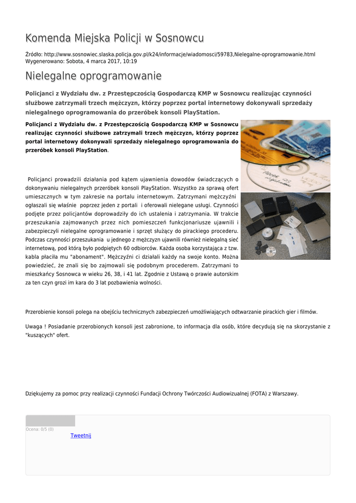Komenda Miejska Policji w Sosnowcu Źródło: http://www.sosnowiec.slaska.policja.gov.pl/k24/informacje/wiadomosci/59783,Nielegalne-oprogramowanie.html Wygenerowano: Sobota, 4 marca 2017, 10:19 Nielegalne oprogramowanie Policjanci z Wydziału dw. z Przestępczością Gospodarczą KMP w Sosnowcu realizując czynności służbowe zatrzymali trzech mężczyzn, którzy poprzez portal internetowy dokonywali sprzedaży nielegalnego oprogramowania do przeróbek konsoli PlayStation. Policjanci z Wydziału dw. z Przestępczością Gospodarczą KMP w Sosnowcu realizując czynności służbowe zatrzymali trzech mężczyzn, którzy poprzez portal internetowy dokonywali sprzedaży nielegalnego oprogramowania do przeróbek konsoli PlayStation. Policjanci prowadzili działania pod kątem ujawnienia dowodów świadczących o dokonywaniu nielegalnych przeróbek konsoli PlayStation. Wszystko za sprawą ofert umieszcznych w tym zakresie na portalu internetowym. Zatrzymani mężczyźni ogłaszali się właśnie poprzez jeden z portali i oferowali nielegane usługi. Czynności podjęte przez policjantów doprowadziły do ich ustalenia i zatrzymania. W trakcie przeszukania zajmowanych przez nich pomieszczeń funkcjonariusze ujawnili i zabezpieczyli nielegalne oprogramowanie i sprzęt służący do pirackiego procederu. Podczas czynności przeszukania u jednego z mężczyzn ujawnili również nielegalną sieć internetową, pod którą było podpiętych 60 odbiorców. Każda osoba korzystająca z tzw. kabla płaciła mu "abonament". Mężczyźni ci działali każdy na swoje konto. Można powiedzieć, że znali się bo zajmowali się podobnym procederem. Zatrzymani to mieszkańcy Sosnowca w wieku 26, 38, i 41 lat. Zgodnie z Ustawą o prawie autorskim za ten czyn grozi im kara do 3 lat pozbawienia wolności. Przerobienie konsoli polega na obejściu technicznych zabezpieczeń umożliwiających odtwarzanie pirackich gier i filmów. Uwaga ! Posiadanie przerobionych konsoli jest zabronione, to informacja dla osób, które decydują się na skorzystanie z "kuszących" ofert. Dziękujemy za pomoc przy realizacji czynności Fundacji Ochrony Twórczości Audiowizualnej (FOTA) z Warszawy. Ocena: 0/5 (0) Tweetnij
