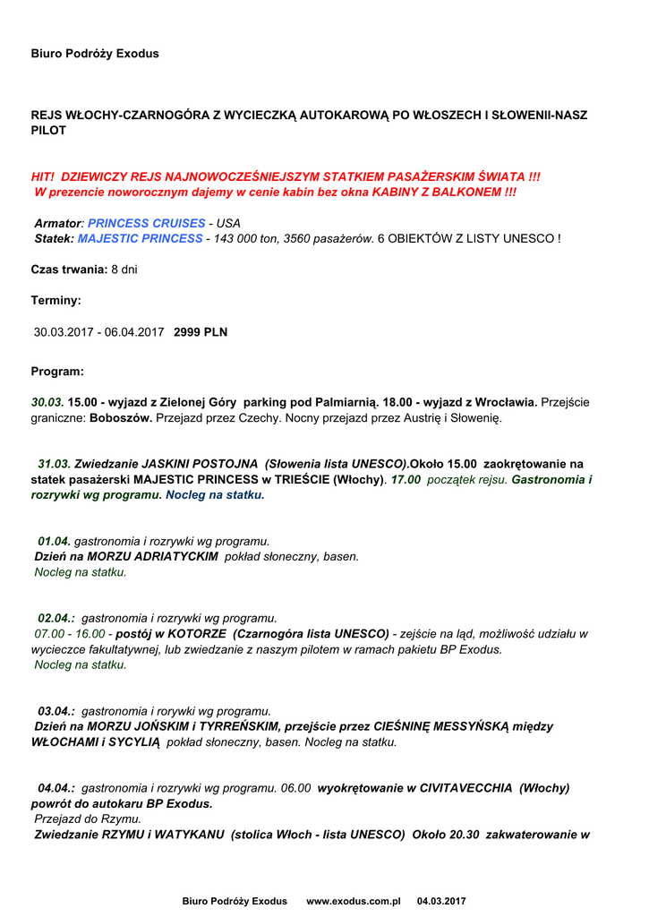 Biuro Podróży Exodus REJS WŁOCHY-CZARNOGÓRA Z WYCIECZKĄ AUTOKAROWĄ PO WŁOSZECH I SŁOWENII-NASZ PILOT HIT! DZIEWICZY REJS NAJNOWOCZEŚNIEJSZYM STATKIEM PASAŻERSKIM ŚWIATA !!! W prezencie noworocznym dajemy w cenie kabin bez okna KABINY Z BALKONEM !!! Armator: PRINCESS CRUISES - USA Statek: MAJESTIC PRINCESS - 143 000 ton, 3560 pasażerów. 6 OBIEKTÓW Z LISTY UNESCO ! Czas trwania: 8 dni Terminy: 30.03.2017 - 06.04.2017 2999 PLN Program: 30.03. 15.00 - wyjazd z Zielonej Góry parking pod Palmiarnią. 18.00 - wyjazd z Wrocławia. Przejście graniczne: Boboszów. Przejazd przez Czechy. Nocny przejazd przez Austrię i Słowenię. 31.03. Zwiedzanie JASKINI POSTOJNA (Słowenia lista UNESCO).Około 15.00 zaokrętowanie na statek pasażerski MAJESTIC PRINCESS w TRIEŚCIE (Włochy). 17.00 początek rejsu. Gastronomia i rozrywki wg programu. Nocleg na statku. 01.04. gastronomia i rozrywki wg programu. Dzień na MORZU ADRIATYCKIM pokład słoneczny, basen. Nocleg na statku. 02.04.: gastronomia i rozrywki wg programu. 07.00 - 16.00 - postój w KOTORZE (Czarnogóra lista UNESCO) - zejście na ląd, możliwość udziału w wycieczce fakultatywnej, lub zwiedzanie z naszym pilotem w ramach pakietu BP Exodus. Nocleg na statku. 03.04.: gastronomia i rorywki wg programu. Dzień na MORZU JOŃSKIM i TYRREŃSKIM, przejście przez CIEŚNINĘ MESSYŃSKĄ między WŁOCHAMI i SYCYLIĄ pokład słoneczny, basen. Nocleg na statku. 04.04.: gastronomia i rozrywki wg programu. 06.00 wyokrętowanie w CIVITAVECCHIA (Włochy) powrót do autokaru BP Exodus. Przejazd do Rzymu. Zwiedzanie RZYMU i WATYKANU (stolica Włoch - lista UNESCO) Około 20.30 zakwaterowanie w Biuro Podróży Exodus www.exodus.com.pl 04.03.2017 hotelu w rejonie CHIUSI. Obiadokolacja. Nocleg. 05.04.: 07.00 śniadanie.07.45 wyjazd. Zwiedzanie MODENY (Włochy - lista UNESCO) Zwiedzanie MANTUI (Włochy - lista UNESCO) Zwiedzanie SANKTUARIUM BITWY POD SOLFERINO tablice oddziałów polskich Spacer po SIRMIONE (piękny historyczny kurort nad JEZIOREM GARDA) Około 20.00 zakwaterowanie w hotelu w rejonie WERONY. Obiadokolacja. Nocleg. 06.04.: 07.00 śniadanie. 07.45 wyjazd. Zwiedzanie WERONY (Włochy - lista UNESCO) Przejazd przez Włochy, Austrię, Niemcy. Przejście graniczne: Olszyna. Około 00.00 rozwiązanie imprezy w Zielonej Górze parking pod Palmiarnią. Około 03.00 rozwiązanie imprezy we Wrocławiu. W cenie: autokar: wysokopokładowy, klimatyzacja, WC, video, napoje zimne i gorące (płatne) - około 3500 km. statek pasażerski MAJESTIC PRINCESS: 4 dni z pełnym programem rozrywkowym i coctailem kapitańskim (obowiązuje strój wieczorowy). noclegi: 4 x kabina 2-osob. z łaz/WC z balkonem + 2 x hotel*** - pokoje 2-osobowe z łaz/WC wyżywienie: 6 śniadań, 3 obiady, 6 obiadokolacji + wiele dodatkowych posiłków na statku pilot BP EXODUS ubezpieczenie NW, KL, bagaż podatek VAT Dodatkowe opłaty: przewodnicy lokalni (Rzym, Watykan, Kotor, Modena) - ok. 23 EUR (obowiązkowo) zestawy słuchawkowe - 7 EUR (obowiązkowo) Jaskinia Postojna - ok. 20 EUR napiwki na statku - ok. 10 EUR/os. na dzień (obowiązkowo, płatne na pokładzie) napoje do obiadokolacji Biuro Podróży Exodus www.exodus.com.pl 04.03.2017
