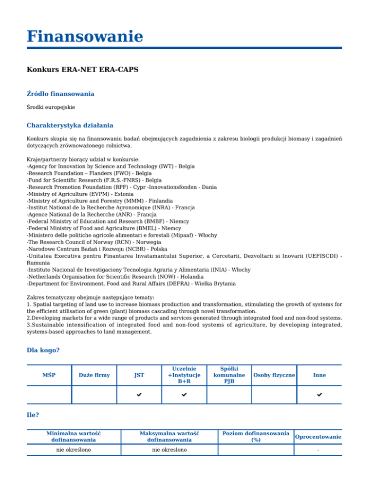 Finansowanie Konkurs ERA-NET ERA-CAPS Źródło finansowania Środki europejskie Charakterystyka działania Konkurs skupia się na finansowaniu badań obejmujących zagadnienia z zakresu biologii produkcji biomasy i zagadnień dotyczących zrównoważonego rolnictwa. Kraje/partnerzy biorący udział w konkursie: -Agency for Innovation by Science and Technology (IWT) - Belgia -Research Foundation – Flanders (FWO) - Belgia -Fund for Scientific Research (F.R.S.-FNRS) - Belgia -Research Promotion Foundation (RPF) - Cypr -Innovationsfonden - Dania -Ministry of Agriculture (EVPM) - Estonia -Ministry of Agriculture and Forestry (MMM) - Finlandia -Institut National de la Recherche Agronomique (INRA) - Francja -Agence National de la Recherche (ANR) - Francja -Federal Ministry of Education and Research (BMBF) - Niemcy -Federal Ministry of Food and Agriculture (BMEL) - Niemcy -Ministero delle politiche agricole alimentari e forestali (Mipaaf) - Włochy -The Research Council of Norway (RCN) - Norwegia -Narodowe Centrum Badań i Rozwoju (NCBR) - Polska -Unitatea Executiva pentru Finantarea Invatamantului Superior, a Cercetarii, Dezvoltarii si Inovarii (UEFISCDI) Rumunia -Instituto Nacional de Investigaciony Tecnologia Agraria y Alimentaria (INIA) - Włochy -Netherlands Organisation for Scientific Research (NOW) - Holandia -Department for Environment, Food and Rural Affairs (DEFRA) - Wielka Brytania Zakres tematyczny obejmuje następujące tematy: 1. Spatial targeting of land use to increase biomass production and transformation, stimulating the growth of systems for the efficient utilisation of green (plant) biomass cascading through novel transformation. 2.Developing markets for a wide range of products and services generated through integrated food and non-food systems. 3.Sustainable intensification of integrated food and non-food systems of agriculture, by developing integrated, systems-based approaches to land management. Dla kogo? MŚP Duże firmy JST Uczelnie +Instytucje B+R Spółki komunalne PJB Osoby fizyczne Inne Ile? Minimalna wartość dofinansowania Maksymalna wartość dofinansowania nie określono nie okreslono Poziom dofinansowania Oprocentowanie (%) - Informacje dodatkowe Koszty kwalifikowane: Op-Inne koszty operacyjne W-koszty wynagrodzeń A-koszty aparatury badawczo-naukowej G-koszty gruntów i budynków E-koszty podwykonawstwa O-koszty ogólne Szczegółowe dane dotyczące kosztów kwalifikowanych i niekwalifikowanych:http://www.ncbr.gov.pl/gfx/ncbir/userfiles/_public/programy_miedzynarodowe/facce_surplus/przewod nik_kwalifikowalnosci_kosztow-01.03.14.pdf Terminy 07.01 - 04.03.2015 Kontakt w sprawie finansowania Planergia Sp. z o.o. ul. Ligocka 103 40-568 Katowice e- mail.: [email protected] Zestawienie źródeł finansowania zostało przygotowane we współpracy z Grupą Doradczą Altima Sp. z o.o.
