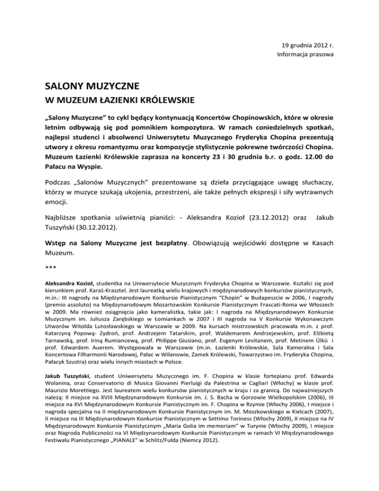 19 grudnia 2012 r. Informacja prasowa SALONY MUZYCZNE W MUZEUM ŁAZIENKI KRÓLEWSKIE „Salony Muzyczne” to cykl będący kontynuacją Koncertów Chopinowskich, które w okresie letnim odbywają się pod pomnikiem kompozytora. W ramach coniedzielnych spotkań, najlepsi studenci i absolwenci Uniwersytetu Muzycznego Fryderyka Chopina prezentują utwory z okresu romantyzmu oraz kompozycje stylistycznie pokrewne twórczości Chopina. Muzeum Łazienki Królewskie zaprasza na koncerty 23 i 30 grudnia b.r. o godz. 12.00 do Pałacu na Wyspie. Podczas „Salonów Muzycznych” prezentowane są dzieła przyciągające uwagę słuchaczy, którzy w muzyce szukają ukojenia, przestrzeni, ale także pełnych ekspresji i siły wytrawnych emocji. Najbliższe spotkania uświetnią pianiści: - Aleksandra Kozioł (23.12.2012) oraz Tuszyński (30.12.2012). Jakub Wstęp na Salony Muzyczne jest bezpłatny. Obowiązują wejściówki dostępne w Kasach Muzeum. *** Aleksandra Kozioł, studentka na Uniwersytecie Muzycznym Fryderyka Chopina w Warszawie. Kształci się pod kierunkiem prof. Karaś-Krasztel. Jest laureatką wielu krajowych i międzynarodowych konkursów pianistycznych, m.in.: III nagrody na Międzynarodowym Konkursie Pianistycznym “Chopin” w Budapeszcie w 2006, I nagrody (premio assoluto) na Międzynarodowym Mozartowskim Konkursie Pianistycznym Frascati-Roma we Włoszech w 2009. Ma również osiągnięcia jako kameralistka, takie jak: I nagroda na Międzynarodowym Konkursie Muzycznym im. Juliusza Zarębskiego w Łomiankach w 2007 i III nagroda na V Konkursie Wykonawczym Utworów Witolda Lutosławskiego w Warszawie w 2009. Na kursach mistrzowskich pracowała m.in. z prof. Katarzyną Popową- Zydroń, prof. Andrzejem Tatarskim, prof. Waldemarem Andrzejewskim, prof. Elżbietą Tarnawską, prof. Iriną Rumiancewą, prof. Philippe Giusiano, prof. Evgenym Levitanem, prof. Metinem Ülkü i prof. Edwardem Auerem. Występowała w Warszawie (m.in. Łazienki Królewskie, Sala Kameralna i Sala Koncertowa Filharmonii Narodowej, Pałac w Wilanowie, Zamek Królewski, Towarzystwo im. Fryderyka Chopina, Pałacyk Szustra) oraz wielu innych miastach w Polsce. Jakub Tuszyński, student Uniwersytetu Muzycznego im. F. Chopina w klasie fortepianu prof. Edwarda Wolanina, oraz Conservatorio di Musica Giovanni Pierluigi da Palestrina w Cagliari (Włochy) w klasie prof. Maurizio Morettiego. Jest laureatem wielu konkursów pianistycznych w kraju i za granicą. Do najważniejszych należą: II miejsce na XVIII Międzynarodowym Konkursie im. J. S. Bacha w Gorzowie Wielkopolskim (2006), III miejsce na XVI Międzynarodowym Konkursie Pianistycznym im. F. Chopina w Rzymie (Włochy 2006), I miejsce i nagroda specjalna na II międzynarodowym Konkursie Pianistycznym im. M. Moszkowskiego w Kielcach (2007), II miejsce na III Międzynarodowym Konkursie Pianistycznym w Settimo Toriness (Włochy 2009), II miejsce na IV Międzynarodowym Konkursie Pianistycznym „Maria Golia im memoriam” w Turynie (Włochy 2009), I miejsce oraz Nagroda Publiczności na VI Międzynarodowym Konkursie Pianistycznym w ramach VI Międzynarodowego Festiwalu Pianistycznego „PIANALE” w Schlitz/Fulda (Niemcy 2012). Kontakt dla mediów: ArturStefaniak [email protected] senior account executive, pr victoria promotion Tel.: 22 629 57 75 Kom. 502 782 783