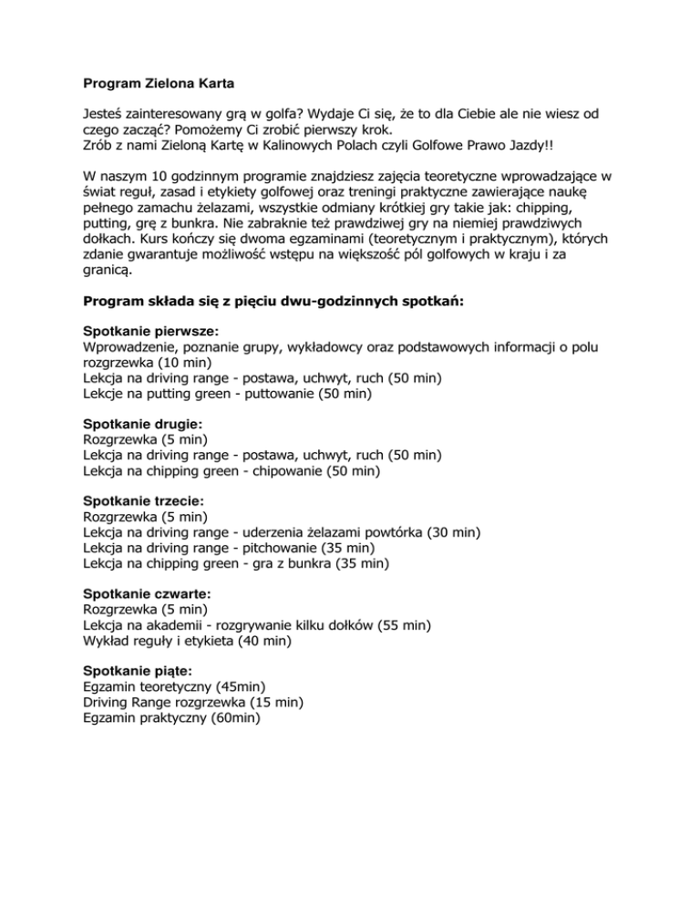 Program Zielona Karta Jesteś zainteresowany grą w golfa? Wydaje Ci się, że to dla Ciebie ale nie wiesz od czego zacząć? Pomożemy Ci zrobić pierwszy krok. Zrób z nami Zieloną Kartę w Kalinowych Polach czyli Golfowe Prawo Jazdy!! W naszym 10 godzinnym programie znajdziesz zajęcia teoretyczne wprowadzające w świat reguł, zasad i etykiety golfowej oraz treningi praktyczne zawierające naukę pełnego zamachu żelazami, wszystkie odmiany krótkiej gry takie jak: chipping, putting, grę z bunkra. Nie zabraknie też prawdziwej gry na niemiej prawdziwych dołkach. Kurs kończy się dwoma egzaminami (teoretycznym i praktycznym), których zdanie gwarantuje możliwość wstępu na większość pól golfowych w kraju i za granicą. Program składa się z pięciu dwu-godzinnych spotkań: Spotkanie pierwsze: Wprowadzenie, poznanie grupy, wykładowcy oraz podstawowych informacji o polu rozgrzewka (10 min) Lekcja na driving range - postawa, uchwyt, ruch (50 min) Lekcje na putting green - puttowanie (50 min) Spotkanie drugie: Rozgrzewka (5 min) Lekcja na driving range - postawa, uchwyt, ruch (50 min) Lekcja na chipping green - chipowanie (50 min) Spotkanie trzecie: Rozgrzewka (5 min) Lekcja na driving range - uderzenia żelazami powtórka (30 min) Lekcja na driving range - pitchowanie (35 min) Lekcja na chipping green - gra z bunkra (35 min) Spotkanie czwarte: Rozgrzewka (5 min) Lekcja na akademii - rozgrywanie kilku dołków (55 min) Wykład reguły i etykieta (40 min) Spotkanie piąte: Egzamin teoretyczny (45min) Driving Range rozgrzewka (15 min) Egzamin praktyczny (60min)