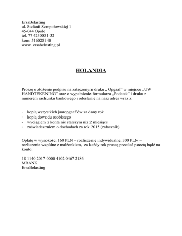 ErsaBelasting ul. Stefanii Sempołowskiej 1 45-044 Opole tel. 77 4230031-32 kom: 516028140 www. ersabelasting.pl HOLANDIA Proszę o złożenie podpisu na załączonym druku „ Opgaaf” w miejscu „UW HANDTEKENING” oraz o wypełnienie formularza „Podatek” i druku z numerem rachunku bankowego i odesłanie na nasz adres wraz z: - kopią wszystkich jaaropgaaf’ów za dany rok kopią dowodu osobistego wyciągiem z konta nie starszym niż 2 miesiące zaświadczeniem o dochodach za rok 2015 (załacznik) Opłatę w wysokości 160 PLN – rozliczenie indywidualne, 300 PLN – rozliczenie wspólne z małżonkiem, za każdy rok proszę przesłać pocztą bądź na konto: 18 1140 2017 0000 4102 0467 2186 MBANK ErsaBelasting Podatek/Rozłąkowe Rok podatkowy ....................... Dane podatnika BSN/Sofi nazwisko imiona stan cywilny data urodzenia nr telefonu mail Data .......................................... Dane współmałżonka BSN/Sofi nazwisko imiona stan cywilny data urodzenia nr telefonu mail ADRES (zgodny z adresem podanym w Holenderskim Urzędzie Skarbowym) ulica kod pocztowy miejscowość Czy był/a Pan/i zameldowana w Holandii? Jeśli TAK: adres okres zameldowania od: TAK*/NIE* do: Czy współmałżonek pracuje? TAK*/NIE* Dochody brutto współmałżonka DZIECI nazwisko Polska Holandia zł imię data urodzenia TAK*/NIE* TAK*/NIE* TAK*/NIE* Czy jest Pan/i rodzicem samotnie wychowującym dziecko? Czy dziecko do 21 roku życia uczące się w trybie dziennym jest nadal na Pan/i utrzymaniu? Czy płaci Pan/i alimenty? Jeśli TAK: imię i nazwisko dziecka data urodzenia dziecka eur adres zamieszkania dziecka całkowita kwota alimentów w danym roku zł eur Okresy przepracowane w Holandii ( dokładne daty) Nr rachunku bankowego Podatnika IBAN SWIFT/BIC NAZWA BANKU ADRES BANKU TAK / * niewłaściwe skreślić Oświadczam, że w latach ubiegłych nie udzielałem(am) innym firmom pełnomocnictw do reprezentowania mnie przed Holenderskimi Urzędami Skarbowymi. Numer konta i adres ww widnieje w Holenderskim Urzędzie Skarbowym Oświadczam, że nie ubiegam się o zwrot podatku poprzez inne osoby lub biura. Za pomyłki i opóźnienie w wypłatach spowodowanych przez holenderski Urząd Skarbowy, firma nie odpowiada CZY KONTO ZOSTAŁO ZWERYFIKOWANE W HOLENDERSKIM URZĘDZIE SKARBOWYM NIE ........................................................................ Podpis Wyrażam zgodę na przetwarzanie moich danych osobowych dla potrzeb niezbędnych do wykonania rozliczeń oraz do celów marketingowych przez grupę ERSA (zgodnie z Ustawą z dn.29.08.97 roku o Ochronie Danych Osobowych Dz.U.nr.133 poz.883) Rekeninghouder: Data …………………………… Volledige naam en voorletters (Imiona i nazwisko) …………………………………………………………. Straat en huisnummer ( Ulica i numer) …………………………………………………………. Postcode en plaats ( Kod pocztowy i miejscowość) …………………………………………………………./ POLEN Gebortedatum ( Data urodzenia) …………………………………………………………. SOFI( BSN numer) ………………………………………………………….. Belastingdienst Centrale Administratie, Unit 2 Uitbetalingen, afdeling BBR Postbus 9055 7300 GT Apeldoorn Przekazuję nowy numer konta. Proszę o usunięcie wszelkich poprzednich kont z Państwa systemu). Ik geef u een nieuwe rekeningnummer door. Ik verzoek u om alle bekende rekeningnummers uit uw system direct te verwijderen. Voor de teruggave van Inkomstenbelasting / Premie Volksverzekeringen en Toeslagen Naam en plaats v.d. bank/ land (nazwa i oddział banku) ………………………………………………………………………/............... Nieuwrekeningnummer(nowy numer konta) IBAN BIC (swift) ………………………………………………………………………. Handtekening ………………………........... ( podpis) Ondergetekende verzoekt eventuele toekomstige uitbetalingen, tot nader schriftelijk bericht, op het hierboven vermelde rekeningnummer over te maken. Załącznik: - czytelna kopia dowodu osobistego - wyciąg z konta nie starszy niż 2 miesiące Belastingdienst Zaświadczenie o dochodach za rok 2015 Podatnik zagraniczny kwalifikujący się do ulg Formularz UE/WE Przeznaczenie formularza W poniższym formularzu należy podać dochody, które nie podlegają opodatkowaniu w Holandii. Zaświadczenie o dochodach będzie ci potrzebne, kiedy rozliczasz się z podatku na zasadach dla podatników zagranicznych kwalifikujących się do ulg w Holandii. Podatnikiem zagranicznym kwalifikującym się do ulg jesteś wówczas, gdy spełniasz następujące warunki: – twoje miejsce zamieszkania znajduje się na terytorium Unii Europejskiej, Liechtensteinu, Norwegii, Islandii, Szwajcarii, Bonaire, Sint Eustatius lub Saby; – co najmniej twoich 90% dochodów podlega opodatkowaniu w Holandii; – możesz okazać zaświadczenie o dochodach wystawione przez właściwy urząd skarbowy w kraju twego zamieszkania. Dalsze informacje na temat niniejszego zaświadczenia o dochodach oraz skutkach bycia podatnikiem zagranicznym kwalifikującym się do ulg zawarte są w objaśnieniu. Wypełnienie i wysyłka formularza Po wypełnieniu formularza, należy go przedłożyć do podpisu we właściwym urzędzie skarbowym kraju twego zamieszkania. Wyślij podpisany formularz na poniższy adres: Belastingdienst/ Kantoor buitenland, Postbus 2577, 6401 DB Heerlen, Holandia Dalsze informacje Szczegółowe informacje dostępne są w serwisie internetowym holenderskiego urzędu skarbowego www.belastingdienst.nl/ internationaal. Pytania zgłaszać można również dzwoniąc na infolinię wydziału spraw zagranicznych urzędu skarbowego, nr tel.: +31 555 385 385. 1Rok podatkowy, którego zaświadczenie dotyczy Podaj rok, którego dotyczy zaświadczenie2015 2 2a Dane podatnika Inicjały imion i nazwisko Numer iden