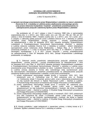 UCHWAŁA NR LXXVII/1608/2016 ZARZĄDU WOJEWÓDZTWA LUBELSKIEGO z dnia 12 stycznia 2016 r. w sprawie zwrotnego przeniesienia przez Województwo Lubelskie na rzecz Lubelskich Dworców S.A. z siedzibą w Lublinie prawa użytkowania wieczystego gruntu oraz prawa własności budynków i budowli - przedmiotu przewłaszczenia na zabezpieczenie pożyczki udzielonej Spółce przez Województwo Lubelskie Na podstawie art. 41 ust.1 ustawy z dnia 5 czerwca 1998 roku o samorządzie województwa (Dz. U. z 2015 r. poz. 1392 z późn. zm.), art. 155, art. 156, art. 158, art. 237 ustawy z dnia 23 kwietnia 1964 r. Kodeks cywilny (Dz. U. z 2014 r. poz. 121 z późn. zm.), w związku z całkowitą spłatą pożyczki przez Lubelskie Dworce S.A. z siedzibą w Lublinie udzielonej przez Województwo umową pożyczki i umową przewłaszczenia na zabezpieczenie z dnia 24 listopada 2012 roku zawartą pomiędzy Województwem Lubelskiem a Przedsiębiorstwem Komunikacji Samochodowej „Wschód” z siedzibą w Lublinie (obecnie Lubelskie Dworce S.A. z siedzibą w Lublinie) - aktem notarialnym sporządzonym przez notariusza Annę Śladkowską – Szłapa Rep. A nr 6247/2012, zmienionej aneksem nr 1 z dnia 13 stycznia 2014 roku Rep. A. nr 148/2014, w wykonaniu obowiązku wynikającego z § 9 ust.1 umowy pożyczki i umowy przewłaszczenia na zabezpieczenie z dnia 24 listopada 2012 roku, Zarząd Województwa Lubelskiego postanawia, co następuje: § 1. Dokonać zwrotu przedmiotu zabezpieczenia pożyczki udzielonej przez Województwo umową pożyczki i umową przewłaszczenia na zabezpieczenie z dnia 24 listopada 2012 roku Rep. A. 6247/2012 zawartą pomiędzy Województwem Lubelskiem a Przedsiębiorstwem Komunikacji Samochodowej „Wschód” z siedzibą w Lublinie przez przeniesienie przez Województwo Lubelskie na rzecz Lubelskich Dworców S.A. z siedzibą w Lublinie umową zawartą w formie aktu notarialnego niżej wymienionych praw do nieruchomości stanowiących przedmiot przewłaszczenia na zabezpieczenie pożyczki udzielonej Spółce przez Województwo Lubelskie, to jest przez przeniesienie: 1) prawa użytkowania wieczystego działek gruntu o numerach: 32/4; 33/1; 34/4 położonych przy ul. Cerkiewnej oraz nr 56/4 położonej przy ul. Ruskiej i ul. Cerkiewnej, obręb 7–Czwartek, gmina Lublin, wraz z własnością posadowionych na niej budowli dla których w Sądzie Rejonowym Lublin – Zachód w Lublinie, X Wydział Ksiąg Wieczystych prowadzona jest Księga Wieczysta LU1I/00318925/0; 2) prawa użytkowania wieczystego działki grunt o numerze 48, położonej przy ul. Nadstawnej 3, obręb 7–Czwartek, gmina Lublin, wraz z własnością posadowionych na niej budynków niemieszkalnych i budowli, dla której w Sądzie Rejonowym Lublin – Zachód w Lublinie, X Wydział Ksiąg Wieczystych prowadzona jest Księga Wieczysta LU1I/00205746/6; 3) prawa użytkowania wieczystego działek gruntu o numerach: 53/2 i 53/3, położonych przy Alei Tysiąclecia 8a, obręb 7–Czwartek, gmina Lublin wraz z własnością posadowionych na niej budynku niemieszkalnego i budowli, dla której w Sądzie Rejonowym Lublin – Zachód w Lublinie, X Wydział Ksiąg Wieczystych prowadzona jest Księga Wieczysta LU1I/00318926/7. § 2. Koszty podatków i opłat związanych z zawarciem umowy, o której mowa w § 1 poniesie Spółka Lubelskie Dworce S.A. z siedzibą w Lublinie. § 3. Wykonanie uchwały powierza się Marszałkowi Województwa Lubelskiego. § 4. Uchwała wchodzi w życie z dniem podjęcia. Członek Zarządu Marszałek Województwa /-/Paweł Nakonieczny /-/Sławomir Sosnowski Uchwała Nr LXXVII/1608/2016 Zarządu Województwa Lubelskiego z dnia 12 stycznia 2016 r. Strona 2 z 2