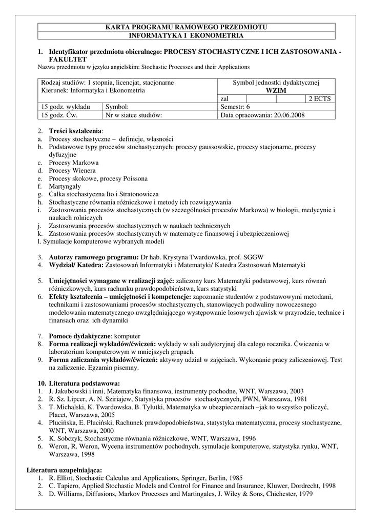 KARTA PROGRAMU RAMOWEGO PRZEDMIOTU INFORMATYKA I EKONOMETRIA 1. Identyfikator przedmiotu obieralnego: PROCESY STOCHASTYCZNE I ICH ZASTOSOWANIA FAKULTET Nazwa przedmiotu w języku angielskim: Stochastic Processes and their Applications Rodzaj studiów: 1 stopnia, licencjat, stacjonarne Kierunek: Informatyka i Ekonometria 15 godz. wykładu 15 godz. Ćw. Symbol: Nr w siatce studiów: Symbol jednostki dydaktycznej WZIM zal 2 ECTS Semestr: 6 Data opracowania: 20.06.2008 2. Treści kształcenia: a. Procesy stochastyczne – definicje, własności b. Podstawowe typy procesów stochastycznych: procesy gaussowskie, procesy stacjonarne, procesy dyfuzyjne c. Procesy Markowa d. Procesy Wienera e. Procesy skokowe, procesy Poissona f. Martyngały g. Całka stochastyczna Ito i Stratonowicza h. Stochastyczne równania różniczkowe i metody ich rozwiązywania i. Zastosowania procesów stochastycznych (w szczególności procesów Markowa) w biologii, medycynie i naukach rolniczych j. Zastosowania procesów stochastycznych w naukach technicznych k. Zastosowania procesów stochastycznych w matematyce finansowej i ubezpieczeniowej l. Symulacje komputerowe wybranych modeli 3. Autorzy ramowego programu: Dr hab. Krystyna Twardowska, prof. SGGW 4. Wydział/ Katedra: Zastosowań Informatyki i Matematyki/ Katedra Zastosowań Matematyki 5. Umiejętności wymagane w realizacji zajęć: zaliczony kurs Matematyki podstawowej, kurs równań różniczkowych, kurs rachunku prawdopodobieństwa, kurs statystyki 6. Efekty kształcenia – umiejętności i kompetencje: zapoznanie studentów z podstawowymi metodami, technikami i zastosowaniami procesów stochastycznych, stanowiących podwaliny nowoczesnego modelowania matematycznego uwzględniającego występowanie losowych zjawisk w przyrodzie, technice i finansach oraz ich dynamiki 7. Pomoce dydaktyczne: komputer 8. Forma realizacji wykładów/ćwiczeń: wykłady w sali audytoryjnej dla całego rocznika. Ćwiczenia w laboratorium komputerowym w mniejszych grupach. 9. Forma zaliczania wykładów/ćwiczeń: aktywny udział w zajęciach. Wykonanie pracy zaliczeniowej. Test na zaliczenie. Egzamin pisemny. 10. 1. 2. 3. Literatura podstawowa: J. Jakubowski i inni, Matematyka finansowa, instrumenty pochodne, WNT, Warszawa, 2003 R. Sz. Lipcer, A. N. Sziriajew, Statystyka procesów stochastycznych, PWN, Warszawa, 1981 T. Michalski, K. Twardowska, B. Tylutki, Matematyka w ubezpieczeniach –jak to wszystko policzyć, Placet, Warszawa, 2005 4. Plucińska, E. Pluciński, Rachunek prawdopodobieństwa, statystyka matematyczna, procesy stochastyczne, WNT, Warszawa, 2000 5. K. Sobczyk, Stochastyczne równania różniczkowe, WNT, Warszawa, 1996 6. Weron, R. Weron, Wycena instrumentów pochodnych, symulacje komputerowe, statystyka rynku, WNT, Warszawa, 1998 Literatura uzupełniająca: 1. R. Elliot, Stochastic Calculus and Applications, Springer, Berlin, 1985 2. C. Tapiero, Applied Stochastic Models and Control for Finance and Insurance, Kluwer, Dordrecht, 1998 3. D. Williams, Diffusions, Markov Processes and Martingales, J. Wiley & Sons, Chichester, 1979