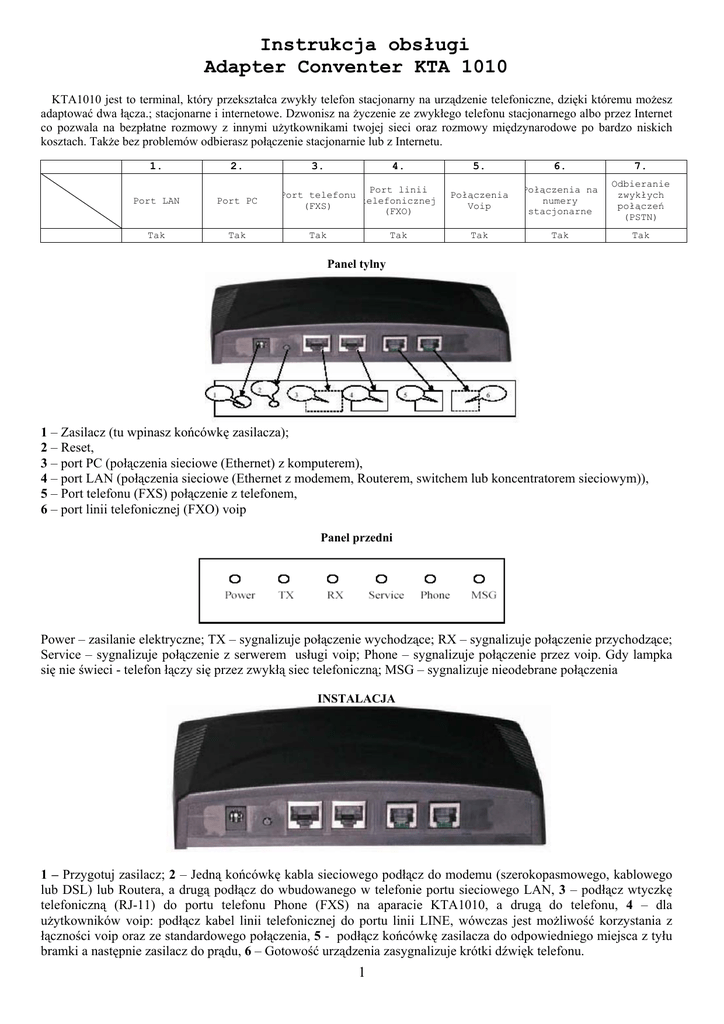 Instrukcja obsáugi Adapter Conventer KTA 1010 KTA1010 jest to terminal, który przeksztaáca zwykáy telefon stacjonarny na urządzenie telefoniczne, dziĊki któremu moĪesz adaptowaü dwa áącza.; stacjonarne i internetowe. Dzwonisz na Īyczenie ze zwykáego telefonu stacjonarnego albo przez Internet co pozwala na bezpáatne rozmowy z innymi uĪytkownikami twojej sieci oraz rozmowy miĊdzynarodowe po bardzo niskich kosztach. TakĪe bez problemów odbierasz poáączenie stacjonarnie lub z Internetu. 1. 2. Port LAN Port PC Tak Tak 3. 4. Port linii Port telefonu telefonicznej (FXS) (FXO) Tak Tak 5. 6. 7. Poáączenia Voip Poáączenia na numery stacjonarne Odbieranie zwykáych poáączeĔ (PSTN) Tak Tak Tak Panel tylny 1 – Zasilacz (tu wpinasz koĔcówkĊ zasilacza); 2 – Reset, 3 – port PC (poáączenia sieciowe (Ethernet) z komputerem), 4 – port LAN (poáączenia sieciowe (Ethernet z modemem, Routerem, switchem lub koncentratorem sieciowym)), 5 – Port telefonu (FXS) poáączenie z telefonem, 6 – port linii telefonicznej (FXO) voip Panel przedni Power – zasilanie elektryczne; TX – sygnalizuje poáączenie wychodzące; RX – sygnalizuje poáączenie przychodzące; Service – sygnalizuje poáączenie z serwerem usáugi voip; Phone – sygnalizuje poáączenie przez voip. Gdy lampka siĊ nie Ğwieci - telefon áączy siĊ przez zwykáą siec telefoniczną; MSG – sygnalizuje nieodebrane poáączenia INSTALACJA 1 – Przygotuj zasilacz; 2 – Jedną koĔcówkĊ kabla sieciowego podáącz do modemu (szerokopasmowego, kablowego lub DSL) lub Routera, a drugą podáącz do wbudowanego w telefonie portu sieciowego LAN, 3 – podáącz wtyczkĊ telefoniczną (RJ-11) do portu telefonu Phone (FXS) na aparacie KTA1010, a drugą do telefonu, 4 – dla uĪytkowników voip: podáącz kabel linii telefonicznej do portu linii LINE, wówczas jest moĪliwoĞü korzystania z áącznoĞci voip oraz ze standardowego poáączenia, 5 - podáącz koĔcówkĊ zasilacza do odpowiedniego miejsca z tyáu bramki a nastĊpnie zasilacz do prądu, 6 – GotowoĞü urządzenia zasygnalizuje krótki dĨwiĊk telefonu. 1 KONFIGURACJA Z komputera Otwórz przeglądarkĊ w celu konfiguracji. ZadzwoĔ pod numer #*047# w celu sprawdzenia numeru IP. Na przeglądarce w polu adresu wpisz nr IP a nastĊpnie wciĞnij ENTER, pojawi siĊ okno logowanie aby wejĞü do panelu sterowanie musisz podaü hasáo, hasáo fabryczne to 1234. Uwaga: JeĪeli masz problem z uzyskanie adresu IP, wybierz na telefonie ##3427# w celu wyáączenia trybu DHCP. Po akceptacji ustawieĔ usáyszysz krótki dĨwiĊk telefonu, podnieĞ sáuchawkĊ i wpisz #73847#xxx*xxx*xxx*xxx# aby ustawiü nowy adres IP. Np. adres IP 122.168.1.100 uzyskamy po wprowadzeniu #73847#122*168.*1*100# Ustawienia sieci. Wybierz odpowiedni tryb poáączenia w zaleĪnoĞci od charakterystyki twojego poáączenia internetowego. Statyczny adres IP. Odpowiednie wartoĞci parametrów moĪesz uzyskaü od dostawcy Internetu. 2 DHCP. Adres IP i inne parametry sieciowe są ustawiane automatycznie przez program. PPPoE. Protokóá ten jest specyficzny dla modemów ADSL, kablowych i niektórych poáączeĔ sieciowych (Ethernet), naleĪy podaü nazwĊ uĪytkownika i hasáo dostĊpu. Ustawienia protokoáu Ustawienia dĨwiĊków 3 Inne ustawienia Uwaga: JeĪeli zapomnisz hasáa, wciĞnij #358#, aby przywróciü hasáo domyĞlne (1234). Aktualizacje. NaciĞnij klawisz „Update Firmware” u doáu strony ustawieĔ Po zainstalowaniu aktualizacji urządzenie restartuje siĊ automatycznie. Kiedy urządzenie jest gotowe wciĞnij #358# na telefonie, aby przywróciü ustawienia fabryczne. NastĊpnie urządzenie restartuje siĊ ponownie. Telefon automatycznie ustawi protokóá na statyczne IP. JeĪeli uĪywasz innego protokoáu, musisz ponownie wybraü go w panelu ustawieĔ. INSTALACJA SIECI BEZ KOMPUTERA Parametry moĪna wprowadziü bez komputera. Ustawienie parametrów sieci. Format komendy: #*xxxxx#(co najmniej 3 cyfry) „#*” – zapytanie; „#” - wprowadzenie ustawieĔ; „##” – anulowanie operacji. PoprawnoĞü operacji sygnalizuje dĨwiĊk „di du” . BáĊdy podczas operacji sygnalizuje dĨwiĊk „du du du” . Przykáadowe komendy: Szukanie numeru IP: PodnieĞ sáuchawkĊ i wybierz #*047#(#*0IP#); Restart bramki wybierz #778#(#RST#). JAK DZWONIû Aby poáączyü siĊ z numerem komórkowym lub stacjonarnym, wybierz najpierw nr 011, nastĊpnie wprowadĨ numer kierunkowy kraju (bez ‘0’ w prefiksie) i wybierz numer telefonu. np. 011 48 600111222 lub 011 48 22 780011122. Poáączenie w sieci VoIP przez wybranie tylko numeru telefonu np. 8151515 4