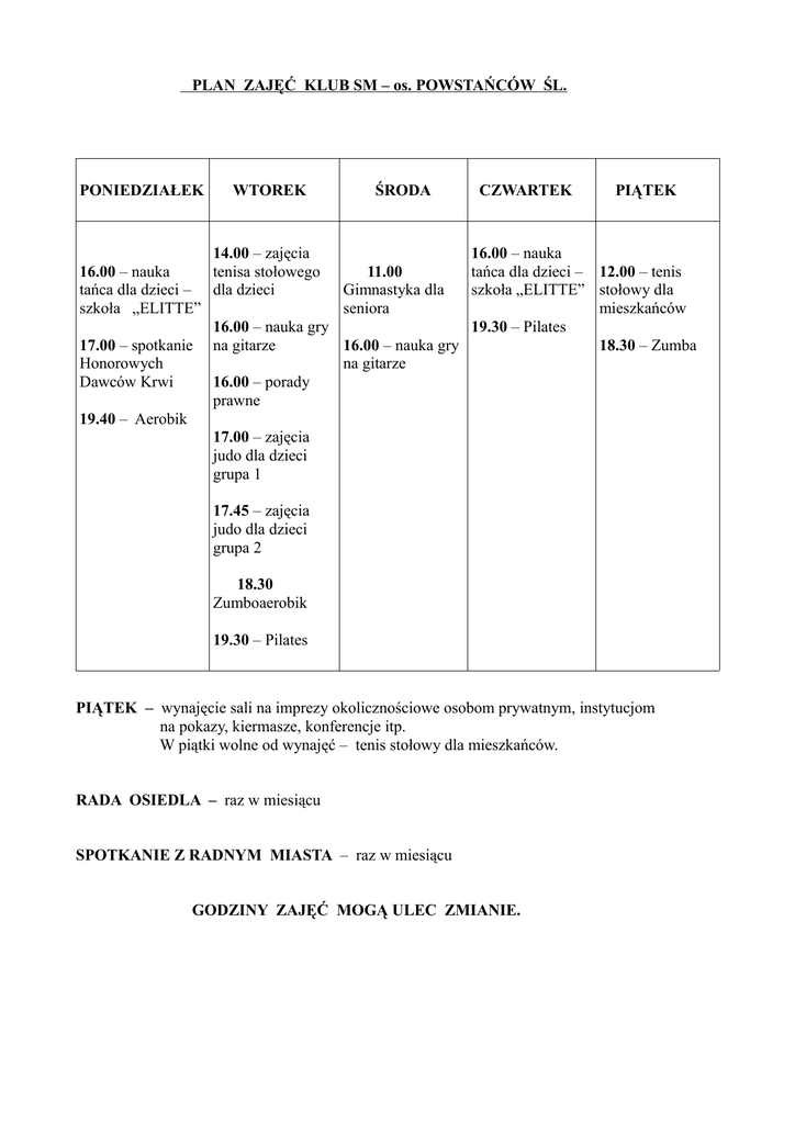 PLAN ZAJĘĆ KLUB SM – os. POWSTAŃCÓW ŚL. PONIEDZIAŁEK WTOREK 14.00 – zajęcia 16.00 – nauka tenisa stołowego tańca dla dzieci – dla dzieci szkoła „ELITTE” 16.00 – nauka gry 17.00 – spotkanie na gitarze Honorowych Dawców Krwi 16.00 – porady prawne 19.40 – Aerobik 17.00 – zajęcia judo dla dzieci grupa 1 ŚRODA CZWARTEK PIĄTEK 16.00 – nauka tańca dla dzieci – 12.00 – tenis szkoła „ELITTE” stołowy dla mieszkańców 19.30 – Pilates 16.00 – nauka gry 18.30 – Zumba na gitarze 11.00 Gimnastyka dla seniora 17.45 – zajęcia judo dla dzieci grupa 2 18.30 Zumboaerobik 19.30 – Pilates PIĄTEK – wynajęcie sali na imprezy okolicznościowe osobom prywatnym, instytucjom na pokazy, kiermasze, konferencje itp. W piątki wolne od wynajęć – tenis stołowy dla mieszkańców. RADA OSIEDLA – raz w miesiącu SPOTKANIE Z RADNYM MIASTA – raz w miesiącu GODZINY ZAJĘĆ MOGĄ ULEC ZMIANIE.