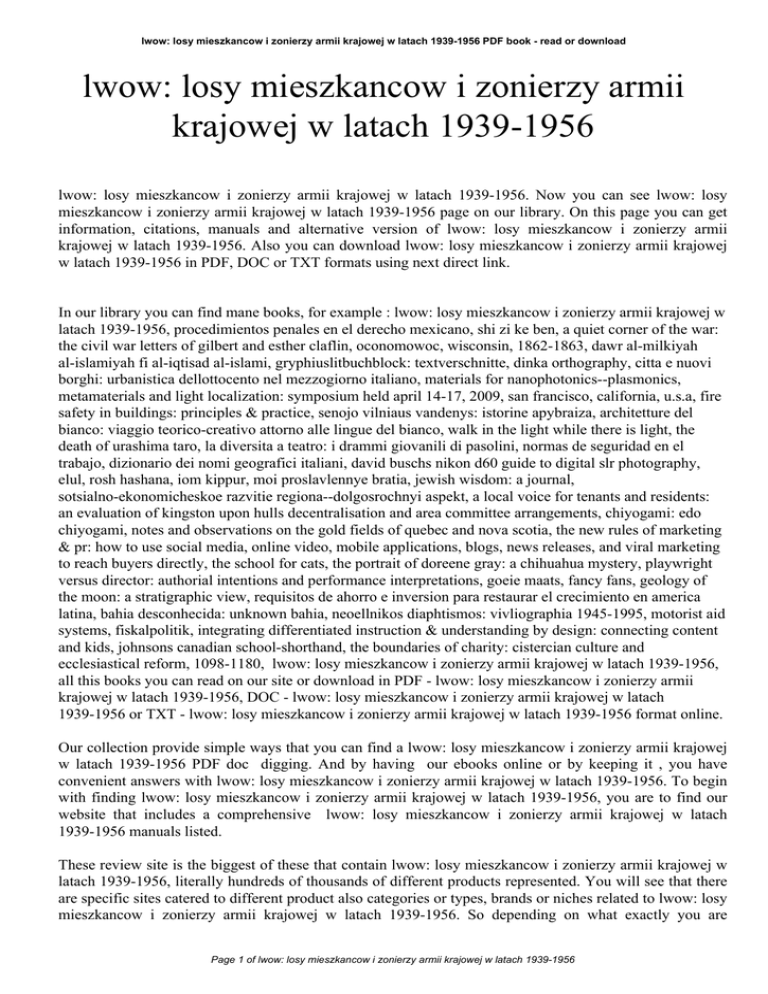 lwow: losy mieszkancow i zonierzy armii krajowej w latach 1939-1956 PDF book - read or download lwow: losy mieszkancow i zonierzy armii krajowej w latach 1939-1956 lwow: losy mieszkancow i zonierzy armii krajowej w latach 1939-1956. Now you can see lwow: losy mieszkancow i zonierzy armii krajowej w latach 1939-1956 page on our library. On this page you can get information, citations, manuals and alternative version of lwow: losy mieszkancow i zonierzy armii krajowej w latach 1939-1956. Also you can download lwow: losy mieszkancow i zonierzy armii krajowej w latach 1939-1956 in PDF, DOC or TXT formats using next direct link. In our library you can find mane books, for example : lwow: losy mieszkancow i zonierzy armii krajowej w latach 1939-1956, procedimientos penales en el derecho mexicano, shi zi ke ben, a quiet corner of the war: the civil war letters of gilbert and esther claflin, oconomowoc, wisconsin, 1862-1863, dawr al-milkiyah al-islamiyah fi al-iqtisad al-islami, gryphiuslitbuchblock: textverschnitte, dinka orthography, citta e nuovi borghi: urbanistica dellottocento nel mezzogiorno italiano, materials for nanophotonics--plasmonics, metamaterials and light localization: symposium held april 14-17, 2009, san francisco, california, u.s.a, fire safety in buildings: principles & practice, senojo vilniaus vandenys: istorine apybraiza, architetture del bianco: viaggio teorico-creativo attorno alle lingue del bianco, walk in the light while there is light, the death of urashima taro, la diversita a teatro: i drammi giovanili di pasolini, normas de seguridad en el trabajo, dizionario dei nomi geografici italiani, david buschs nikon d60 guide to digital slr photography, elul, rosh hashana, iom kippur, moi proslavlennye bratia, jewish wisdom: a journal, sotsialno-ekonomicheskoe razvitie regiona--dolgosrochnyi aspekt, a local voice for tenants and residents: an evaluation of kingston upon hulls decentralisation and area committee arrangements, chiyogami: edo chiyogami, notes and observations on the gold fields of quebec and nova scotia, the new rules of marketing & pr: how to use social media, online video, mobile applications, blogs, news releases, and viral marketing to reach buyers directly, the school for cats, the portrait of doreene gray: a chihuahua mystery, playwright versus director: authorial intentions and performance interpretations, goeie maats, fancy fans, geology of the moon: a stratigraphic view, requisitos de ahorro e inversion para restaurar el crecimiento en america latina, bahia desconhecida: unknown bahia, neoellnikos diaphtismos: vivliographia 1945-1995, motorist aid systems, fiskalpolitik, integrating differentiated instruction & understanding by design: connecting content and kids, johnsons canadian school-shorthand, the boundaries of charity: cistercian culture and ecclesiastical reform, 1098-1180, lwow: losy mieszkancow i zonierzy armii krajowej w latach 1939-1956, all this books you can read on our site or download in PDF - lwow: losy mieszkancow i zonierzy armii krajowej w latach 1939-1956, DOC - lwow: losy mieszkancow i zonierzy armii krajowej w latach 1939-1956 or TXT - lwow: losy mieszkancow i zonierzy armii krajowej w latach 1939-1956 format online. Our collection provide simple ways that you can find a lwow: losy mieszkancow i zonierzy armii krajowej w latach 1939-1956 PDF doc digging. And by having our ebooks online or by keeping it , you have convenient answers with lwow: losy mieszkancow i zonierzy armii krajowej w latach 1939-1956. To begin with finding lwow: losy mieszkancow i zonierzy armii krajowej w latach 1939-1956, you are to find our website that includes a comprehensive lwow: losy mieszkancow i zonierzy armii krajowej w latach 1939-1956 manuals listed. These review site is the biggest of these that contain lwow: losy mieszkancow i zonierzy armii krajowej w latach 1939-1956, literally hundreds of thousands of different products represented. You will see that there are specific sites catered to different product also categories or types, brands or niches related to lwow: losy mieszkancow i zonierzy armii krajowej w latach 1939-1956. So depending on what exactly you are Page 1 of lwow: losy mieszkancow i zonierzy armii krajowej w latach 1939-1956 lwow: losy mieszkancow i zonierzy armii krajowej w latach 1939-1956 PDF book - read or download searching, you shall be able to choose ebooks lwow: losy mieszkancow i zonierzy armii krajowej w latach 1939-1956 to suit your own needs, lwow: losy mieszkancow i zonierzy armii krajowej w latach 1939-1956. Page 2 of lwow: losy mieszkancow i zonierzy armii krajowej w latach 1939-1956