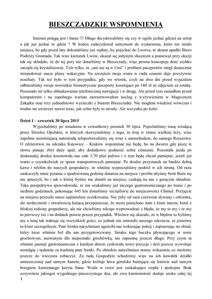 BIESZCZADZKIE WSPOMNIENIA Internet potęgą jest i basta !!! Długo decydowaliśmy się czy w ogóle jechać gdzieś na urlop a jak już jechać to gdzie ? W końcu zadecydował sentyment do wydarzenia, które nie miało miejsca, bo gdy przed laty dokonaliśmy już wpłaty, by pojechać do Lwowa, to akurat upadło Biuro Podróży Gromada. Tak wiec kierunek Lwów, okazał się jedynym słusznym a ponieważ przy okazji tak się składało, że do tej pory nie dotarliśmy w Bieszczady, więc pewna koncepcja dość szybko zaczęła się krystalizować. Tyle tylko, że „uni nie są w Unii” i problem paszportów mógł skutecznie storpedować nasze plany wakacyjne. Na szczęście moja wiara w cuda czasem daje pozytywne rezultaty. Tak też było w tym przypadku, gdy we wtorek, czyli na dwa dni przed wyjazdem odbieraliśmy swoje nowiutkie biometryczne paszporty kosztujące po 160 zł ze zdjęciem za sztukę. Pozostało mi tylko obłaskawienie telefonicznej nawigacji i w drogę. Ale przed tym zasiadłem przed komputerem i na zupełnego wariata zarezerwowałem nocleg z wyżywieniem w Magicznym Zakątku oraz trzy jednodniowe wycieczki z biurem Bieszczader. Nie mogłem wiedzieć wówczas i trudno mi uwierzyć nawet teraz, jak celne były to strzały. Ale wszystko po kolei Dzień I – czwartek 30 lipca 2015 Wyjechaliśmy po śniadaniu w czwartkowy poranek 30 lipca. Pojechaliśmy trasą wiodącą przez Strzelce Opolskie, w których skorzystaliśmy z tego, że kraj w ruinie wielkiej leży, wiec zupełnie nieistniejącą autostradą teleportowaliśmy się wraz z samochodem, do samego Rzeszowa. O zdzierstwie na odcinku Katowice – Kraków wspominać nie będę, bo na dworze gdy piszę te słowa panuje zbyt duży upał, aby dodatkowo podnosić sobie ciśnienie. Pozostała jazda po doskonałej drodze kosztowała nas całe 3,70 plus paliwo i o tym będę chciał pamiętać, jeżeli już warto o czymkolwiek ze spraw transportowych pamiętać. Po drodze przystanek na bardzo dobrą kawę i telefon do naszych gospodarzy, że właśnie rozpoczęliśmy podróż w ich stronę. Od razu zaskoczyły mnie pytania o spodziewaną godzinę dotarcia na miejsce i prośba abyśmy broń Boże się nie spieszyli, bo i tak o której byśmy nie dotarli na miejsce, czekają na nas z gorącym obiadem. Taka perspektywa spowodowała, że nie szukaliśmy już niczego gastronomicznego po trasie i po siedmiu godzinach, pokonując 645 km dotarliśmy szczęśliwie do miejscowości Chmiel. Przyjęcie na miejscu przeszło nasze najśmielsze oczekiwania. Nie żeby od razu czerwone dywany i orkiestra, ale serdeczność i otwartością każącą przypuszczać, że może pomylono nam z kimś innym, kimś z bliskiej rodziny gospodarzy, ale nie chcieliśmy nikogo wyprowadzać z błędu, że my to my i że my tu pierwszy raz i na dodatek prawie przeze przypadek. Wkrótce się okazało, że w błędzie to byliśmy my a tutaj tak traktuje się wszystkich gości, co jednak nie zmieniło naszego odczucia, ze jesteśmy tu kimś szczególnym. Pani Irenka natychmiast ugościła nas wskazując pokój i zapraszając na obiad, który teraz właśnie był dla nas przygotowywany. Smaku tego boczku pływającego w sosie grochowym, nazwanym dla niepoznaki grochówką, nie zapomnę jeszcze długo. Przy czym ta właśnie pamięć gastronomiczna z każdym dniem zyskiwała nowe pozycje i dziś jeszcze wywołuje nostalgię i tęsknotę za kuchnią pani Irenki. Po obiedzie natychmiast mamy wskazanie co możemy jeszcze do wieczora zobaczyć. Za radą Gospodyni schodzimy więc na ich kawałek działki umieszczonej nad samym Sanem, gdzie króluje ława góralska huśtająca się leniwie nad samym brzegiem kamiennego koryta Sanu. Woda w rzece jest zaskakująco ciepła i spokojna. Brak oczywiście jakiegoś wygodnego piaszczystego dna, ale owa kamienistość dodaje uroku całej tej 1 okoliczności. Aby wypełnić komplet wskazań oraz spalić nieco pochłoniętych z wielkim apetytem kalorii, ruszamy pod górkę, aby dotrzeć do polowej obórki położonej na szczycie wzniesienia, pośrodku takiego małego czterdziestohektarowego gospodarstwa. Po drodze mijamy ogród pełen kwiecia przeróżnego nad którym unosi się niepokojących zapach lilii oraz coś co niby nazwać można miejscem na grilla. Niby tak, tyle tylko że łącznie z kominkami, ławami i stołami zajmuje ono powierzchnię równą niejednej sporych rozmiarów restauracji. Ale to taki drobiazg. Za chwilę czeka nas widowiskowy wschód Księżyca, który demonstruję pełnie swego blasku. A wokół słychać… no właśnie, co słychać ?, Nic nie słychać ! jest cicho, pięknie i spokojnie. Pora więc sprawdzić warunki bytowe. Zaczyna się słodko, od „kawałka” ciasta. Tak na wszelki wypadek fotografuję owe ciasteczko, jako przymiar wykorzystując kluczyk samochodowy z breloczkiem. Od kiedy to pół kilo przesmacznego wypieku nazywa się ciasteczkiem ? ale to już tylko szczegół. Tymczasem na ławie w naszym pokoju wykończonym jak cała część hotelowa w stylu zakopiańskim na cześć Gospodarza pochodzącego z Podhala, ląduje sterta śnieżnie białych ręczników frotte różnych rozmiarów i w ilościach, które wykorzystując je rozrzutnie nie skalaliśmy nawet w połowie. Leży to wszystko na kocach, których grubość przekracza rozmiary niejednej kołdry. Pościel w łózkach świeżuteńka i mamy nieodparte wrażenie, ze używana jest po raz pierwszy lub co najwyżej drugi. W łazience groźne napisy o konieczności utrzymania higieny i zdrowego rozsądku, ale wszystko funkcjonuje bezbłędnie i choć pokój ten mamy mieć tylko na dwie noce, to jednak zapewniamy p. Irenkę, że jego ponoć mniejszy standard, odpowiada nam wyśmienicie i nie chcemy do samego końca opuścić tego pomieszczenia. Jest chwila na spokojną rozmowę z p. Irenką. Ona wyczuła w tonie mojego głosu przy pierwszym kontakcie telefonicznym, że bardzo nam zależy na możliwości zamieszkania w Magicznym