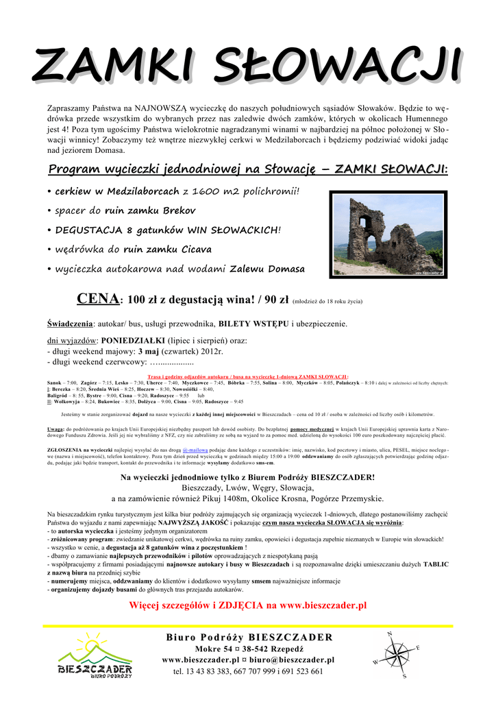 ZAMKI SŁOWACJI Zapraszamy Państwa na NAJNOWSZĄ wycieczkę do naszych południowych sąsiadów Słowaków. Będzie to wę drówka przede wszystkim do wybranych przez nas zaledwie dwóch zamków, których w okolicach Humennego jest 4! Poza tym ugościmy Państwa wielokrotnie nagradzanymi winami w najbardziej na północ położonej w Sło wacji winnicy! Zobaczymy też wnętrze niezwykłej cerkwi w Medzilaborcach i będziemy podziwiać widoki jadąc nad jeziorem Domasa. Program wycieczki jednodniowej na Słowację – ZAMKI SŁOWACJI: • cerkiew w Medzilaborcach z 1600 m2 polichromii! • spacer do ruin zamku Brekov • DEGUSTACJA 8 gatunków WIN SŁOWACKICH! • wędrówka do ruin zamku Cicava • wycieczka autokarowa nad wodami Zalewu Domasa CENA: 100 zł z degustacją wina! / 90 zł (młodzież do 18 roku życia) Świadczenia : autokar/ bus, usługi przewodnika, BILETY WSTĘPU i ubezpieczenie. dni wyjazdów : PONIEDZIAŁKI (lipiec i sierpień) oraz: - długi weekend majowy: 3 maj (czwartek) 2012r. - długi weekend czerwcowy: …................ Trasa i godziny odjazdów autokaru / busa na wycieczkę 1-dniową ZAMKI SŁOWACJI : Sanok – 7:00, Zagórz – 7:15, Lesko – 7:30, Uherce – 7:40, Myczkowce – 7:45, Bóbrka – 7:55, Solina – 8:00, Myczków – 8:05, Polańczyk – 8:10 i dalej w zależności od liczby chętnych: I : Berezka – 8:20, Średnia Wieś – 8:25, Hoczew – 8:30, Nowosiółki – 8:40, Baligród – 8: 55, Bystre – 9:00, Cisna – 9:20, Radoszyce – 9:55 lub II : Wołkowyja – 8:24, Bukowiec – 8:35, Dołżyca – 9:00, Cisna – 9:05, Radoszyce – 9:45 Jesteśmy w stanie zorganizować dojazd na nasze wycieczki z każdej innej miejscowości w Bieszczadach – cena od 10 zł / osoba w zależności od liczby osób i kilometrów. Uwaga : do podróżowania po krajach Unii Europejskiej niezbędny paszport lub dowód osobisty. Do bezpłatnej pomocy medycznej w krajach Unii Europejskiej uprawnia karta z Naro dowego Funduszu Zdrowia. Jeśli jej nie wybraliśmy z NFZ, czy nie zabraliśmy ze sobą na wyjazd to za pomoc med. udzieloną do wysokości 100 euro poszkodowany najczęściej płacić. ZGŁOSZENIA na wycieczki najlepiej wysyłać do nas drogą @-mailową podając dane każdego z uczestników: imię, nazwisko, kod pocztowy i miasto, ulica, PESEL, miejsce noclego we (nazwa i miejscowość), telefon kontaktowy. Poza tym dzień przed wycieczką w godzinach między 15:00 a 19:00 oddzwaniamy do osób zgłaszających potwierdzając godzinę odjaz du, podając jaki będzie transport, kontakt do przewodnika i te informacje wysyłamy dodatkowo sms-em. Na wycieczki jednodniowe tylko z Biurem Podróży BIESZCZADER! Bieszczady, Lwów, Węgry, Słowacja, a na zamówienie również Pikuj 1408m, Okolice Krosna, Pogórze Przemyskie. Na bieszczadzkim rynku turystycznym jest kilka biur podróży zajmujących się organizacją wycieczek 1-dniowych, dlatego postanowiliśmy zachęcić Państwa do wyjazdu z nami zapewniając NAJWYŻSZĄ JAKOŚĆ i pokazując czym nasza wycieczka SŁOWACJA się wyróżnia: - to autorska wycieczka i jesteśmy jedynym organizatorem - zróżnicowany program: zwiedzanie unikatowej cerkwi, wędrówka na ruiny zamku, opowieści i degustacja zupełnie nieznanych w Europie win słowackich! - wszystko w cenie, a degustacja aż 8 gatunków wina z poczęstunkiem ! - dbamy o zamawianie najlepszych przewodników i pilotów oprowadzających z niespotykaną pasją - współpracujemy z firmami posiadającymi najnowsze autokary i busy w Bieszczadach i są rozpoznawalne dzięki umieszczaniu dużych TABLIC z nazwą biura na przedniej szybie - numerujemy miejsca, oddzwaniamy do klientów i dodatkowo wysyłamy smsem najważniejsze informacje - organizujemy dojazdy busami do głównych tras przejazdu autokarów. Więcej szczegółów i ZDJĘCIA na www.bieszczader.pl Biuro Podróży BIESZCZADER Mokre 54 ¤ 38-542 Rzepedź www.bieszczader.pl ¤ [email protected] tel. 13 43 83 383, 667 707 999 i 691 523 661