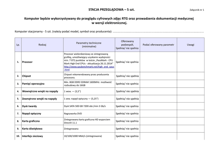 STACJA PRZEGLĄDOWA – 5 szt. Załącznik nr 1 Komputer będzie wykorzystywany do przeglądu cyfrowych zdjęc RTG oraz prowadzenia dokumentacji medycznej w wersji elektronicznej. Komputer stacjonarny - 5 szt. (należy podać model, symbol oraz producenta): …........................................................................................................................................ Lp. Rodzaj Parametry techniczne (minimalne) Oferowany podzespół, Spełnia/ nie spełnia 1. Procesor Procesor wielordzeniowy ze zintegrowaną grafiką, umożliwiający uzyskanie wydajności min. 7 072 punktów w teście „PassMark - CPU Spełnia/ nie spełnia Mark High End CPUs - aktualizacja 26.11.2014” http://www.cpubenchmark.net/high_end_cpus .html 2. Chipset Chipset rekomendowany przez producenta procesora. Spełnia/ nie spełnia 3. Pamięć operacyjna Min. 8GB DDR3 SDRAM 1600MHz możliwość rozbudowy do 16GB Spełnia/ nie spełnia 4. Wewnętrzne wnęki na napędy 1 wew. — (3,5") Spełnia/ nie spełnia 5. Zewnętrzne wnęki na napędy 1 zew. napęd optyczny — (5,25") Spełnia/ nie spełnia 6. Dysk twardy Dysk SATA 500 GB 7200 obr./min 3 Gb/s Spełnia/ nie spełnia 7. Napęd optyczny Nagrywarka DVD Spełnia/ nie spełnia 8. Karta graficzna Zintegrowana karta graficzna HD wsparciem DirectX 11.1 Spełnia/ nie spełnia 9. Karta dźwiękowa Zintegrowana Spełnia/ nie spełnia 10/100/1000 Mbit/s (zintegrowana) Spełnia/ nie spełnia 10. Interfejs sieciowy Podać oferowany parametr Uwagi 11. Porty Min. 6 portów USB wyprowadzonych na zewnątrz komputera w tym min. 2 porty z przodu obudowy i min. 4 porty na tylnym panelu w tym min 2 porty USB 3.0, Wymagana ilość i rozmieszczenie (na zewnątrz obudowy komputera) portów USB nie może być osiągnięta w wyniku stosowania konwerterów, przejściówek Spełnia/ nie spełnia 1 klawiatura PS/2 1 mysz PS/2 1 złącze DisplayPort 1 port VGA 1 gniazdo mikrofonu/słuchawek 1 wejście liniowe 1 wyjście liniowe 1 złącze RJ-45 12. Sloty 1 szt. PCIe x16, 1. szt. PCIe x1 Spełnia/ nie spełnia 13. Obudowa Małogabarytowa o sumie wymiarów max. 82 cm , fabrycznie przystosowana do pracy w układzie pionowym i poziomym. Obudowa otwierana bez konieczności użycia narzędzi. Demontaż kart rozszerzeń, dysku HDD, napędu optycznego bez konieczności użycia narzędzi Spełnia/ nie spełnia 14. Zasilanie Napięcie wejściowe 100–240/115–230 V, 50/60 Hz, aktywną korekcją współczynnika mocy(PFC) Spełnia/ nie spełnia o wysokiej sprawności min 80% Min. 270W 15. Mysz optyczna PS/2 lub USB z rolką Spełnia/ nie spełnia 16. Klawiatura PS/2 lub USB w układzie polski programisty Spełnia/ nie spełnia 17. System operacyjny Microsoft Windows 7 Professional (64-bit) PL, zainstalowany system operacyjny nie wymagający aktywacji za pomocą telefonu lub Internetu w firmie Microsoft + nośnik. (wymagana jest Etykieta Certyfikatu Autentyczności COA) Spełnia/ nie spełnia 18. Bezpieczeństwo BIOS musi posiadać możliwość: skonfigurowania hasła „Power On” oraz ustawienia hasła dostępu do BIOSu (administratora) w sposób gwarantujący utrzymanie zapisanego hasła nawet w przypadku odłączenia wszystkich źródeł zasilania i podtrzymania BIOS, blokady/wyłączenia portów USB, karty sieciowej, karty Spełnia/ nie spełnia audio;blokady/wyłączenia kart rozszerzeń/slotów PCIe kontroli sekwencji bootującej; funkcja blokowania BOOT-owania stacji roboczej z zewnętrznych urządzeń Możliwość zapięcia linki typu Kensington 19. Certyfikaty i standardy Deklaracja zgodności CE, Deklaracja zgodności z dyrektywa Spełnia/ nie spełnia RoHS Min. 3-letnia gwarancja producenta świadczona na miejscu u klienta. Czas reakcji serwisu - do końca następnego dnia roboczego Możliwość szybkiego zgłaszania usterek przez portal internetowy lub telefonicznnie Możliwość aktualizacji i pobrania sterowników do oferowanego modelu komputera w najnowszych certyfikowanych wersjach przy użyciu dedykowanego darmowego oprogramowania producenta lub bezpośrednio z sieci Internet za pośrednictwem strony www producenta komputera po podaniu numeru seryjnego komputera lub modelu komputera 20. Warunki gwarancji Spełnia/ nie spełnia MONITOR – 5 szt. Monitor - 5 szt. (należy podać model, symbol oraz producenta): …................................................................................................................................................................... 1. Monitor Przekątna ekranu min. 21,5 cala, rozdzielczość 1920x1080; Odległość między pikselami 0.248 mm; Czas reakcji matrycy: 8 ms; Jasność: 250 cd/m2; Kontrast: 1000:1 statyczny; Kąty widzenia pion/poziom: min. 178/178 stopni Podświetlenie LED Pochylenie (tilt) Regulacja wysokości (height adjustment) Panel obrotowy (pivot) Monior oznakowany w sposób trwały logo producenta z przodu oraz z tyłu na tabliczce znamionowej. Wejście min.: 15-stykowe D-Sub , DVI; DisplayPort komputera, 3-letnia gwarancja producenta świadczona na miejscu użytkowania Czas naprawy przez serwis - do końca następnego dnia roboczego. Deklaracja zgodności CE Spełnia/ nie spełnia DRUKARKA LASEROWA – 1 szt. Drukarka laserowa - 1 szt. (należy podać model, symbol oraz producenta): …............................................................................................................................................... 1. Drukarka laserowa Zastosowanie - drukowanie laserowe monochromatyczne Obsługiwane formaty – do A-4 Szybkość drukowania – do 25 stron/min Drukowanie dwustronne - automatyczne Złącza – USB, Rozdzielczość – min. 600 x 600 dpi Komunikacja - interfejs sieciowy Ethernet Wydajność – Min. 8 000 stron miesięcznie Podajnik - do 250 arkuszy Odbiornik – do 150 arkuszy (wydruk do dołu) Obsługiwane systemy - Windows 2000/XP/2003/Vista/2008, Windows 7/2008 R2 Oprogramowanie Dołączony nośnik ze sterownikami Deklaracja zgodności dla produktu CE Spełnia/ nie spe