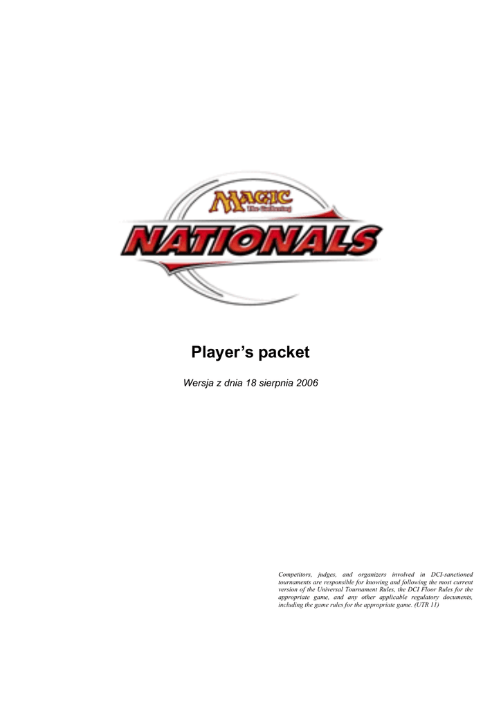 Player’s packet Wersja z dnia 18 sierpnia 2006 Competitors, judges, and organizers involved in DCI-sanctioned tournaments are responsible for knowing and following the most current version of the Universal Tournament Rules, the DCI Floor Rules for the appropriate game, and any other applicable regulatory documents, including the game rules for the appropriate game. (UTR 11) Mistrzostwa Polski 2006 Player’s Packet 1 INFORMACJE ORGANIZACYJNE 1.1 Lokalizacja Miasto: Warszawa Lokal: Szkoła Główna Gospodarstwa Wiejskiego Główna Hala Sportowa ul. Ciszewskiego 10 Dojazd Z Dworca Centralnego: Autobus 151 (w kierunku Gocław) do przystanku Pl. Na Rozdrożu. Następnie autobus 513 (w kierunku Kabaty) do przystanku CiszewskiegoSGGW. Metro do stacji Stokłosy i 15 min piechotą. Czas przejazdu w obu wypadkach ok. 30 minut. 1.2 Data i informacje o imprezie Mistrzostwa Polski 2006 odbędą się w dniach 9 – 10 września 2006. Dzień wcześniej odbędzie się turniej kwalifikacyjny (tzw. Grinder). Mistrzostwa Polski odbywają się w trakcie targów gier strategicznych Mariasz (http://www.mariasz.pl). Uczestnicy konwentu Mariasz opłacają organizatorom wstęp według wybranej opcji: • • 15 PLN – w cenie obiad w sobotę 50 PLN – cenie obiad w sobotę oraz 2 noclegi w akademiku (ok. 400 m od miejsca konwentu) Wszelkie opłaty wnosi się na miejscu. 1.3 Noclegi Noclegi można otrzymać w ramach konwentu lub zapewnić we własnym zakresie. 1.4 Przydatne informacje w sieci Strona firmy ISA - http://www.isa.pl Wirtualny Plan Warszawy - http://www.twojemiasto.pl Rozkład komunikacja miejskiej – http://www.ztm.waw.pl Szkoła Główna Gospodarstwa Wiejskiego – http://www.sggw.waw.pl 2 Mistrzostwa Polski 2006 Player’s Packet 2 ZASADY OBOWIĄZUJĄCE NA TERENIE MP 2.1 Widzowie Widzowie mogą oglądać przebieg meczów. Muszą jednak spełniać następujące warunki: • • Nie wolno rozmawiać z graczami i między sobą. Należy umożliwić sędziom swobodne przejście i dostęp do stolików, na których odbywają się mecze. • Widzom nie wolno siadać przy stolikach. • Nie wolno przestawiać krzeseł, stołów, numerów stolików. Gracz ma prawo poprosić sędziego o odsunięcie widza od stolika przy którym gra bez podania przyczyny. Osoby, które zauważyły powiadomić sędziego. złamanie przepisu powinny niezwłocznie Na terenie Mistrzostw Polski obowiązuje zakaz spożywania alkoholu. Palenie jest dozwolone tylko w wyznaczonych miejscach. Sędzia główny, organizator oraz kierownictwo obsługi obiektu mogą zakazać wstępu osobom łamiącym te lub inne postanowienia na teren, gdzie odbywają się Mistrzostwa Polski. 2.2 Prasa Przebieg meczów i draftów mogą notować, fotografować i nagrywać osoby, które uzyskały zgodę sędziego głównego. Osoby, które chcą relacjonować mecze, w szczególności feature matches, powinny skontaktować się wcześniej z sędzią głównym. Feature matches W każdej rundzie jedna lub więcej par rozgrywających mecz może zostać wybrana do tzw. feature match. Mecze te są rozgrywane w specjalnie do tego wyznaczonym miejscu. Gracz nie może odmówić gry w feature match. Gracze uczestniczący w feature match są zobowiązane pokazać osobie relacjonującej decyzje odnośnie sideboardowania. 3 Mistrzostwa Polski 2006 Player’s Packet 2.3 Uczestnicy Mistrzostw Polski Uczestnicy Mistrzostw Polski są zobowiązani do przestrzegania zasad dotyczących widzów. Ponadto: • • Na stołach do gry nie wolno stawiać napojów i jedzenia. Na prośbę sędziego należy usunąć z stołu maskotki, pudełka na karty, itp. Naruszenie tych i innych postanowień wiąże się z otrzymaniem odpowiedniej kary za Unsporting Conduct (Minor, Major, Severe). 2.4 Telefony komórkowe Na terenie Mistrzostw Polski obowiązuje zakaz rozmowy przez telefony komórkowe. Aparaty powinny mieć wyciszony dzwonek. Sędzia główny może uchylić tę zasadę w wyjątkowych okolicznościach na indywidualną prośbę. 4 Mistrzostwa Polski 2006 Player’s Packet 3 DODATKOWE ATRAKCJE 3.1 Grinder Data: 8 września 2006 (piątek) Format: Standard, single-elimination Nagrody: 8 zaproszeń na Mistrzostwa Polski Koszt: bezpłatny Rejestracja: 1800 – 1900 Spisy talii: Obowiązkowe przy rejestracji Po wyłonieniu Top 8 turniej nie będzie kontynuowany. 3.2 Egzaminy sędziowskie Egzaminy sędziowskie przeprowadza Adam Cetnerowski (level 3). Osoby pragnące zdawać egzamin sędziowski powinny się skontaktować wcześniej pod adresem [email protected]. Egzamin sędziowski wymaga wcześniejszego przygotowania poprzez naukę zasad. Od kandydatów wymagane jest nadesłanie zgłoszenia do sędziowania i praca podczas wszystkich trzech dni imprezy. 3.3 Side-events Przewiduje się następujące turnieje towarzyszące Mistrzostwom Polski: Piątek Grinder – patrz wyżej Niedziela 12: 00 Sealed Deck Codziennie będą odbywać się sankcjonowane turnieje limited i constructed po uzbieraniu się 8 chętnych. Wpisowe: • Constructed – 12 PLN • Booster Draft – 35 PLN • Sealed Deck – 65 PLN Podobnie, jak w co rok, w czasie Mistrzostw będą miały miejsce atrakcyjne promocje, tanie drafty poszczególnych edycji i możliwość zakupu produktów na miejscu. Inne turnieje poboczne Osoby mające własny pomysł na urozmaicenie Mistrzostw Polski lub ciekawy side-event proszone są o uprzedni kontakt z Marcelem ([email protected]) 5 Mistrzostwa Polski 2006 Player’s Packet 4 HARMONOGRAM Podane czasy są orientacyjne i mogą ulec zmianie. Piątek, 8 września 2006 Otwarcie sali 1800 1800 Rejestracja na Grinder 00 Rozpoczęcie Grinder’a 19 00 00 19 -20 Rejestracja na Mistrzostwa Polski Sobota, 9 września 2006 Rejestracja na Mistrzostwa Polski 800 – 845 850 Player’s meeting 00 Runda 1 9 Zostanie rozegranych siedem rund i dwa drafty w następującej kolejności: • 3 rundy taliami Standard • Draft #1: Ravnica Block • 3 rundy taliami z Draft #1 • Draft #2: Coldsnap • 1 runda 