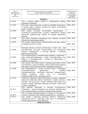EFEKTY KSZTAŁCENIA DLA KIERUNKU (K) DIETETYKA K_W01 K_W02 K_W03 K_W04 K_W05 K_W06 K_W07 K_W08 K_W09 K_W10 K_W11 K_W12 K_W13 ZBIÓR EFEKTÓW KSZTAŁCENIA DLA KIERUNKU DIETETYKA STUDIA PIERWSZEGO STOPNIA Po ukończeniu studiów I stopnia na kierunku Dietetyka Absolwent: WIEDZA Zna i rozumie ogólne zmiany w metabolizmie kobiety ciężarnej i karmiącej Zna rolę i zapotrzebowanie na główne składniki pokarmowe w okresie ciąży i laktacji, rozumie ich wpływ na przebieg ciąży i wyniki położnicze Zna zasady żywienia noworodków donoszonych i urodzonych przedwcześnie, rozumie odmienności funkcji przewodu pokarmowego zależne od stopnia dojrzałości dziecka Zna zalety karmienia naturalnego oraz schemat żywienia dziecka nie karmionego piersią Zna zasady rozpoznawania niedożywienia oraz jego wpływ na funkcje życiowe u dzieci Rozumie procesy rozwoju osobniczego u dzieci oraz rolę prawidłowego żywienia dostosowanego do naturalnych potrzeb wynikających z rozwoju dziecka i zmiennej aktywności fizycznej Zna psychologiczne uwarunkowania kontaktu z pacjentem i jego rodzicami/opiekunami, zasady komunikowania oraz bariery w komunikowaniu i wiedzę tę wykorzystuje w edukacji żywieniowej Zna zasady odżywiania kobiety ciężarnej przewlekle chorej oraz kobiety z ciążą powikłaną a także profil bezpieczeństwa dla matki i płodu doustnych leków hipoglikemizujących Zna etiopatogenezę i zasady żywienia dzieci z chorobami uwarunkowanymi genetycznie, o podłożu immunologicznym, chorobami przewodu pokarmowego, układu krążenia, nerek oraz w chorobach endokrynologicznych i neurologicznych Wykazuje znajomość zapotrzebowania na energię i składniki odżywcze niemowląt, dzieci i młodzieży w stanie zdrowia i choroby. Zna przyczyny i skutki zaburzeń odżywiania oraz zasady i metody wdrażania zdrowego żywienia i stylu życia u dzieci i młodzieży. Zna substraty stosowane w leczeniu żywieniowym, wskazania i przeciwwskazania do żywienia dojelitowego oraz metody podania żywienia do układu naczyniowego. Zna i rozumie niebezpieczeństwa związane ze stosowaniem u dzieci i młodzieży diet niekonwencjonalnych, ,,modnych,, Zna zasady i znaczenie promocji zdrowia, właściwego odżywiania dzieci i zdrowego stylu życia w profilaktyce chorób społecznych i dietozależnych. UMIEJĘTNOŚCI ODNIESIENIE DO EFEKTÓW KSZTAŁCENIA DLA OBSZARU STUDIÓW MEDYCZNYCH OM1_W01 OM1_W01 OM1_W01 OM1_W01 OM1_W01 OM1_W02 OM1_W02 OM1_W03 OM1_W03 OM1_W03 OM1_W03 OM1_W03 OM1_W04 K_U01 K_U02 K_U03 K_U04 K_U05 K_U06 K_U07 K_U08 K_U09 K_K01 K_K02 Planuje i ocenia jadłospis dla kobiety ciężarnej i karmiącej w sytuacji zdrowia i choroby Opracowywuje indywidualny plan żywienia dla zdrowych i chorych dzieci w sytuacji typowej i we współistnieniu chorób w oparciu o obowiązujące normy żywienia Potrafi dokonać oceny stanu odżywienia u dzieci i młodzieży, rozpoznać niedożywienie, zaproponować terapię żywieniową wykorzystując możliwości podaży diety do przewodu pokarmowego. Oblicza średnioważoną normę żywienia dla dzieci zdrowych i chorych w żywieniu zbiorowym Edukuje dzieci i ich rodziców w zakresie zleconej diety, przygotowuje materiały edukacyjne dla pacjenta/opiekuna dziecka Potrafi przewidzieć skutki długotrwałego głodzenia lub niedoborów u zdrowych i w okresie choroby dzieci i młodzieży, zna rolę dietetyka w monitorowaniu i planowaniu właściwego postępowania żywieniowego w celu zapobiegania następstwom głodzenia. Zna wartości referencyjne i potrafi wykorzystać wyniki badań laboratoryjnych w planowaniu indywidualnego jadłospisu dla pacjenta Potrafi przeprowadzić wywiad żywieniowy i dokonać zmian w sposobie żywienia dziecka zdrowego i chorego Potrafi dokonać odpowiedniego doboru surowców do produkcji potraw dla dzieci w różnym wieku stosowanych w dietoterapii oraz zastosować odpowiednie techniki ich sporządzania Posiada umiejętność stałego dokształcania się oraz świadomość własnych ograniczeń i wie kiedy zwrócić się do innych o pomoc Przestrzega zasad etyki zawodowej w pracy z dzieckiem i jego rodziną, stawia dobro pacjenta na pierwszym miejscu OM1_U01 OM1_U01 OM1_U01 OM1_U01 OM1_U01 OM1_U01 OM1_U01 OM1_U01 OM1_U01 OM1_K01 OM1_K01 Objaśnienie symboli: K- kierunkowe efekty kształcenia W- kategoria wiedzy U- kategoria umiejętności K- kategoria kompetencji społecznych OM1- efekty kształcenia w obszarze nauk medycznych dla studiów pierwszego stopnia EFEKTY KSZTAŁCENIA DLA KIERUNKU (K) DIETETYKA K_W01 K_W02 K_W03 K_W04 K_W05 K_W06 K_W07 K_W08 K_W09 K_W10 K_W11 K_W12 K_W13 K_W14 K_W15 K_W16 K_W17 ZBIÓR EFEKTÓW KSZTAŁCENIA DLA KIERUNKU DIETETYKA STUDIA DRUGIEGO STOPNIA Po ukończeniu studiów II stopnia na kierunku Dietetyka Absolwent: WIEDZA Zna i różnicuje diety hipoantygenowe i hipoalergenowe oraz wskazania do ich stosowania w żywieniu dzieci Zna zasady planowania posiłków i normy żywienia dla dzieci i młodzieży oraz możliwości ich modyfikacji w zależności od stanu zdrowia Zna zasady wykorzystania technik informatycznych w optymalizacji żywienia dzieci i młodzieży Zna i rozumie mechanizmy regulujące łaknienie u dzieci oraz metabolizm podstawowych składników odżywczych Zna podstawy psychologii klinicznej i wykorzystuje je w pracy z dziećmi oraz ich opiekunami w rozwiązywaniu problemów zdrowotnych, socjalnych i rodzinnych. Zna zagadnienia dotyczące epidemiologii żywieniowej, związki pomiędzy żywieniem we wczesnym okresie życia a wskaźnikami stanu zdrowia, czynnikami ryzyka rozwoju i występowaniem chorób. Zna sposoby prowadzenia badań dotyczących sposobu żywienia dzieci i młodzieży oraz potrafi je wykorzystać w planowaniu i modyfikacji żywienia Zna wpływ szczepień w przebiegu ciąży i żywienia kobiet w ciąży wysokiego ryzyka na rozwój płodu i dziecka Zna postępowanie dietetyczne u dzieci po zabiegach chirurgicznych oraz problemy żywienia dzieci w onkologii Zna diety, kryteria, pod