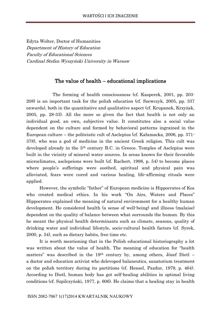 WARTOŚCI I ICH ZNACZENIE Edyta Wolter, Doctor of Humanities Department of History of Education Faculty of Educational Sciences Cardinal Stefan Wyszyński University in Warsaw The value of health – educational implications The forming of health consciousness (cf. Kasperek, 2001, pp. 203208) is an important task for the polish education (cf. Szewczyk, 2005, pp. 337 onwards), both in the quantitative and qualitative aspect (cf. Krupanek, Krzyżak, 2005, pp. 28-33). All the more so given the fact that health is not only an individual good, an own, subjective value. It constitutes also a social value dependent on the culture and formed by behavioral patterns ingrained in the European culture – the politeistic cult of Asclepius (cf. Kałamacka, 2006, pp. 371378), who was a god of medicine in the ancient Greek religion. This cult was developed already in the 5th century B.C. in Greece. Temples of Asclepius were built in the vicinity of mineral water sources. In areas known for their favorable microclimates, asclepeions were built (cf. Rachert, 1998, p. 54) to become places where people’s sufferings were soothed, spiritual and physical pain was alleviated, fears were cured and various healing, life-affirming rituals were applied. However, the symbolic “father” of European medicine is Hippocrates of Kos who created medical ethics. In his work “On Airs, Waters and Places” Hippocrates explained the meaning of natural environment for a healthy human development. He considered health (a sense of well-being) and illness (malaise) dependent on the quality of balance between what surrounds the human. By this he meant the physical health determinants such as climate, seasons, quality of drinking water and individual lifestyle, socio-cultural health factors (cf. Syrek, 2000, p. 54), such as dietary habits, free time etc. It is worth mentioning that in the Polish educational historiography a lot was written about the value of health. The meaning of education for “health matters” was described in the 19th century by, among others, Józef Dietl – a doctor and education activist who delevoped balaneutics, sanatorium treatment on the polish territory during its partitions (cf. Hensel, Pazdur, 1979, p. 464). According to Dietl, human body has got self-healing abilities in optimal living conditions (cf. Szpilczyński, 1977, p. 606). He claims that a healing stay in health ISSN 2082-7067 1(17)2014 KWARTALNIK NAUKOWY WARTOŚCI I ICH ZNACZENIE resorts such as Krzeszowice, Swoszowice, Szczawnica, Krynica, Iwonicz, Busko or Solec results in psychophysical well-being due to the impact of medicinal water sources (cf. Dietl, 1858, pp. 3-363). They are valuable especially considering the fact that they are gifts of native nature, that heal impotence and enrich the country. When explaining the educational implications for the value of health it should also be noted that healthy development of a human depends on his genetic predisposition (congenital), socio-natural environment, socialization/education process and also on the activity of the given individual. The processes inside a human body are not easy to be recognized and ascribed to rules expressed numerically nor to be subordinated to a scientific determinism – the only research concept, because every human has a unique personality. According to the newest direction of education development, one should support student’s progress while methods and rules applied in the educational process shall be adjusted to the student’s aspirations, education possibilities and educational situations. Homo sapiens is a research object in many scientific disciplines. And so the psychological determinants of stress are being examined and described by psychologists, medical determinants – by doctors, in terms of sociological occurrence – sociologists, in terms of educational processes – educationalists. Scientific research enables an extensive recognition and understanding of problems concerning the social reality, also within the scope of educational implications for the value of health. Moreover, it is connected with the holistic human concept (holistic education), explained thanks to the newest achievements of humanities and social sciences (cf. Skulicz, 2004, p. 71; Szyszko-Bohusz, 2002, pp. 42-43). As already stated in this article, along with the rapid development of civilization in the general trend of the post-modern culture, education for adaptation is no longer sufficient. Therefore, education shall be adjusted to the new, entropically developing qualities in the promotion of health as a value (cf. Gmerek, 2001, pp. 225-242), which is recognized and implemented in the educational practice. The socio-ecological health model emphasizes the individual responsibility for one’s own well-being (health). Health education (see Woynarowska, 1995, p. 9) is an educational process aimed at preventing unfavorable occurances for health and for understanding that every individual is a co-creator of his own well-being, considering the meaning of health as a value (resource/wealth) and a precious means for everyday life of a given person. This FIDES ET RATIO Strona 131 WARTOŚCI I ICH ZNACZENIE idea constitutes also an implication of a salutogenetic health concept (A. Antonovsky). Among factors conditioning health it is the lifestyle that constitutes the determinant (about 50-53 %), while genetic predisposition (about 16-20 %) and natural environment (about 20 %) have a smaller impact in health (cf. Gaweł, 2003, pp. 11-18; Wolski, 2009, p. 7). This is why in 1992 a network of schools promoting health was created, among others in Poland (cf. Woynarowska, 1995, pp. 23 onwards; Woynarowska, 2000, passim; Zajączkowski, 2001, pp. 10 onwards). Those schools create a real partnership between school, home and local society; they also strengthen the self-esteem of students, their parents and the staff; various teaching methods are applied and the stress level is adj
