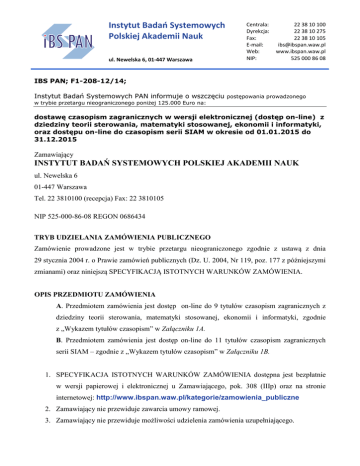 Instytut Badań Systemowych Polskiej Akademii Nauk ul. Newelska 6, 01-447 Warszawa Centrala: Dyrekcja: Fax: E-mail: Web: NIP: 22 38 10 100 22 38 10 275 22 38 10 105 [email protected] www.ibspan.waw.pl 525 000 86 08 IBS PAN; F1-208-12/14; Instytut Badań Systemowych PAN informuje o wszczęciu postępowania prowadzonego w trybie przetargu nieograniczonego poniżej 125.000 Euro na: dostawę czasopism zagranicznych w wersji elektronicznej (dostęp on-line) z dziedziny teorii sterowania, matematyki stosowanej, ekonomii i informatyki, oraz dostępu on-line do czasopism serii SIAM w okresie od 01.01.2015 do 31.12.2015 Zamawiający INSTYTUT BADAŃ SYSTEMOWYCH POLSKIEJ AKADEMII NAUK ul. Newelska 6 01-447 Warszawa Tel. 22 3810100 (recepcja) Fax: 22 3810105 NIP 525-000-86-08 REGON 0686434 TRYB UDZIELANIA ZAMÓWIENIA PUBLICZNEGO Zamówienie prowadzone jest w trybie przetargu nieograniczonego zgodnie z ustawą z dnia 29 stycznia 2004 r. o Prawie zamówień publicznych (Dz. U. 2004, Nr 119, poz. 177 z późniejszymi zmianami) oraz niniejszą SPECYFIKACJĄ ISTOTNYCH WARUNKÓW ZAMÓWIENIA. OPIS PRZEDMIOTU ZAMÓWIENIA A. Przedmiotem zamówienia jest dostęp on-line do 9 tytułów czasopism zagranicznych z dziedziny teorii sterowania, matematyki stosowanej, ekonomii i informatyki, zgodnie z „Wykazem tytułów czasopism” w Załączniku 1A. B. Przedmiotem zamówienia jest dostęp on-line do 11 tytułów czasopism zagranicznych serii SIAM – zgodnie z „Wykazem tytułów czasopism” w Załączniku 1B. 1. SPECYFIKACJA ISTOTNYCH WARUNKÓW ZAMÓWIENIA dostępna jest bezpłatnie w wersji papierowej i elektronicznej u Zamawiającego, pok. 308 (IIIp) oraz na stronie internetowej: http://www.ibspan.waw.pl/kategorie/zamowienia_publiczne 2. Zamawiający nie przewiduje zawarcia umowy ramowej. 3. Zamawiający nie przewiduje możliwości udzielenia zamówienia uzupełniającego. 4. Zamawiający dopuszcza składanie ofert częściowych. 5. Zamawiający nie dopuszcza składania ofert wariantowych. 6. Zamawiający nie przewiduje aukcji elektronicznej. 7. W przetargu mogą wziąć udział oferenci, których oferta odpowiada ogólnym zasadom określonym w ustawie o Prawie zamówień publicznych z dnia 29 stycznia 2004 r. (Dz.U. 2004, Nr 119, poz. 177 z późniejszymi zmianami) oraz spełnia wymagania określone w załączonej do ogłoszenia SPECYFIKACJI ISTOTNYCH WARUNKÓW ZAMÓWIENIA i w pozostałych dokumentach przetargowych. MIEJSCE REALIZACJI (DOSTAWY) ZAMÓWIENIA INSTYTUT BADAŃ SYSTEMOWYCH PAN Biblioteka ul. Newelska 6 01-447 Warszawa TERMIN REALIZACJI ZAMÓWIENIA Od 01.01.2015r. do 31.12.2015 r. (dostawa wszystkich woluminów w wersji elektronicznej rocznika 2015 z uwzględnieniem opóźnień wydawców). INFORMACJE O WADIUM Wadium nie jest wymagane TERMIN ZWIĄZANIA Z OFERTĄ Termin związania z ofertą wynosi 30 dni licząc od upływu daty składania ofert. WYMAGANY SPOSÓB PRZYGOTOWANIA OFERTY 1. Oferent podaje wycenę w EURO (z należnym podatkiem VAT) wszystkich tytułów czasopism w wersji on-line wymienionych w załączonych „Wykazach czasopism” (Załącznik 1A i 1B) 2. Oferent podaje szczegółowe podstawy kalkulacji ceny. 3. Oferent określa szczegółowo warunki bezpośredniej dostawy zamówienia. 4. Oferent określa formy dostawy zamówienia 5. Oferent określa wysokość wymaganej zaliczki i terminy wpłat. 6. Oferent określa wysokość marży dostawcy. IBS PAN; F1-208-12/14; str 2 z 8 7. Oferent określa szczegółowo warunki dostępu do wersji elektronicznych poszczególnych tytułów czasopism on-line (wraz z dostępem do wersji archiwalnych), w trakcie okresu dostawy. 8. Oferent określa warunki dostępu do wersji elektronicznych archiwalnych tytułów czasopism po zakończeniu okresu dostawy. 9. Oferent omawia szczegółowo gwarancje dotyczące stałego dostępu on-line do tytułów zamieszonych w Załącznikach 1A i 1B 10. Oferent określa szczegółowe warunki składania reklamacji i gwarancji dostaw do on-line brakujących tytułów, w tym również wysokość kar umownych. WARUNKI JAKIE MUSZĄ SPEŁNIAĆ UBIEGAJĄCY SIĘ O ZAMÓWIENIE W przetargu mogą wziąć udział oferenci: 1. Niewykluczeni na podstawie art. 22 ustawy o Prawie zamówień publicznych, spełniający warunki tej ustawy oraz • wymogi określone w Specyfikacji Istotnych Warunków Zamówienia; • przedkładający oświadczenia zgodnie z art. 22 i 25 ustawy o Prawie zamówień publicznych; • wyrażający zgodę na zabezpieczenie wykonania umowy w formie pieniężnej lub gwarancji bankowej w wysokości 5% wartości zamówienia. 2. Przedkładający projekt umowy, zawierający między innymi: • określenie przedmiotu zamówienia (dostawa prenumeraty czasopism zagranicznych w roku 2015, zgodnie z Załącznikiem 2 „Wykaz czasopism”), określenie ceny zamówienia zawierającej oferowane marże, upusty oraz koszty przesyłki; • oznaczenie terminu wykonania umowy; • ustalenie okresu i warunków gwarancji; • określenie warunków płatności i form rozliczenia; • określenie wysokości kar umownych z tytułu niewywiązywania się z umowy lub niewłaściwej jej realizacji; • dokładne oznaczenie stron umowy. 3. Wyrażający zgodę na zmniejszenie wartości zamówienia o nie więcej niż 25% bez zmiany warunków oferty. 4. Składający ofertę na załączonym druku „Formularz ofertowy” (Załącznik 1). IBS PAN; F1-208-12/14; str 3 z 8 KRYTERIA OCENY OFERT 1. Cena prenumeraty czasopism zgodnie z Załącznikami 1A i 1B( 70%) 2. Stały dostęp do pełnych tekstów wersji elektronicznej po zakończeniu dostawy - (20%) 3. Warunki płatności, gwarancji i serwisu - (udział procentowy: 10%). SPOSÓB WYBORU OFERTY Wszystkie kryteria (każda część przetargu osobno) będą punktowane w skali od 1 do 10 punktów, z dokładością do czterech miejsc po przecinku. Pierwsze kryterium będzie punktowane wg wzoru: Wartość punktowa oferty = najniższa łączna cena brutto ------------------------------------------ x 10 