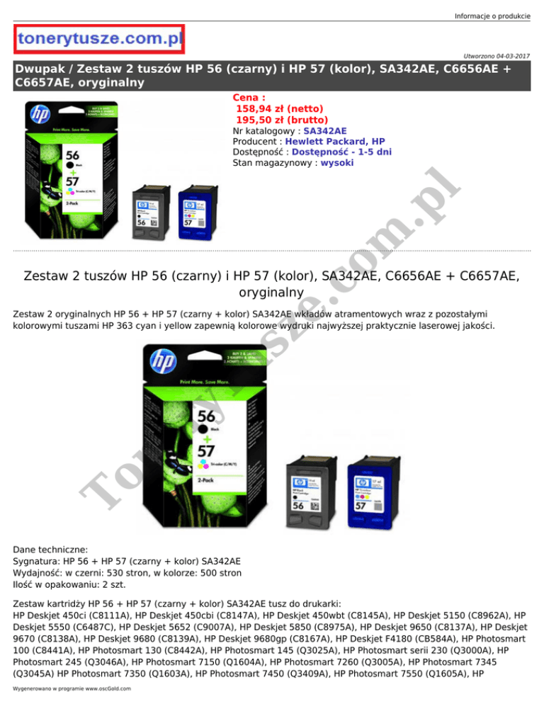 Informacje o produkcie Utworzono 04-03-2017 Dwupak / Zestaw 2 tuszów HP 56 (czarny) i HP 57 (kolor), SA342AE, C6656AE + C6657AE, oryginalny Cena : 158,94 zł (netto) 195,50 zł (brutto) om .p l Nr katalogowy : SA342AE Producent : Hewlett Packard, HP Dostępność : Dostępność - 1-5 dni Stan magazynowy : wysoki sz e. c Zestaw 2 tuszów HP 56 (czarny) i HP 57 (kolor), SA342AE, C6656AE + C6657AE, oryginalny To ne r yT u Zestaw 2 oryginalnych HP 56 + HP 57 (czarny + kolor) SA342AE wkładów atramentowych wraz z pozostałymi kolorowymi tuszami HP 363 cyan i yellow zapewnią kolorowe wydruki najwyższej praktycznie laserowej jakości. Dane techniczne: Sygnatura: HP 56 + HP 57 (czarny + kolor) SA342AE Wydajność: w czerni: 530 stron, w kolorze: 500 stron Ilość w opakowaniu: 2 szt. Zestaw kartridży HP 56 + HP 57 (czarny + kolor) SA342AE tusz do drukarki: HP Deskjet 450ci (C8111A), HP Deskjet 450cbi (C8147A), HP Deskjet 450wbt (C8145A), HP Deskjet 5150 (C8962A), HP Deskjet 5550 (C6487C), HP Deskjet 5652 (C9007A), HP Deskjet 5850 (C8975A), HP Deskjet 9650 (C8137A), HP Deskjet 9670 (C8138A), HP Deskjet 9680 (C8139A), HP Deskjet 9680gp (C8167A), HP Deskjet F4180 (CB584A), HP Photosmart 100 (C8441A), HP Photosmart 130 (C8442A), HP Photosmart 145 (Q3025A), HP Photosmart serii 230 (Q3000A), HP Photosmart 245 (Q3046A), HP Photosmart 7150 (Q1604A), HP Photosmart 7260 (Q3005A), HP Photosmart 7345 (Q3045A) HP Photosmart 7350 (Q1603A), HP Photosmart 7450 (Q3409A), HP Photosmart 7550 (Q1605A), HP Wygenerowano w programie www.oscGold.com To ne r yT u sz e. c om .p l Photosmart 7660 (Q3010A), HP Photosmart 7760 (Q3015A), HP Photosmart 7960 (Q3020A), HP Photosmart 7960gp (Y2270A), HP Photosmart PSC 2410 (Q3087A), HP Photosmart PSC 2510 (Q3094A), HP Officejet 4110 (Q1609A), HP Officejet 4255 (Q5611A), HP Officejet 5510 (Q3435A), HP Officejet 6110 (Q1638A), HP PSC 1205 (Q1665A), HP PSC 1210 (Q1662A), HP PSC 1215 (Q5894A), HP PSC 1350 (Q3501A), HP PSC 2105 (C8647A), HP PSC 2110 (C8648A), HP PSC 2175 (Q3068A), HP PSC 2210 (C8658A)