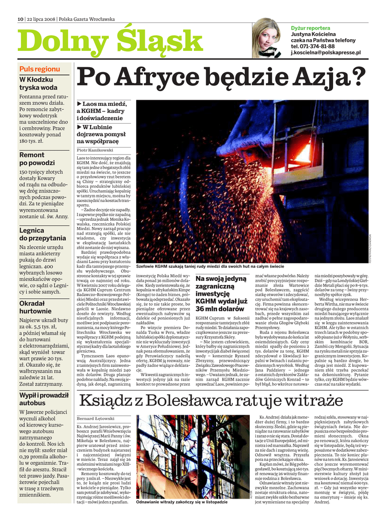 10 | 22 lipca 2008 | Polska Gazeta Wrocławska Dolny Śląsk Dyżur reportera Justyna Kościelna czeka na Państwa telefony tel. 071-374-81-88 [email protected] W Kłodzku tryska woda Po Afryce będzie Azja? Fontanna przed ratuszem znowu działa. Po remoncie zabytkowy wodotrysk ma uszczelnione dno i cembrowiny. Prace kosztowały ponad 180 tys. zł. b Laos ma miedź, a KGHM – kadry i doświadczenie b W Lubinie dojrzewa pomysł na współpracę 150 tysięcy złotych dostały Kowary od rządu na odbudowę dróg zniszczonych podczas powodzi. Za te pieniądze wyremontowana zostanie ul. św. Anny. Legnica do przepytania Na zlecenie urzędu miasta ankieterzy pukają do drzwi legniczan. 400 wybranych losowo mieszkańców opowie, co sądzi o Legnicy i sobie samych. Okradał hurtownie Najpierw ukradł buty za ok. 5,5 tys. zł, a później włamał się do hurtowani z elektronarzędziami, skąd wyniósł towar wart prawie 20 tys. zł. Okazało się, że wałbrzyszanin ma zaledwie 21 lat. Został zatrzymany. Wypił i prowadził autobus W Jaworze policjanci wyczuli alkohol od kierowcy kursowego autobusu zatrzymanego do kontroli. Nos ich nie mylił: szofer miał 0,39 promila alkoholu w organizmie. Trafił do aresztu. Stracił też prawo jazdy. Pasażerowie pojechali w trasę z trzeźwym zmiennikiem. Piotr Kanikowski Laos to interesujący region dla KGHM. Nie dość, że znajdują się tam jedne z bogatszych złóż miedzi na świecie, to jeszcze o przysłowiowy rzut beretem są Chiny – strategiczny odbiorca produktów lubińskiej spółki. Uruchamiając kopalnię w tamtym miejscu, można by zaoszczędzić na kosztach transportu. – Żadne decyzje nie zapadły. I zapewne prędko nie zapadną – uprzedza jednak Monika Kowalska, rzeczniczka Polskiej Miedzi. Nowy zarząd pracuje nad strategią spółki, ale nie wiadomo, czy inwestycja w eksploatację laotańskich złóż zostanie do niej wpisana. Bardziej prawdopodobna wydaje się współpraca z władzami Laosu przy kształceniu kadr dla tamtejszego przemysłu wydobywczego. Obustronne kontakty w tej sprawie trwają co najmniej od roku. W kwietniu 2007 roku delegacja KGHM Cuprum Centrum Badawczo-Rozwojowego Polskiej Miedzi oraz przedstawiciele Politechniki Wrocławskiej gościli w Laosie. Niedawno doszło do rewizyty. Według nieoficjalnych informacji, możliwe jest podpisanie porozumienia, na mocy którego Politechnika Wrocławska we współpracy z KGHM podejmą się wykształcenia specjalistycznej kadry dla laotańskiego górnictwa. Tymczasem Laos opanowują Australijczycy. Jedna z tamtejszych firm zainwestowała w kopalnię miedzi 240 mln dolarów. Druga planuje podobne nakłady. Na swoją jedyną, jak dotąd, zagraniczną FOT.PIOTR KRZYŻANOWSKI Remont po powodzi Szefowie KGHM szukają taniej rudy miedzi dla swoich hut na całym świecie inwestycję Polska Miedź wydała ponad 36 milionów dolarów. Kiedy zorientowała się, że kopalnia w afrykańskim Kimpe (Kongo) to żaden biznes, próbowała ją odsprzedać. Okazało się, że to nie takie proste, bo pieniądze oferowane przez ewentualnych nabywców są dalekie od poniesionych już nakładów. Po wizycie premiera Donalda Tuska w Peru, władze lubińskiej spółki dyplomatycznie nie wykluczały inwestycji w Ameryce Południowej. Jednak poza sformułowaniem, że gdy Peruwiańczycy nadeślą ofertę, KGHM ją rozważy, nie padły żadne wiążące deklaracje. W kwestii zagranicznych inwestycji jedyny jak na razie konkret to prowadzone przez znać własne podwórko. Należy zrobić precyzyjniejsze rozpoznanie złoża Wartowice pod Bolesławcem, zagęścić siatkę otworów i zdecydować, czy uruchomić tam eksploatację. Firma powinna skoncentrować się na krajowych zasobach, przede wszystkim zaś zadbać o pełne zagospodarowanie złoża Głogów Głęboki Przemysłowy. Ruda z rejonu Bolesławca była wydobywana do końca lat osiemdziesiątych. Gdy ceny miedzi spadły do poziomu 2 tys. dolarów za tonę, KGHM zdecydował o likwidacji kopalni w Iwinach i zalaniu podziemnych wyrobisk. Według Jana Paździory – jednego z ostatnich dyrektorów Zakładów Górniczych Konrad – to był błąd, bo wkrótce notowa- Na swoją jedyną zagraniczną inwestycję KGHM wydał już 36 mln dolarów KGHM Cuprum w Saksonii rozpoznanie tamtejszych złóż rudy miedzi. Te działania zapoczątkowano jeszcze za prezesury Krzysztofa Skóry. – Nie jestem człowiekiem, który bałby się zagranicznych inwestycji jak diabeł święconej wody – komentuje Ryszard Zbrzyzny, przewodniczący Związku Zawodowego Pracowników Przemysłu Miedziowego. – Uważam jednak, że zanim zarząd KGHM zacznie sprawdzać Laos, powinien po- nia miedzi poszybowały wgórę. Dziś – gdy na Londyńskiej Giełdzie Metali płaci się po 8-9 tys. dolarów za tonę – Iwiny przynosiłyby spółce zysk. Według wiceprezesa Herberta Wirtha, nie ma w świecie drugiego dużego producenta miedzi bazującego wyłącznie na jednym złożu. Laos znalazł się w kręgu zainteresowania KGHM. Ale tylko w ostatnich trzech latach w podobny sposób pisano już o Wołyniu, serbskim kombinacie BOR, Zambii czy Mongolii. Sytuacja na rynku metali nie sprzyja zagranicznym inwestycjom. Kopalnie są bardzo drogie, bo droga jest miedź. Z kupowaniem złóż trzeba poczekać na dekoniunkturę. Pytanie tylko, czy KGHM będzie wówczas stać na takie wydatki. Ksiądz z Bolesławca ratuje witraże Bernard Łętowski Ks. Andrzej Jarosiewicz, proboszcz parafii Wniebowzięcia Najświętszej Marii Panny i św. Mikołaja w Bolesławcu, najpierw uratował przed zniszczeniem budynek najstarszej i najcenniejszej świątyni w mieście. Teraz zajął się 26 stuletnimi witrażami tego XIII-wiecznego kościoła. Remonty kosztowały do tej pory 3 mln zł. – Niezwykłe jest to, że ksiądz nie prosi ludzi w kościele o pieniądze. Tylko sam potrafi je zdobywać, wykorzystując różne możliwości dotacji – mówi jeden z parafian. AUTOR Puls regionu Odnawianie witraży za