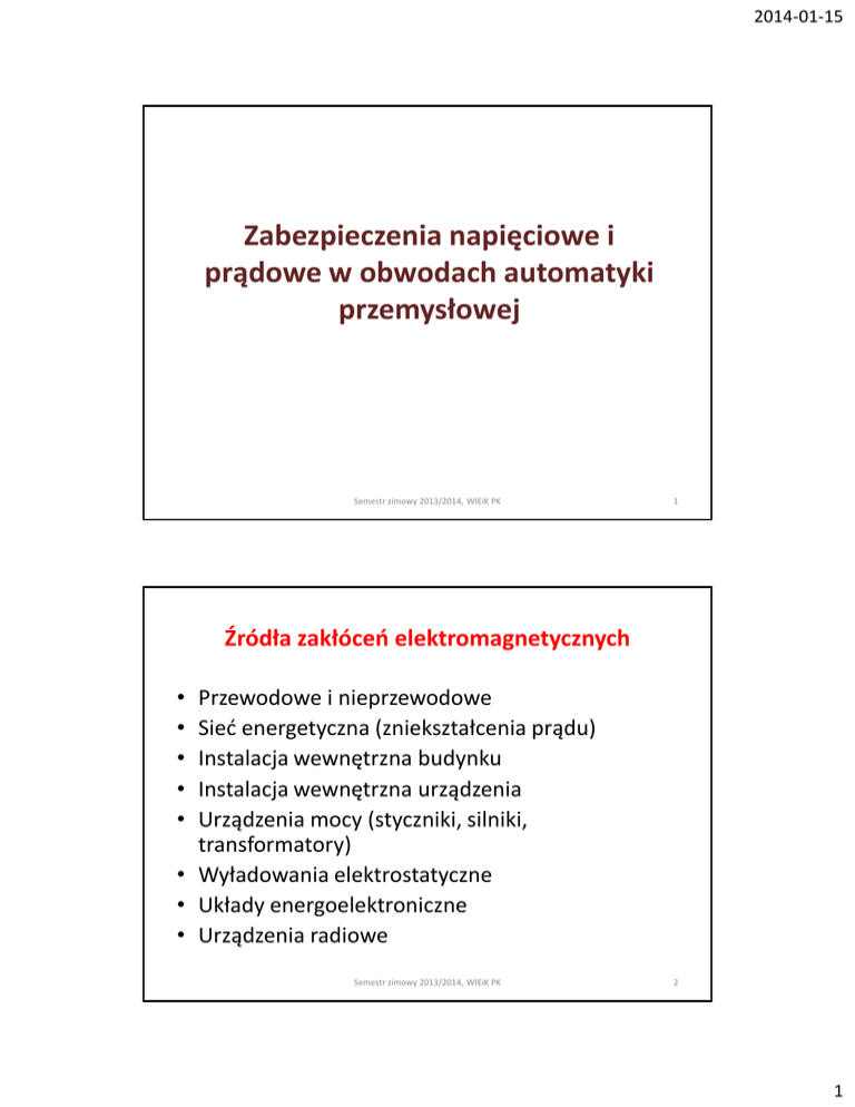 2014-01-15 Zabezpieczenia napięciowe i prądowe w obwodach automatyki przemysłowej Semestr zimowy 2013/2014, WIEiK PK 1 Źródła zakłóceń elektromagnetycznych • • • • • Przewodowe i nieprzewodowe Sieć energetyczna (zniekształcenia prądu) Instalacja wewnętrzna budynku Instalacja wewnętrzna urządzenia Urządzenia mocy (styczniki, silniki, transformatory) • Wyładowania elektrostatyczne • Układy energoelektroniczne • Urządzenia radiowe Semestr zimowy 2013/2014, WIEiK PK 2 1 2014-01-15 Podział obwodów elektrycznych w urządzeniach automatyki przemysłowej • Obwody mocy - zasilające urządzenia (bez zasilającej sieci energetycznej) • Obwody mocy urządzeń wykonawczych • Obwody sygnałowe – Obwody napięciowe (analogowe, dwustanowe) – Obwody prądowe (analogowe, dwustanowe) – Obwody logiczne interfejsów szeregowych • Obwody radiowe Semestr zimowy 2013/2014, WIEiK PK 3 Źródła przepięć • • • • • • • • • • • Wyładowania atmosferyczne (ochrona odgromowa) Stany nieustalone w sieci elektroenergetycznej Impulsowe pola elektromagnetyczne Statyczne ładunki elektryczne (ESD) Przepięcia łączeniowe (zwieranie/rozwieranie obwodów z indukcyjnością – przekaźniki, styczniki, silniki, elektrozawory) Błędne podłączenie przewodów zasilających lub przewodów sygnałowych Uszkodzenie układów zasilania, czujników, elementów wykonawczych Zakłócenia z sąsiednich obwodów elektrycznych (EMC) Uszkodzenia instalacji uziemiającej (różnica potencjałów) Uszkodzenia izolacji przewodów, elementów lub urządzenia Hamowanie silników elektrycznych Semestr zimowy 2013/2014, WIEiK PK 4 2 2014-01-15 Metody ograniczania przepięć • Ochrona odgromowa • Ochrona przeciwprzepięciowa (bierna, aktywna) • Izolacja galwaniczna obwodów Semestr zimowy 2013/2014, WIEiK PK 5 Ochrona przepięciowa Up Wejście Wyjście Element wzdłużny Uwe Ochrona podstawowa Ochrona dodatkowa Uwy Schemat ogólny dwustopniowego układu zabezpieczającego przed przepięciami Semestr zimowy 2013/2014, WIEiK PK 6 3 2014-01-15 Główne założenia dla układów zabezpieczających • W obwodach sygnałowych w normalnych warunkach pracy, elementy i układy zabezpieczające nie powinny zakłócić (zniekształcić) przesyłanych sygnałów, szczególnie sygnałów analogowych. • W obwodach interfejsów szeregowych, elementy zabezpieczające nie powinny ograniczyć szybkości transmisji sygnałów (stromości sygnałów) • Mniej ważne są straty mocy na elementach i układach zabezpieczających. • Ważna jest szybkość reakcji elementów i układów zabezpieczających. Semestr zimowy 2013/2014, WIEiK PK 7 Główne założenia dla układów zabezpieczających • W obwodach zasilających (obwodach mocy) w normalnych warunkach pracy, na elementach i układach zabezpieczających nie powinna być tracona moc. • Ważne są straty mocy (ilość ciepła wydzielana) na elementach i układach zabezpieczających • Ważna jest przeciążalność elementów zabezpieczających • Zredukować przepięcie do określonej wartości w jak najkrótszym czasie • Odprowadzić nadmiar energii i działać do zaniku przepięcia Semestr zimowy 2013/2014, WIEiK PK 8 4 2014-01-15 Elementy do ochrony przepięciowej Elementy do ograniczania przepięć są włączane równolegle do ochranianego urządzenia lub układu – – – – – – – – Odgromniki gazowe Rezystor (dzielnik napięcia) Kondensator, rezystor, dioda - układ RC, RCD Warystor (tlenkowo-cynkowy,) Dioda prostownicza Dioda Zenera Dioda typu Transil (jednokierunkowa i dwukierunkowa) Układy typu crowbar (tyrystor) Semestr zimowy 2013/2014, WIEiK PK 9 Zadanie ochrony przepięciowej Obwód mocy wyjścia dwustanowego Uk Ochrona klucza Io Klucz Uz Uo Ochrona źródła Źródło zasilania AC/DC Ochrona odbiornika Ochrona na zaciskach Semestr zimowy 2013/2014, WIEiK PK Odbiornik R, RL, RLE, RC, C 10 5 2014-01-15 Zadanie ochrony przepięciowej Obwód wejścia dwustanowego Ochrona czujnika czujnik R Iwe X0 Uwe R X1 X2 PLC Ochrona źródła COM Źródło zasilania AC lub DC Ochrona Wejść PLC Semestr zimowy 2013/2014, WIEiK PK 11 Zadanie ochrony przepięciowej i prądowej Obwód zasilania urządzeń Io1 Bezpiecznik Odbiornik 1 Io2 Bezpiecznik Zasilacz Uz Uo Odbiornik 2 Ochrona odbiornika Źródło zasilania AC/DC Odbiornik R, RL, RLE, RC, C Semestr zimowy 2013/2014, WIEiK PK 12 6 2014-01-15 Charakter przepięć Długotrwałe przekroczenie jednokrotne przekroczenie Umax Umax Un Un t t Krótkotrwałe ale o wysokim poziomie impulsy, ciągłe Jednokrotne ale o dużej wartości przekroczenie Umax Un Umax Un t t Semestr zimowy 2013/2014, WIEiK PK 13 Czas reakcji zabezpieczenia, parametry statyczne U [V] Uwe I [A] Uwy Charakterystyka statyczna idealna Ubmax U [V] -Ub U max +Ub t [s] tr Podstawowe parametry zabezpieczenia: • Napięcie progowe zadziałania Wejście • Napięcie ograniczania przepięcia Uwe • Prąd minimalny zadziałania • Czas zadziałania • Max moc tracona na elemencie w czasie • Prąd upływu Semestr zimowy 2013/2014, WIEiK PK • Max prąd udarowy Wyjście Odbiornik 14 7 2014-01-15 Rozwiązania układowe przeciwprzepięciowe • Bierne – Odgromniki – Elementy RCD – Warystory – Diody, diody Zenera, diody Transil • Aktywne – Z tyrystorem – Z tranzystorami Semestr zimowy 2013/2014, WIEiK PK 15 Warystor • • • • • Warystor (ang. varistor, VDR) - półprzewodnikowy podzespół elektroniczny (rezystor), o nieliniowej charakterystyce rezystancji, zależnej od napięcia elektrycznego. Dla małych napięć wykazuje on dużą rezystancję, gdy przekroczy ono pewną wartość, charakterystyczną dla danego typu warystora, jego rezystancja szybko maleje, z początkowych setek kiloomów do zaledwie kilkunastu omów. Warystory stosowane są jako elementy zabezpieczenia odbiorników przed zbyt wysokim napięciem. Gdy napięcie przekroczy zadaną wartość płynie przez niego