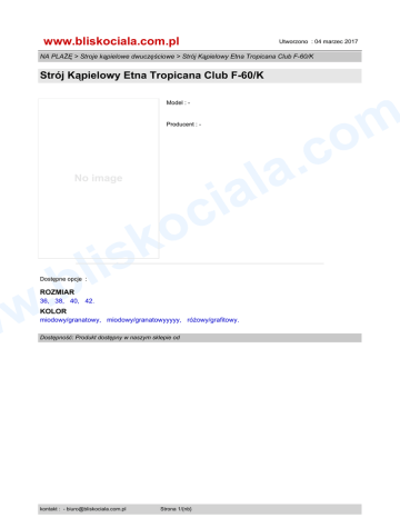 www.bliskociala.com.pl Utworzono : 04 marzec 2017 NA PLAŻĘ > Stroje kąpielowe dwuczęściowe > Strój Kąpielowy Etna Tropicana Club F-60/K Strój Kąpielowy Etna Tropicana Club F-60/K m o c . a l a Model : - Producent : - No image i c o k il s w b . w Dostępne opcje : ROZMIAR 36, 38, 40, 42. KOLOR miodowy/granatowy, miodowy/granatowyyyyy, różowy/grafitowy. Dostępność: Produkt dostępny w naszym sklepie od kontakt : - [email protected] Strona 1/{nb}
