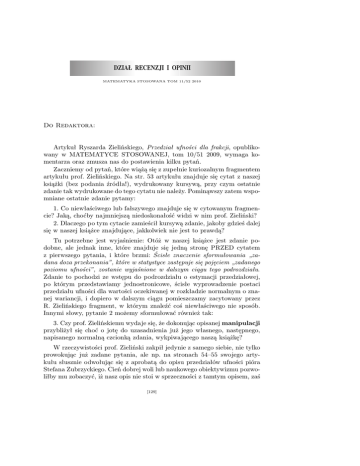 MATEMATYKA STOSOWANA TOM 11/52 2010 Do Redaktora: Artykuł Ryszarda Zielińskiego, Przedział ufności dla frakcji, opublikowany w MATEMATYCE STOSOWANEJ, tom 10/51 2009, wymaga komentarza oraz zmusza nas do postawienia kilku pytań. Zaczniemy od pytań, które wiążą się z zupełnie kuriozalnym fragmentem artykułu prof. Zielińskiego. Na str. 53 artykułu znajduje się cytat z naszej książki (bez podania źródła!), wydrukowany kursywą, przy czym ostatnie zdanie tak wydrukowane do tego cytatu nie należy. Pominąwszy zatem wspomniane ostatnie zdanie pytamy: 1. Co niewłaściwego lub fałszywego znajduje się w cytowanym fragmencie? Jaką, choćby najmniejszą niedoskonałość widzi w nim prof. Zieliński? 2. Dlaczego po tym cytacie zamieścił kursywą zdanie, jakoby gdzieś dalej się w naszej książce znajdujące, jakkolwiek nie jest to prawdą? Tu potrzebne jest wyjaśnienie: Otóż w naszej książce jest zdanie podobne, ale jednak inne, które znajduje się jedną stronę PRZED cytatem z pierwszego pytania, i które brzmi: Ścisłe znaczenie sformułowania „zadana doza przekonania”, które w statystyce zastępuje się pojęciem „zadanego poziomu ufności”, zostanie wyjaśnione w dalszym ciągu tego podrozdziału. Zdanie to pochodzi ze wstępu do podrozdziału o estymacji przedziałowej, po którym przedstawiamy jednostronicowe, ścisłe wyprowadzenie postaci przedziału ufności dla wartości oczekiwanej w rozkładzie normalnym o znanej wariancji, i dopiero w dalszym ciągu pomieszczamy zacytowany przez R. Zielińskiego fragment, w którym znaleźć coś niewłaściwego nie sposób. Innymi słowy, pytanie 2 możemy sformułować również tak: 3. Czy prof. Zielińskiemu wydaje się, że dokonując opisanej manipulacji przybliżył się choć o jotę do uzasadnienia już jego własnego, następnego, napisanego normalną czcionką zdania, wykpiwającego naszą książkę? W rzeczywistości prof. Zieliński zakpił jedynie z samego siebie, nie tylko prowokując już zadane pytania, ale np. na stronach 54–55 swojego artykułu słusznie odwołując się z aprobatą do opisu przedziałów ufności pióra Stefana Zubrzyckiego. Cień dobrej woli lub naukowego obiektywizmu pozwoliłby mu zobaczyć, iż nasz opis nie stoi w sprzeczności z tamtym opisem, zaś [129] 130 J. Koronacki i J. Mielniczuk nasz rysunek 3.6 jest dobrym odpowiednikiem rysunku Zubrzyckiego (rys. 1 w artykule Zielińskiego), tyle że na naszym rysunku zarówno unikamy symbolicznego przedstawienia próby losowej za pomocą jednej osi w układzie kartezjańskim, jak i z góry zadajemy sposób konstrukcji zbioru Zubrzyckiego Sθ . Zobaczyłby również, że nasz opis nie jest dydaktycznie gorszy, chociaż – mocą naszej świadomej decyzji – jest mniej ogólny. I ostatnie pytanie, dotyczące pewnej kwestii szczegółowej: 4. Dlaczego kwantyfikowana reguła kciuka, zawarta np. w książce Koronackiego i Mielniczuka, została nazwana oryginalną (str. 63 artykułu Zielińskiego)? O jaką inną bajkę chodzi R. Zielińskiemu (str. 53)? Od czasu pierwszego wydania naszego podręcznika odebraliśmy wiele komentarzy i uwag dotyczących jego treści. To również ta przyjazna krytyka spowodowała, że podręcznik stał się jeszcze lepszy i jego łączny nakład przekroczył 4000 egzemplarzy (wydania z lat 2001, 2004, 2006, 2009). Natomiast krytyka R. Zielińskiego jest zaprzeczeniem krytyki konstruktywnej i na pewno nie przyczyni się do poprawienia zawartości merytorycznej książki. Na koniec komentarz, dotyczący wreszcie problemu rzeczywistego: Ryszard Zieliński uważa, że gwarantowany poziom ufności jest warunkiem sine qua non w teorii estymacji przedziałowej i opowiada się za stosowaniem przedziałów Neymana-Cloppera-Pearsona. Z całą mocą odrzuca możliwość konstrukcji przedziałów, których poziom ufności tylko w przybliżeniu odpowiada poziomowi nominalnemu. W swojej argumentacji abstrahuje od dwóch problemów – długości otrzymywanych przedziałów oraz tego jak bardzo „poziom gwarantowany” może przewyższać poziom nominalny. Jego badania symulacyjne nie mówią nic o pierwszym problemie, ale wiele o drugim. Niżej podpisani są mu wdzięczni za te badania symulacyjne, które – ich zdaniem – są dobrym argumentem za dalszym stosowaniem asymptotycznych przedziałów ufności (czytaj przedziałów o przybliżonym poziomie ufności), gdy liczność próby jest dostatecznie duża w porównaniu z wartością prawdopodobieństwa sukcesu w pojedynczym doświadczeniu Bernoulliego. Przytoczmy również zdanie z artykułu Browna i innych (Statistical Science 16 (2001), str. 113), nota bene artykułu cytowanego przez R. Zielińskiego, przeciwko stosowaniu przedziałów Neymana-Cloppera-Pearsona: The Clopper-Pearson interval is wastefully conservative and is not a good choice for practical use unless strict adherence to the prescription C(p, n) > 1 − α is demanded. Even then better exact methods are available ... (C(p, n) oznacza tu prawdopodobieństwo pokrycia dla prawdopodobieństwa sukcesu p i liczności n). Do Redaktora Jacek Koronacki i Jan Mielniczuk Instytut Podstaw Informatyki PAN ul. J.K. Ordona 21 01-237 Warszawa E-mail: [email protected] i [email protected] (wpłynęło 22 stycznia 2010 r.) 131