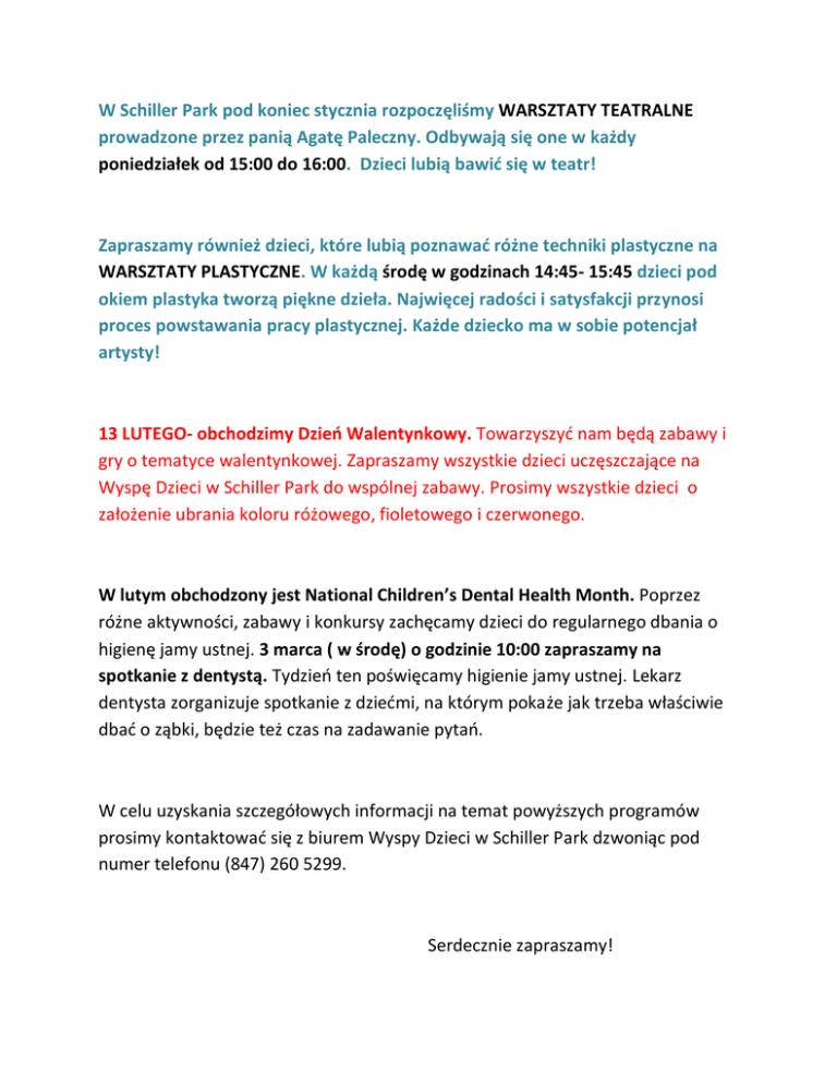 W Schiller Park pod koniec stycznia rozpoczęliśmy WARSZTATY TEATRALNE prowadzone przez panią Agatę Paleczny. Odbywają się one w każdy poniedziałek od 15:00 do 16:00. Dzieci lubią bawić się w teatr! Zapraszamy również dzieci, które lubią poznawać różne techniki plastyczne na WARSZTATY PLASTYCZNE. W każdą środę w godzinach 14:45- 15:45 dzieci pod okiem plastyka tworzą piękne dzieła. Najwięcej radości i satysfakcji przynosi proces powstawania pracy plastycznej. Każde dziecko ma w sobie potencjał artysty! 13 LUTEGO- obchodzimy Dzień Walentynkowy. Towarzyszyć nam będą zabawy i gry o tematyce walentynkowej. Zapraszamy wszystkie dzieci uczęszczające na Wyspę Dzieci w Schiller Park do wspólnej zabawy. Prosimy wszystkie dzieci o założenie ubrania koloru różowego, fioletowego i czerwonego. W lutym obchodzony jest National Children’s Dental Health Month. Poprzez różne aktywności, zabawy i konkursy zachęcamy dzieci do regularnego dbania o higienę jamy ustnej. 3 marca ( w środę) o godzinie 10:00 zapraszamy na spotkanie z dentystą. Tydzień ten poświęcamy higienie jamy ustnej. Lekarz dentysta zorganizuje spotkanie z dziećmi, na którym pokaże jak trzeba właściwie dbać o ząbki, będzie też czas na zadawanie pytań. W celu uzyskania szczegółowych informacji na temat powyższych programów prosimy kontaktować się z biurem Wyspy Dzieci w Schiller Park dzwoniąc pod numer telefonu (847) 260 5299. Serdecznie zapraszamy!
