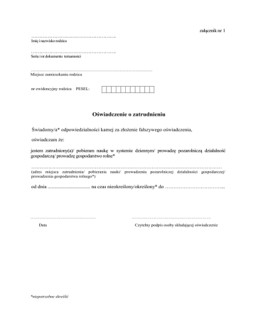 załącznik nr 1 ……………………………………………. Imię i nazwisko rodzica ……………………………………………. Seria i nr dokumentu tożsamości …………………………………………………………………………. Miejsce zamieszkania rodzica nr ewidencyjny rodzica PESEL: Oświadczenie o zatrudnieniu Świadomy/a* odpowiedzialności karnej za złożenie fałszywego oświadczenia, oświadczam że: jestem zatrudniony(a)/ pobieram naukę w systemie dziennym/ prowadzę pozarolniczą działalność gospodarczą/ prowadzę gospodarstwo rolne* ………………………………………………………………………………………………… (adres miejsca zatrudnienia/ pobierania nauki/ prowadzenia pozarolniczej działalności gospodarczej/ prowadzenia gospodarstwa rolnego*) od dnia ................................. na czas nieokreślony/określony* do ……………………………... …………………………………………………. Data *niepotrzebne skreślić ……………………………………………………………. Czytelny podpis osoby składającej oświadczenie